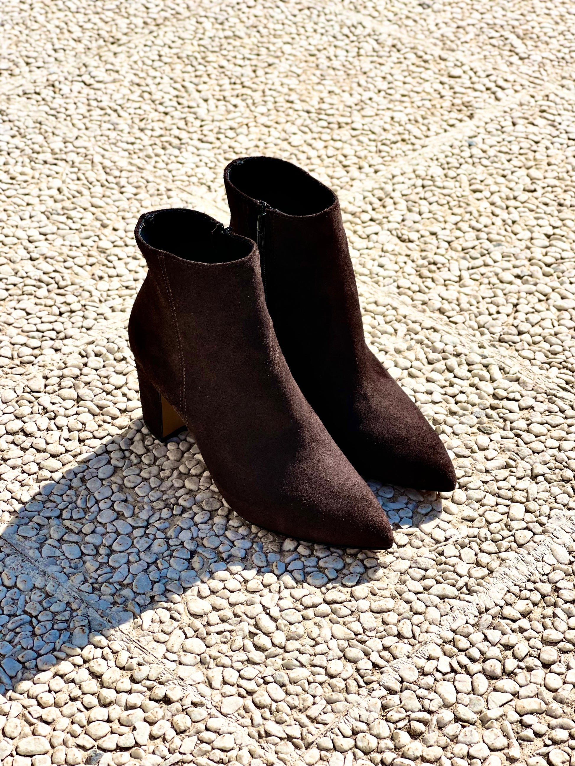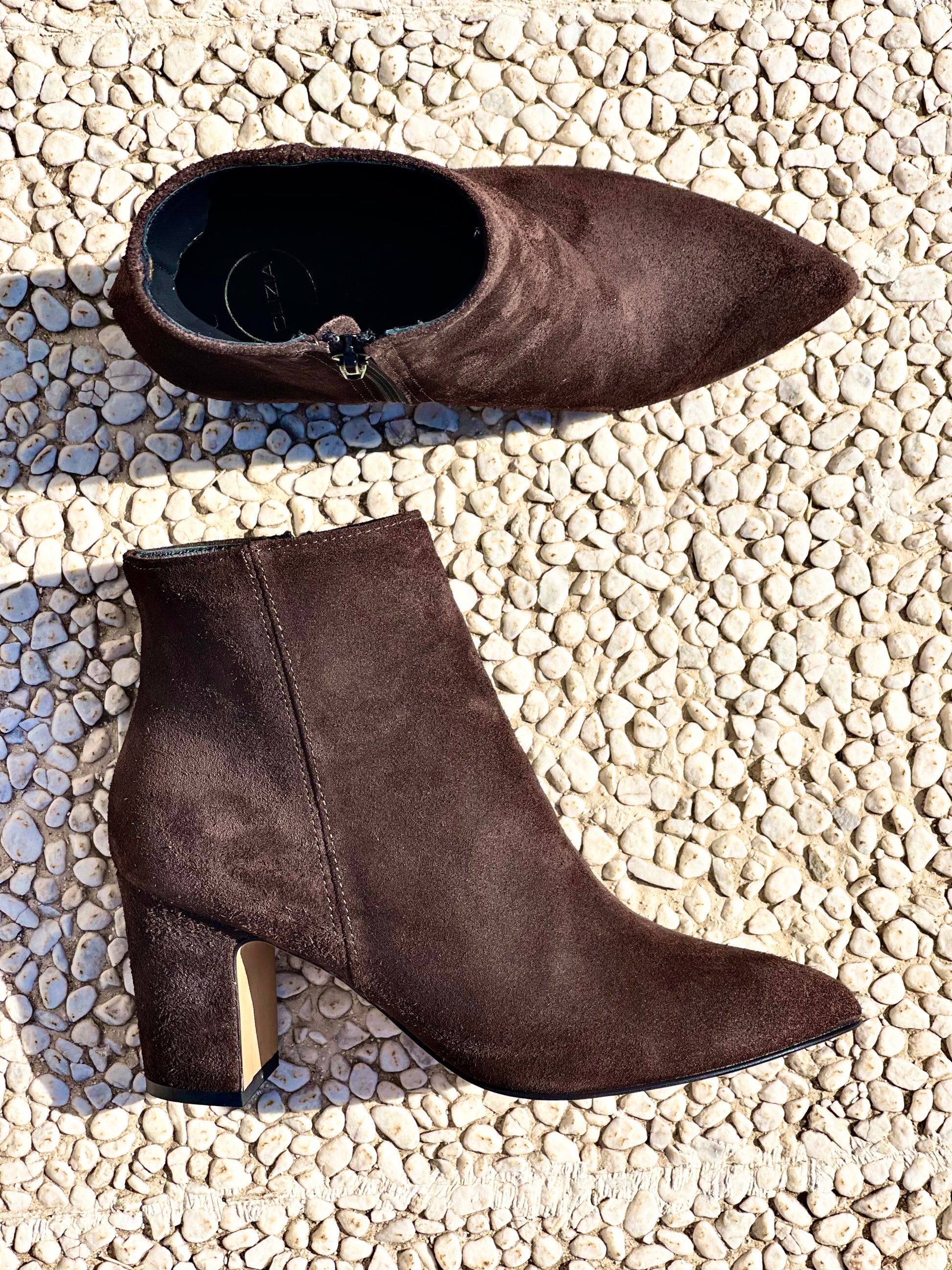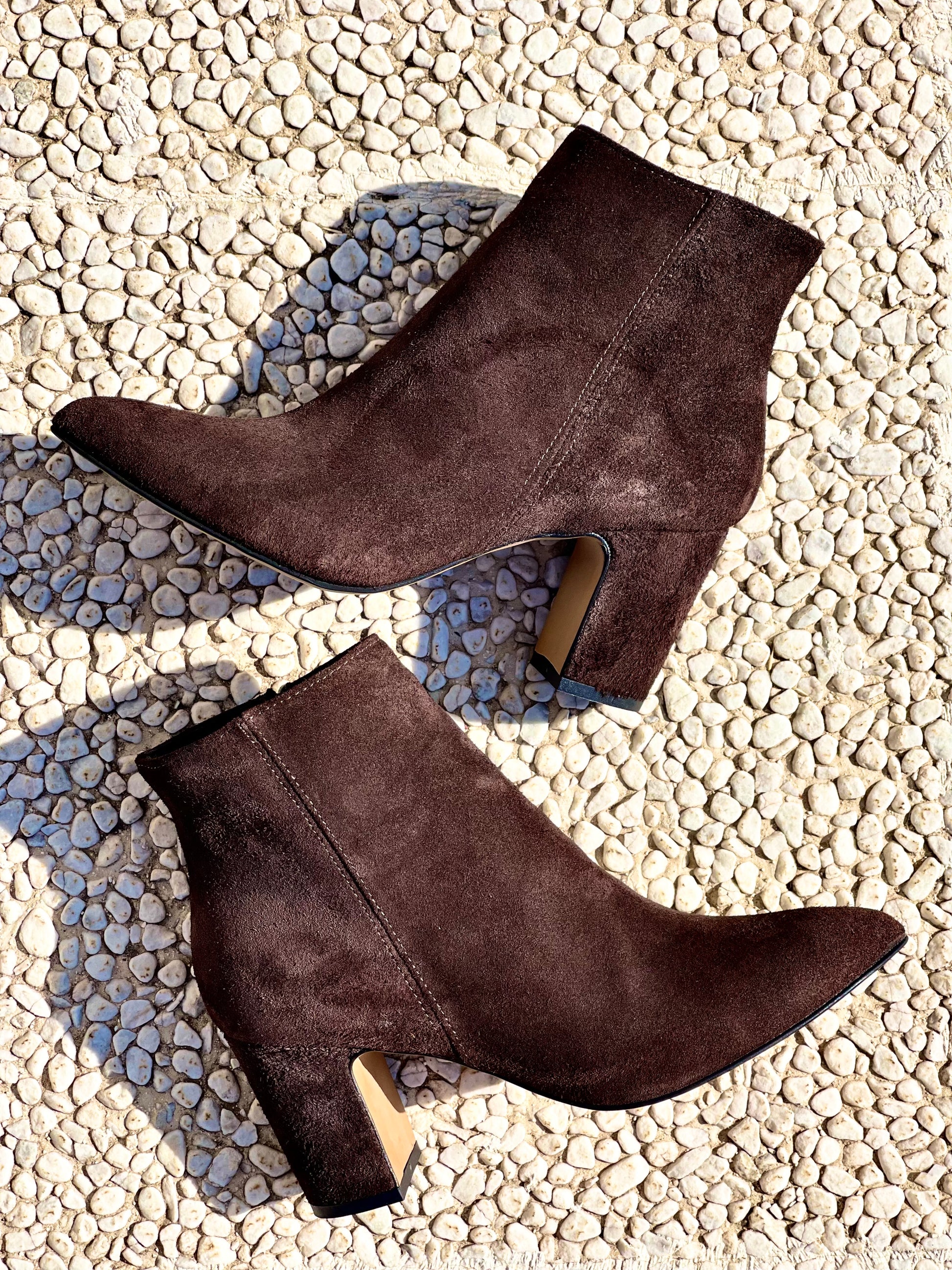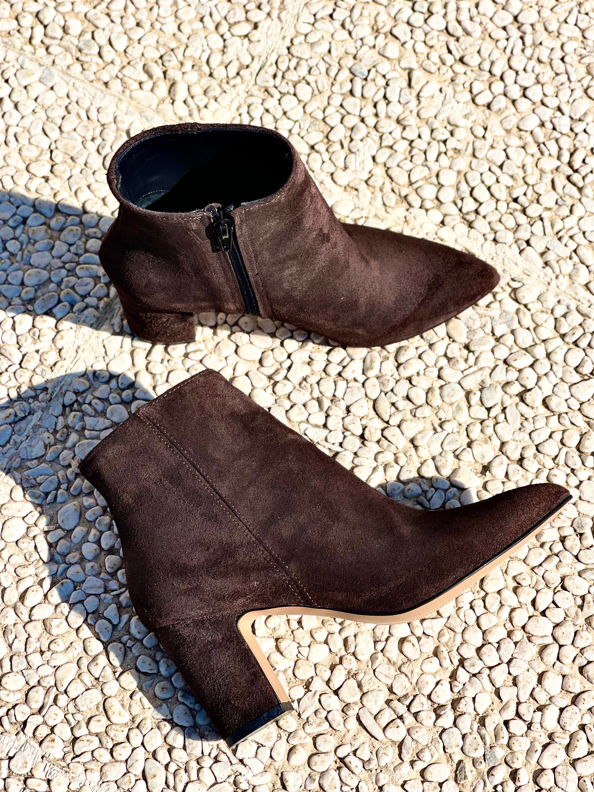 Μποτάκι με μυτερή μύτη από καμηλό δέρμα και φαρδύ τακούνι 75 mm.