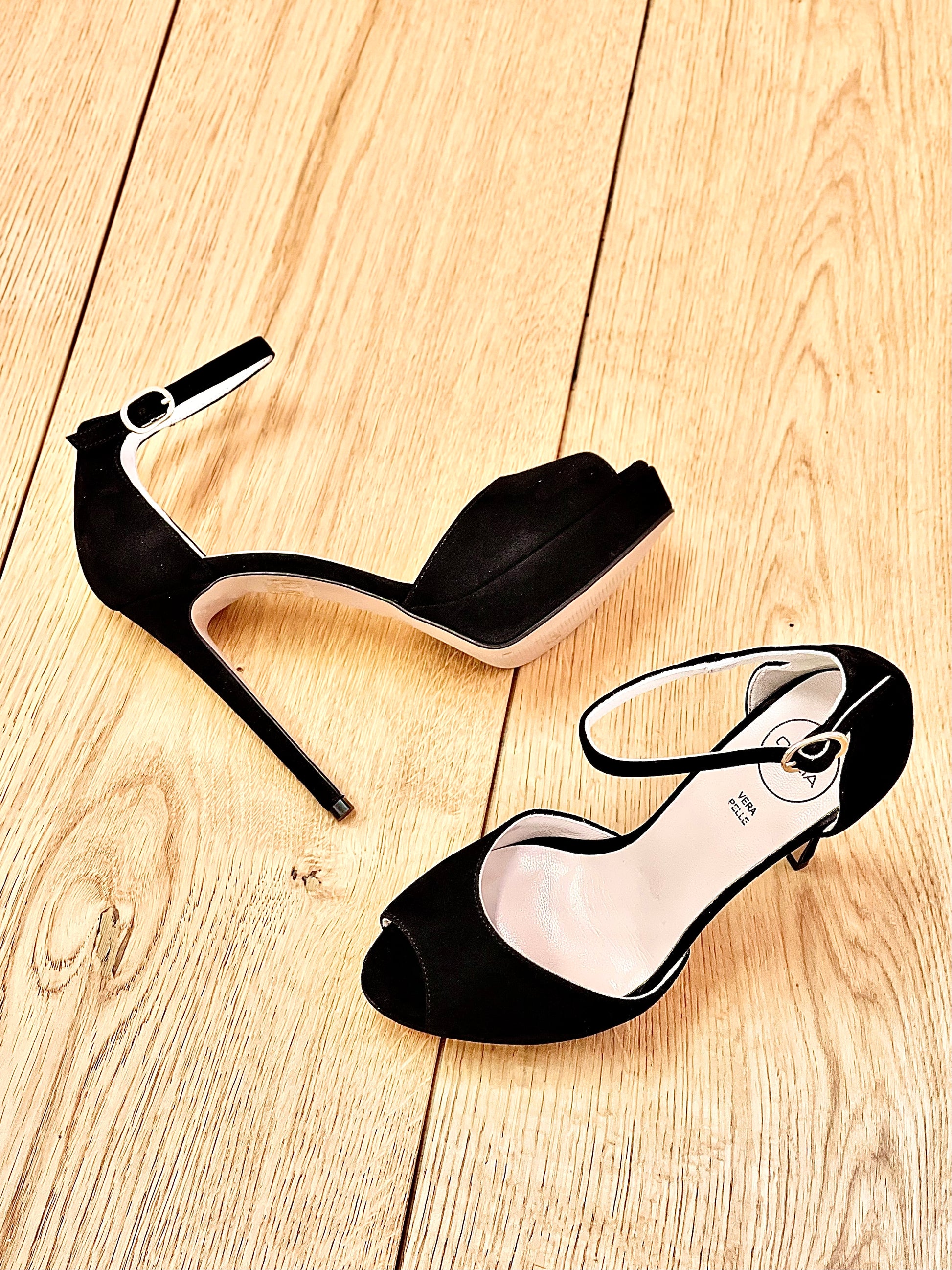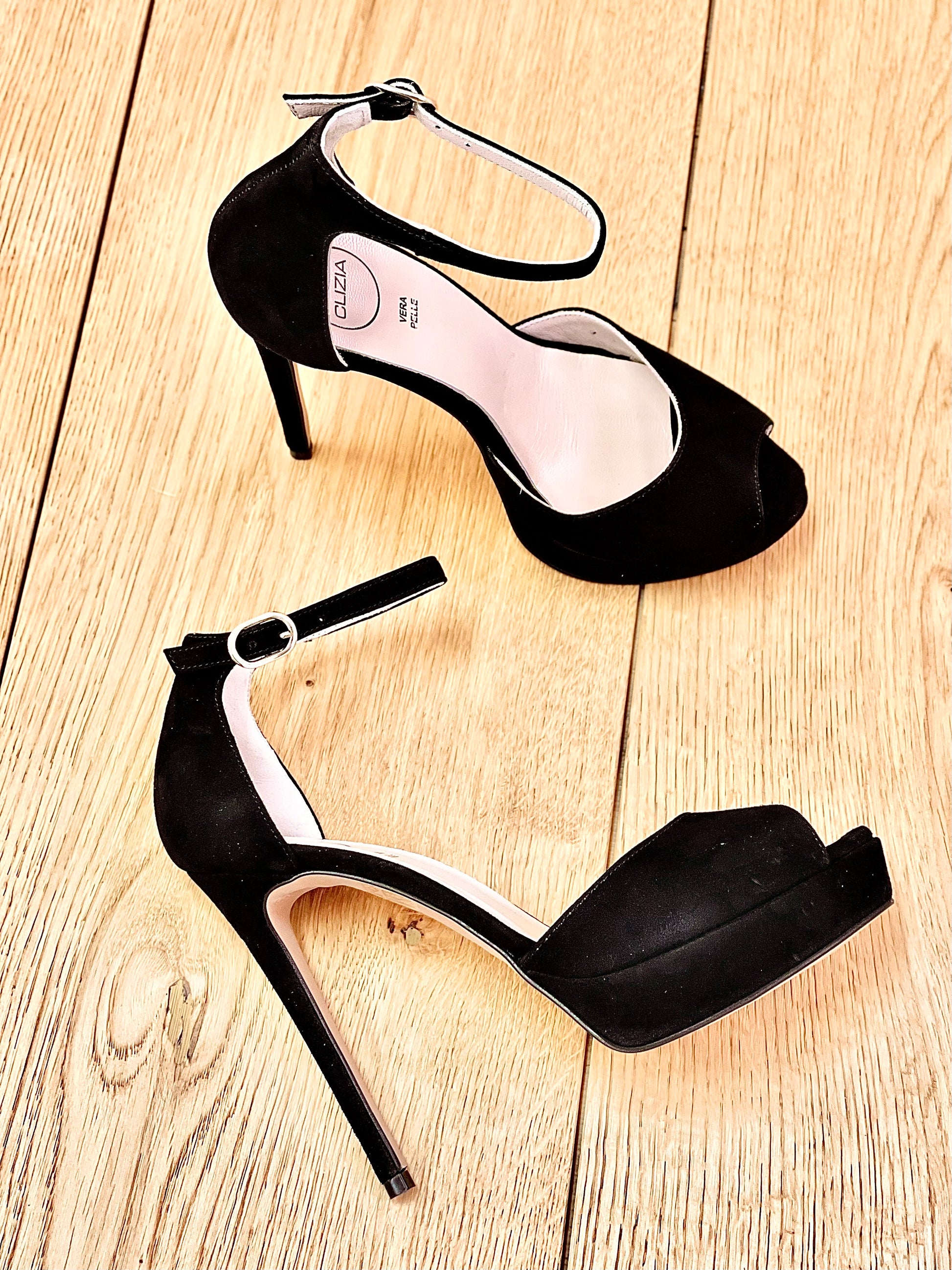 Σανδάλια με μύτη και τακούνι από καμηλό, τακούνι ύψους 12 cm και πλατφόρμα 2 cm.