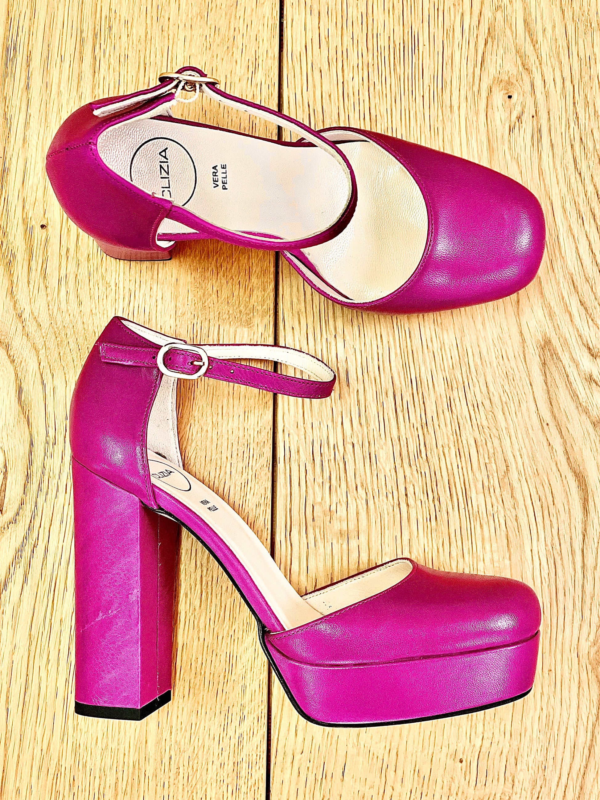 Γόβες με μύτη και ημικυκλικό τακούνι από δέρμα, τακούνι 12 cm και πλατφόρμα 3 cm.