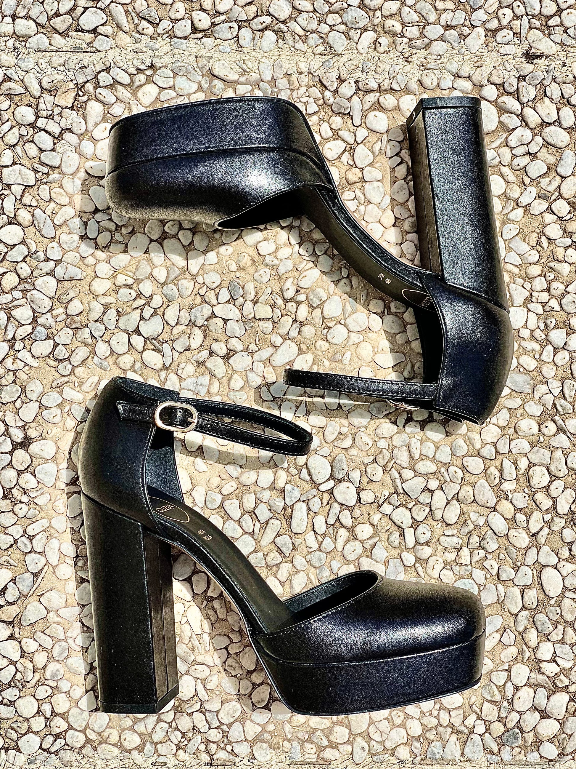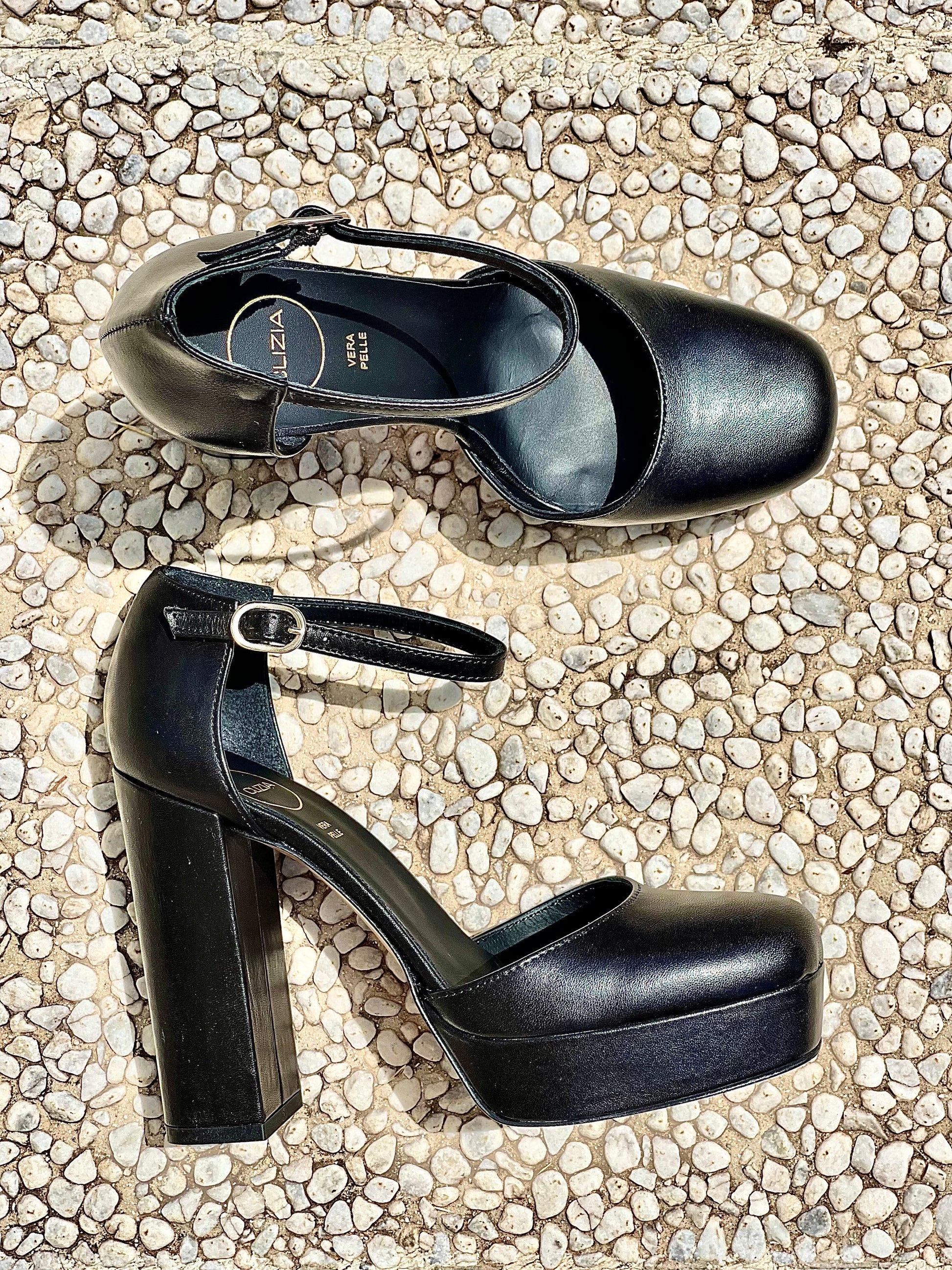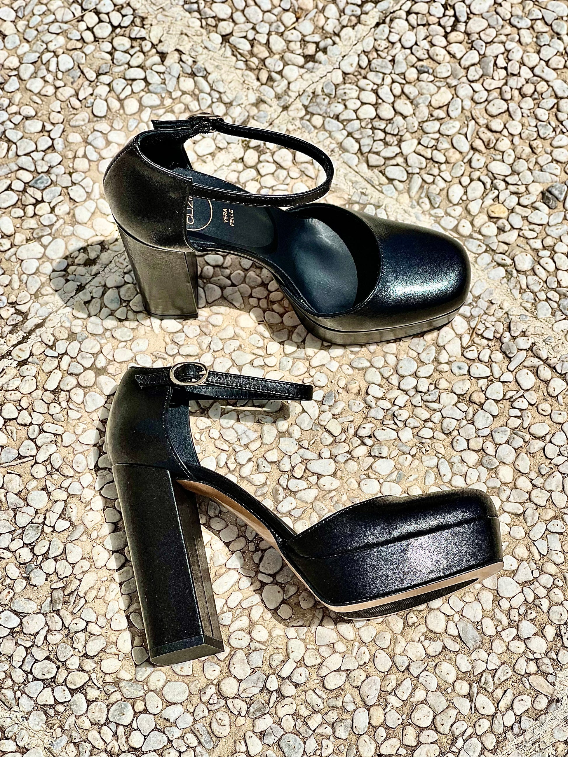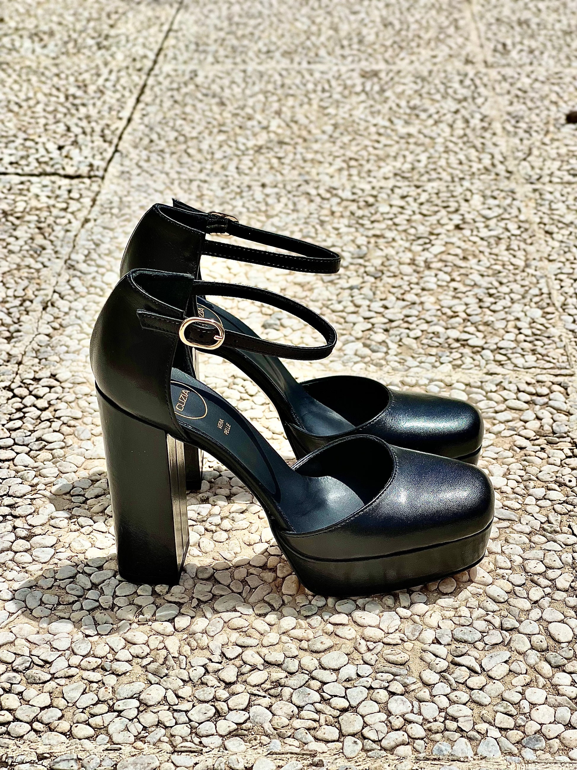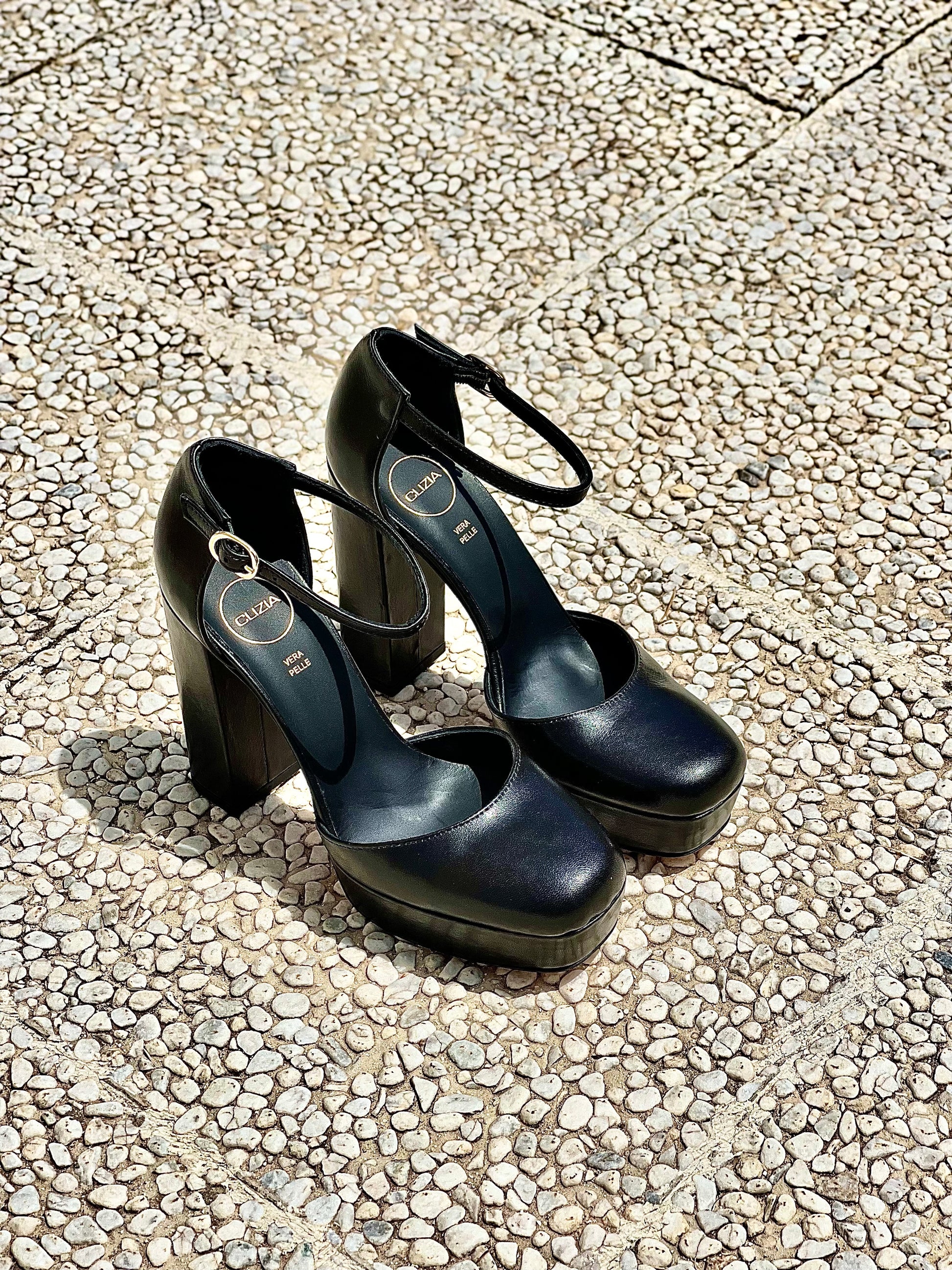 Γόβες με μύτη και ημικυκλικό τακούνι από δέρμα, τακούνι 12 cm και πλατφόρμα 3 cm.