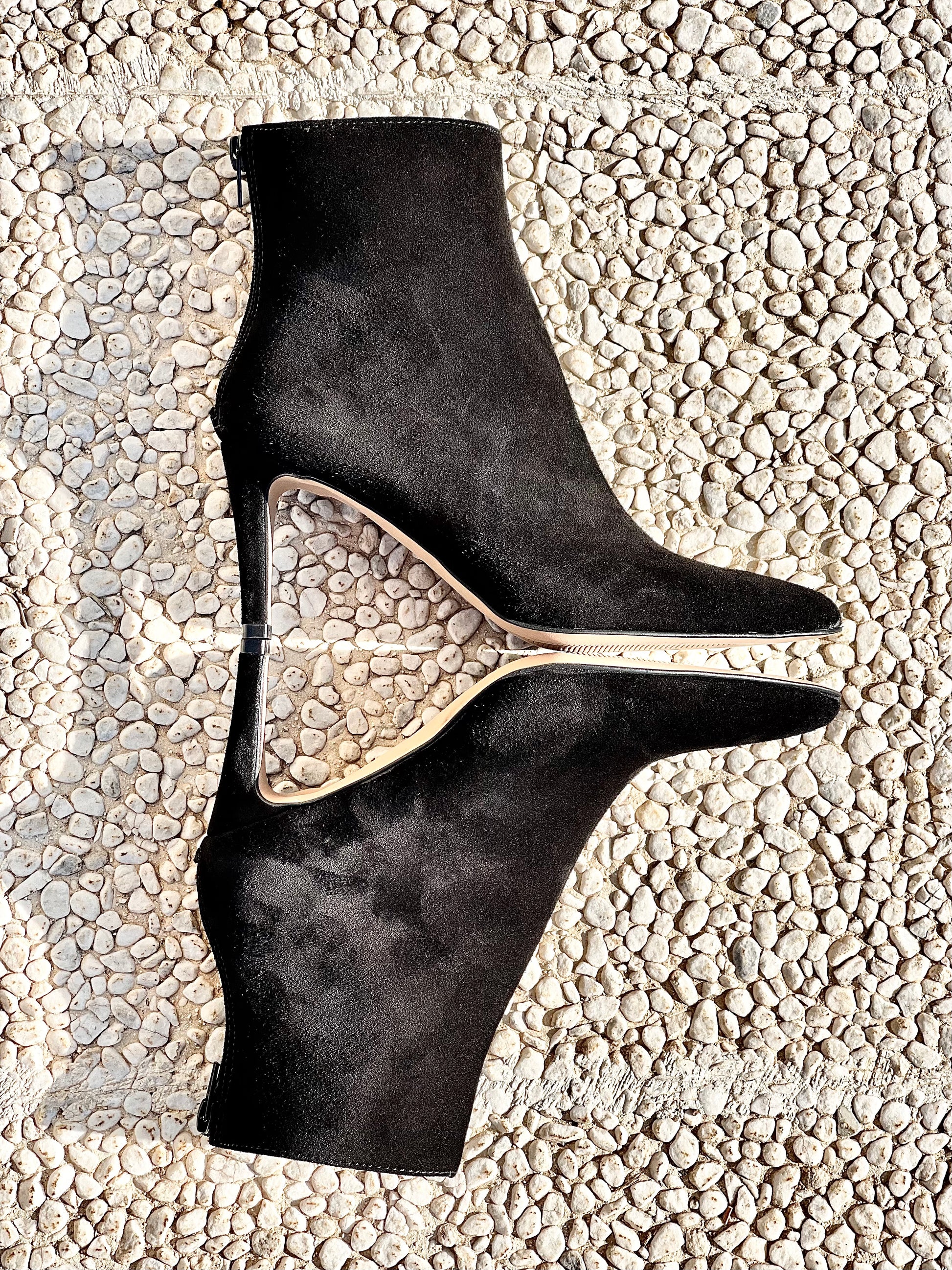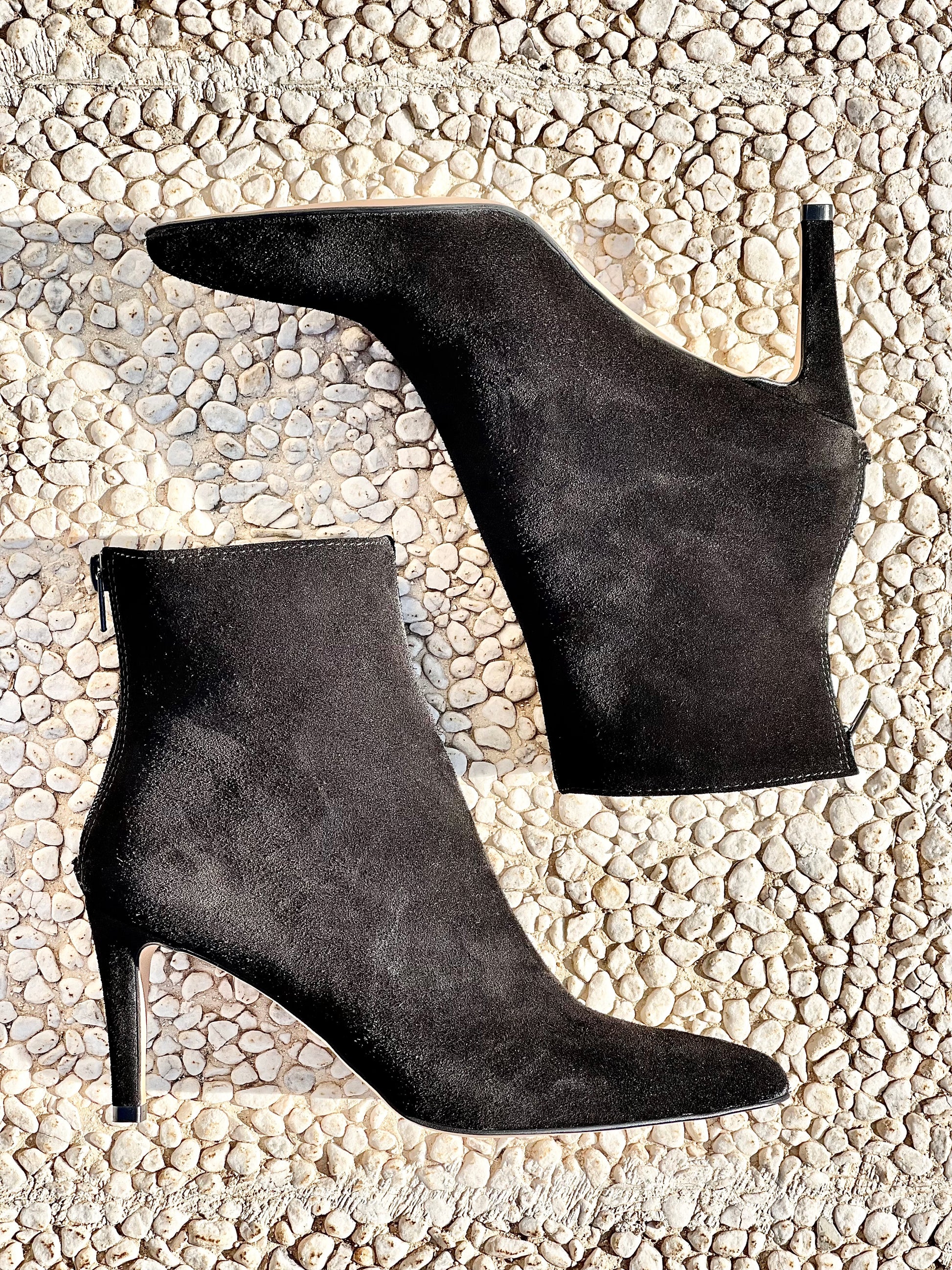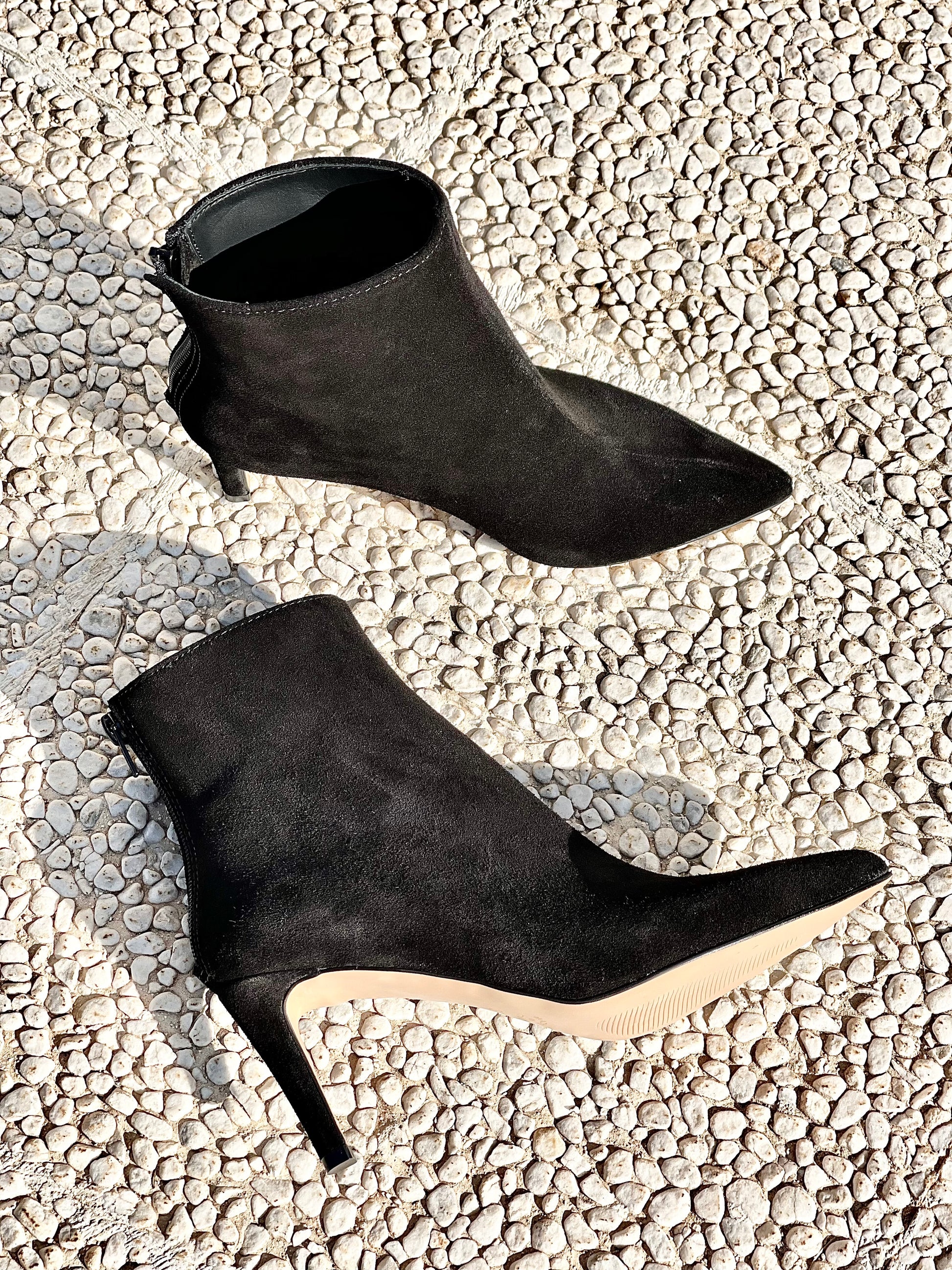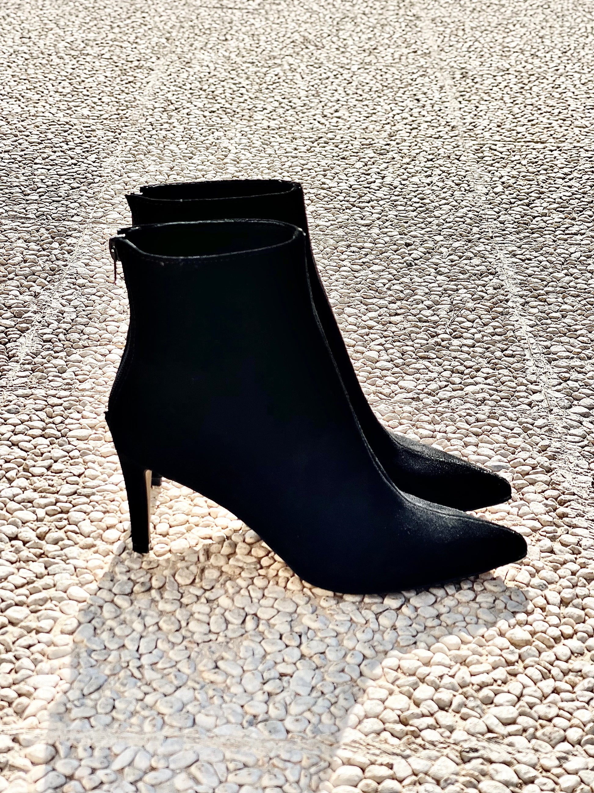 Μποτάκι με μυτερή μύτη από καμηλό, τακούνι στιλέτο και φερμουάρ στο πίσω μέρος.