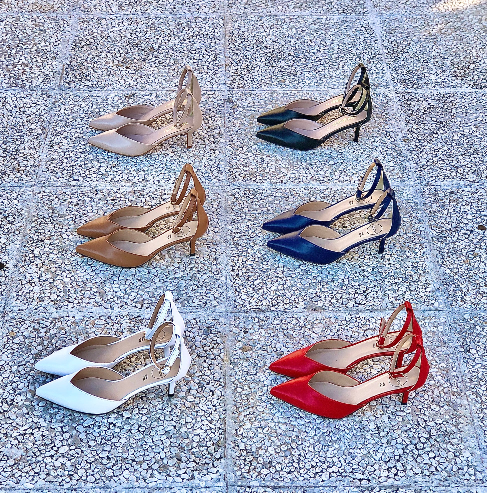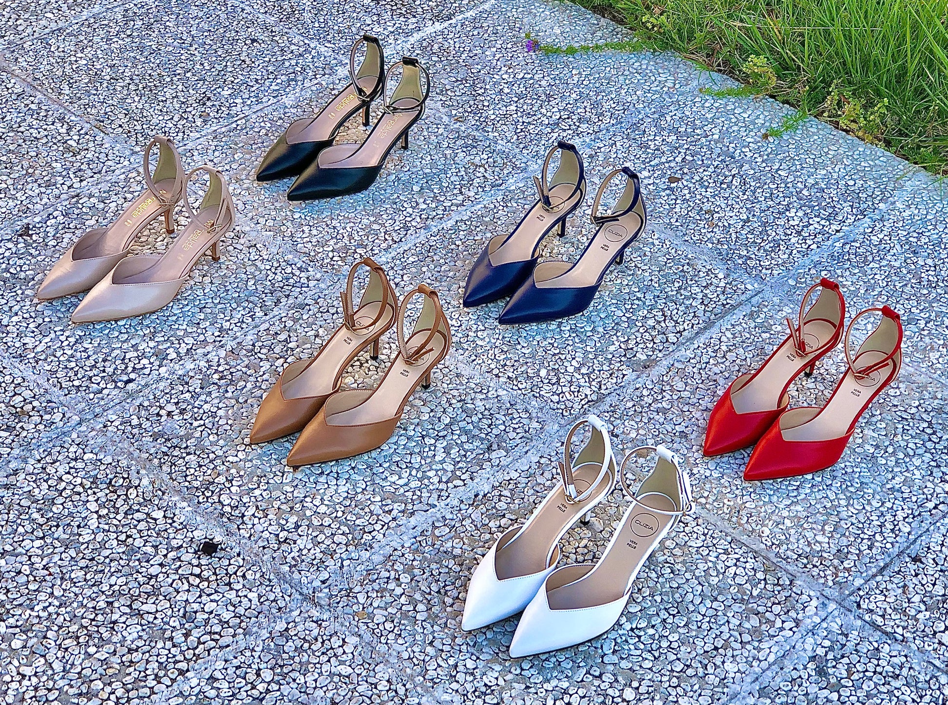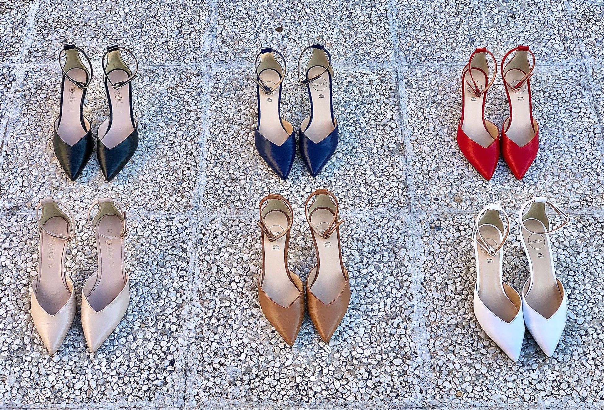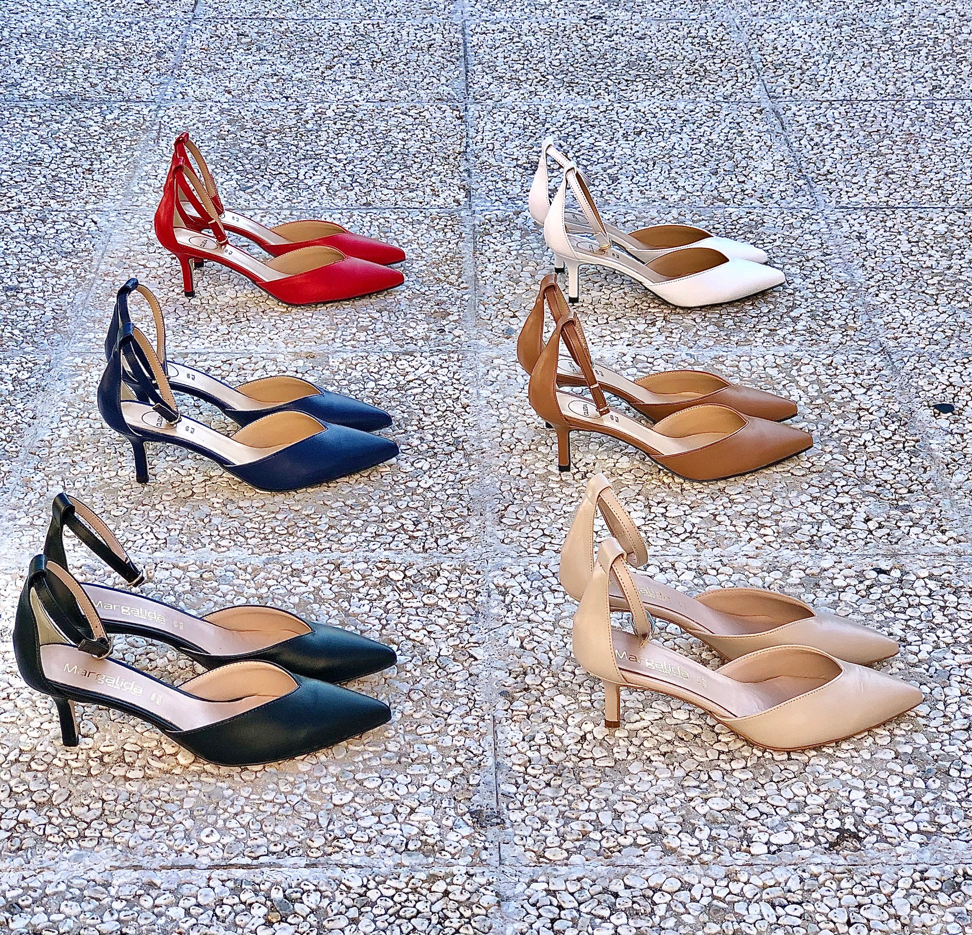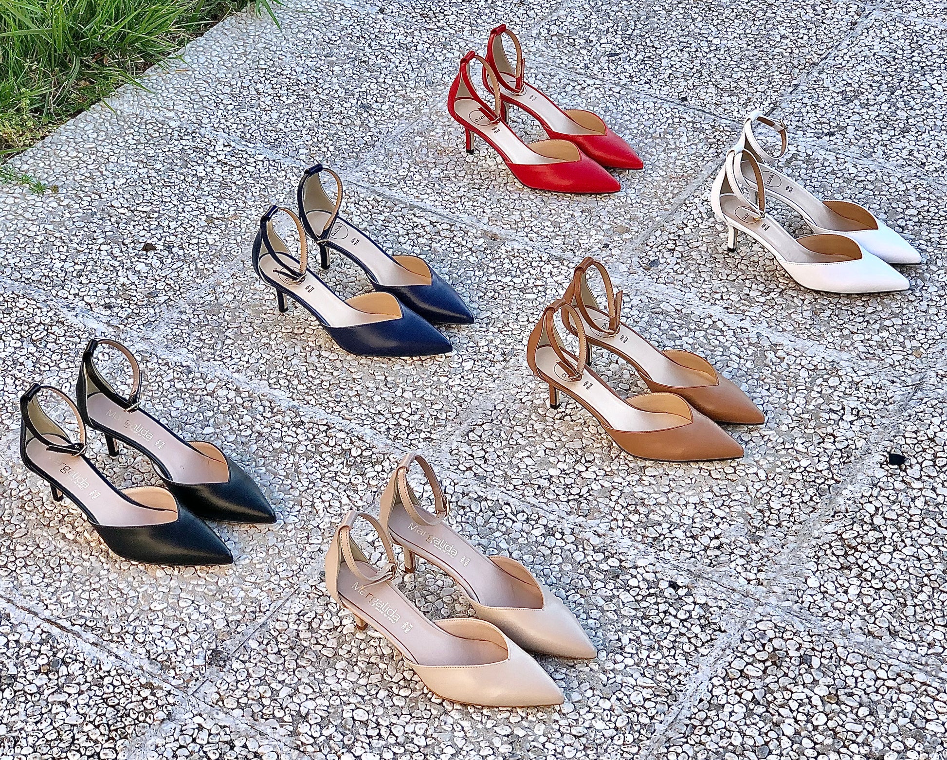 Γόβες με μυτερή μύτη και χαμηλό τακούνι, V λαιμόκοψη, λουράκι στον αστράγαλο και τακούνι ύψους 6 εκ.