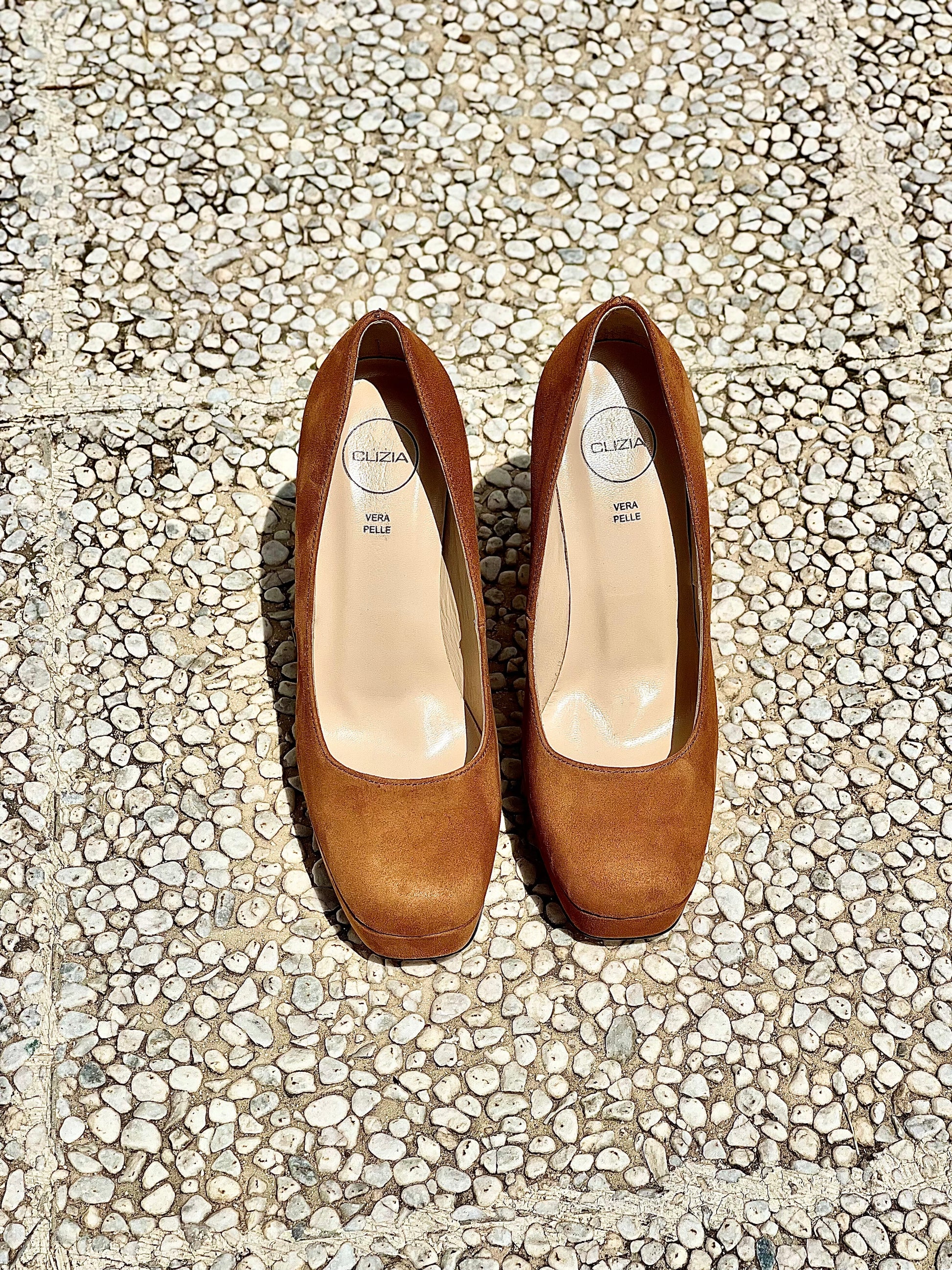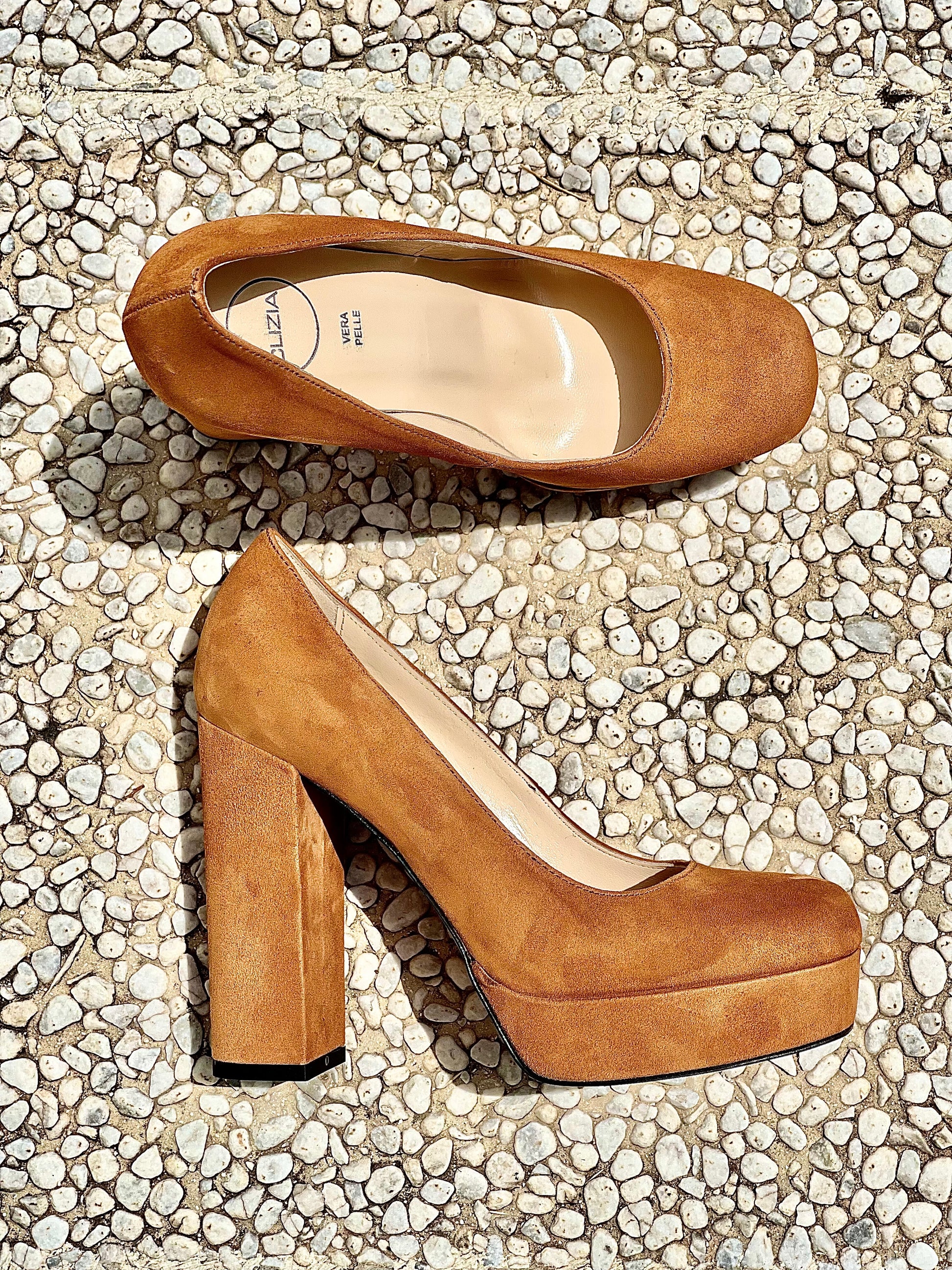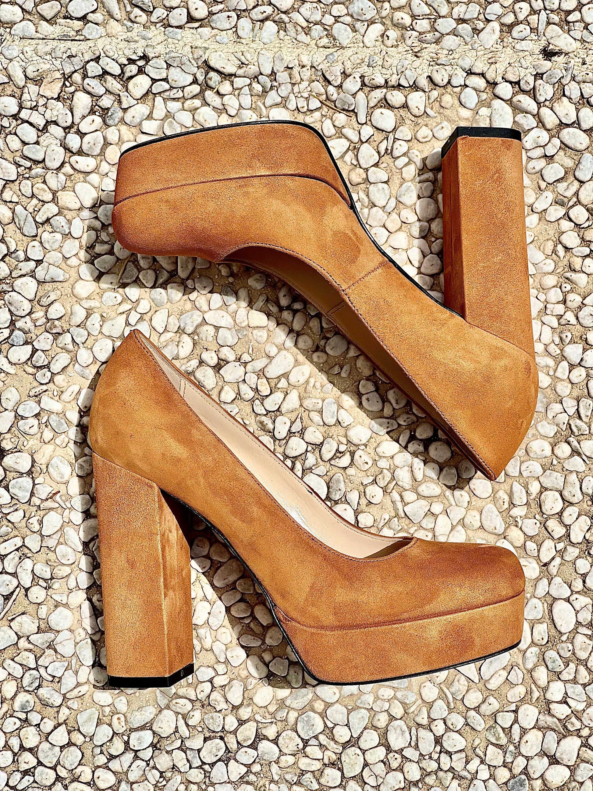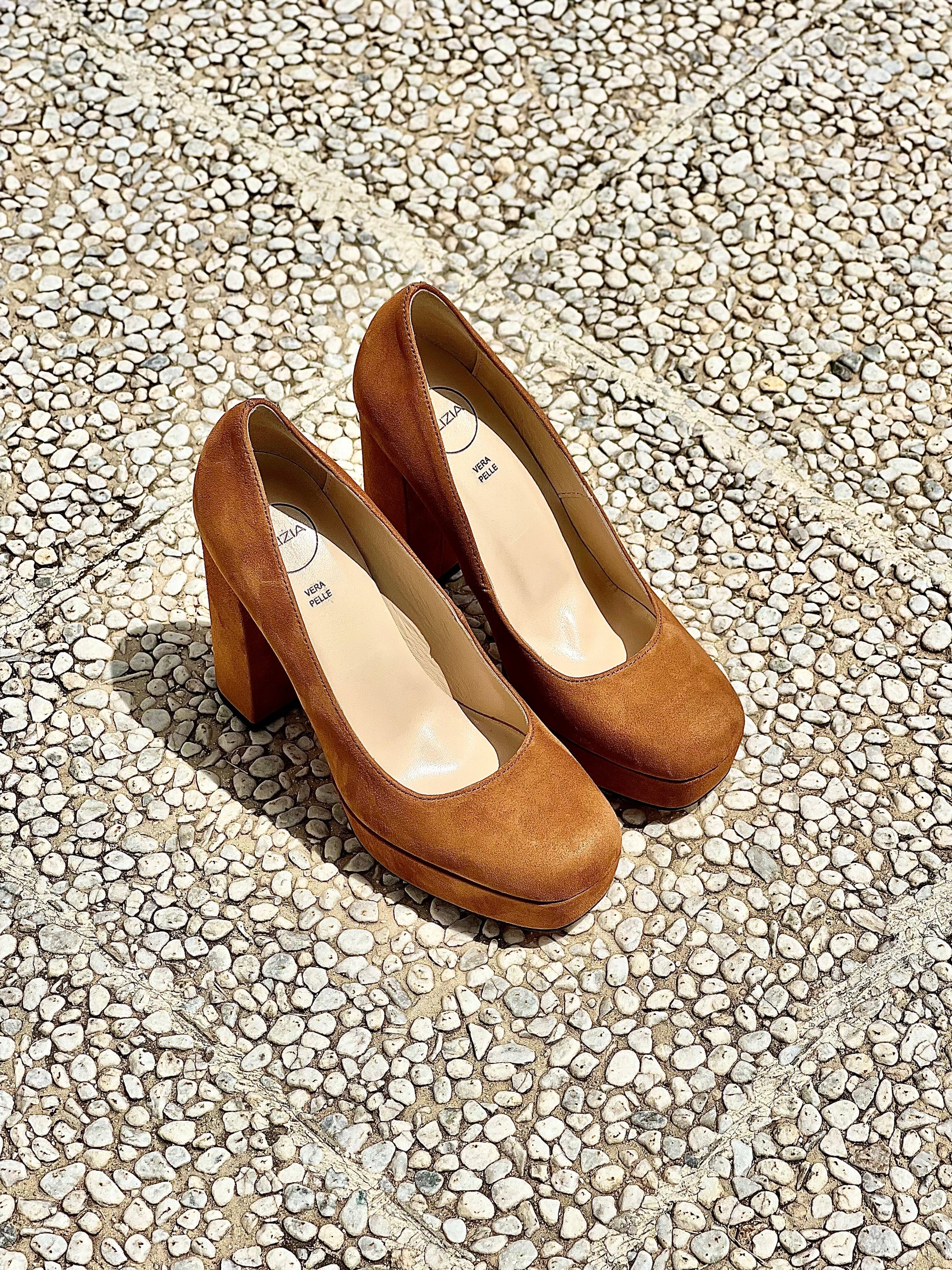 Γόβες με ημικυκλική μύτη από σουέτ, τακούνι 12 cm και πλατφόρμα 3 cm.