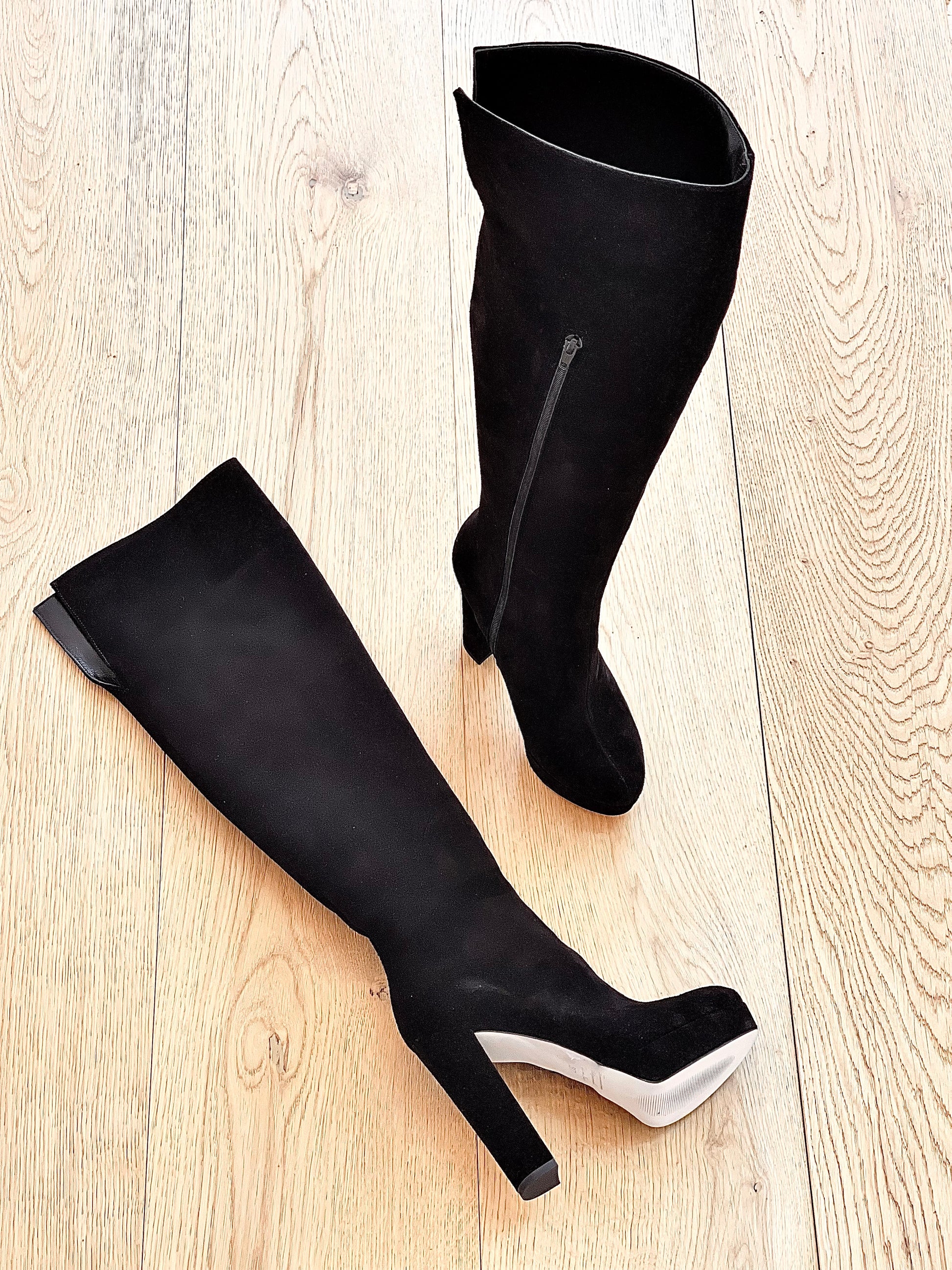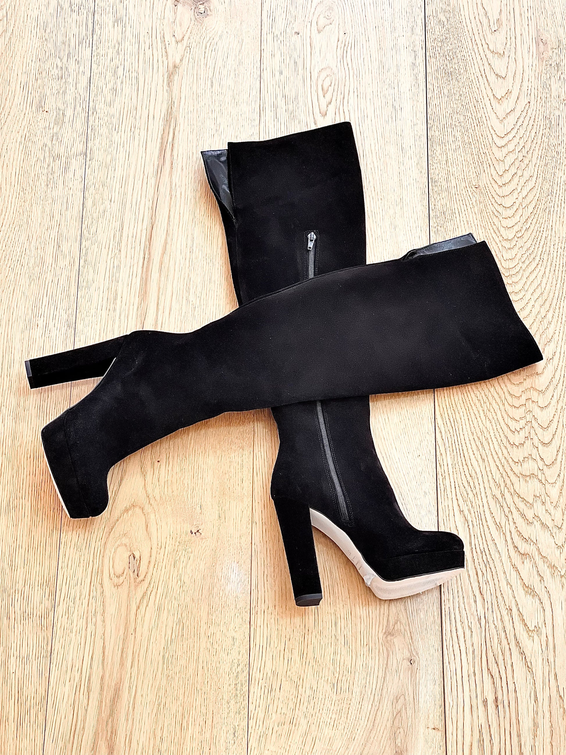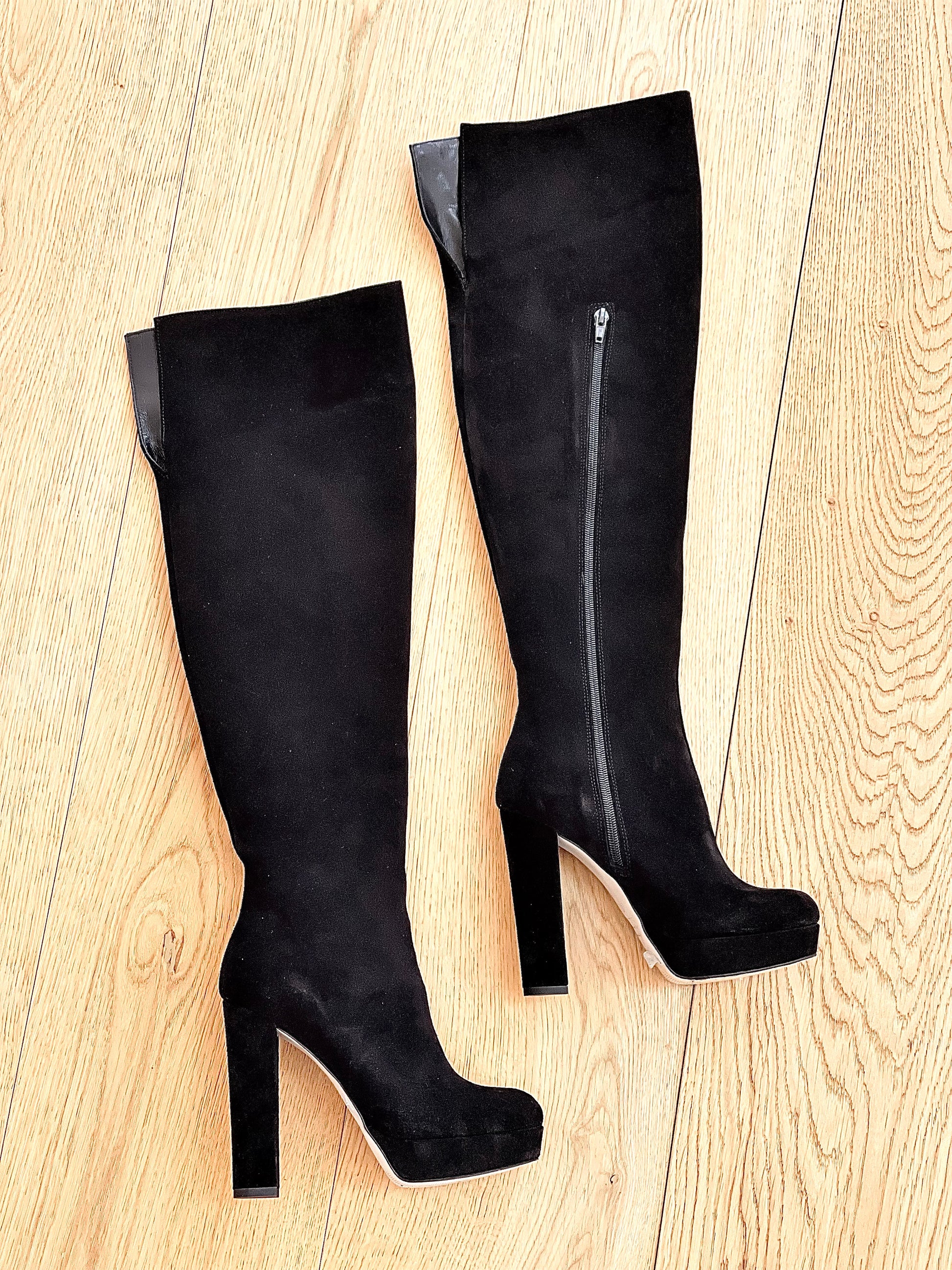 Μπότες πάνω από το γόνατο με στρογγυλή μύτη, από σουέτ, με φαρδύ τακούνι και πλατφόρμα.