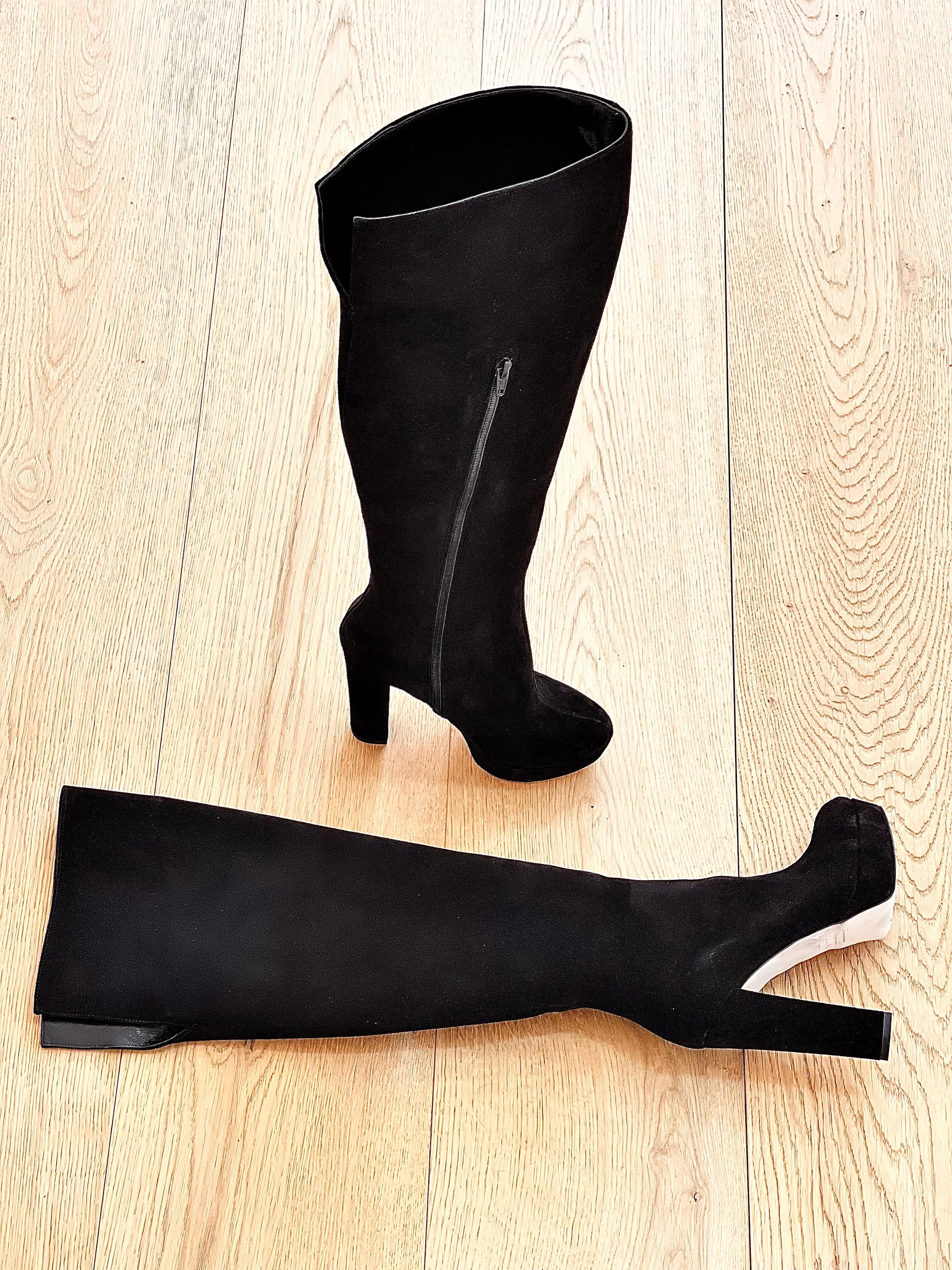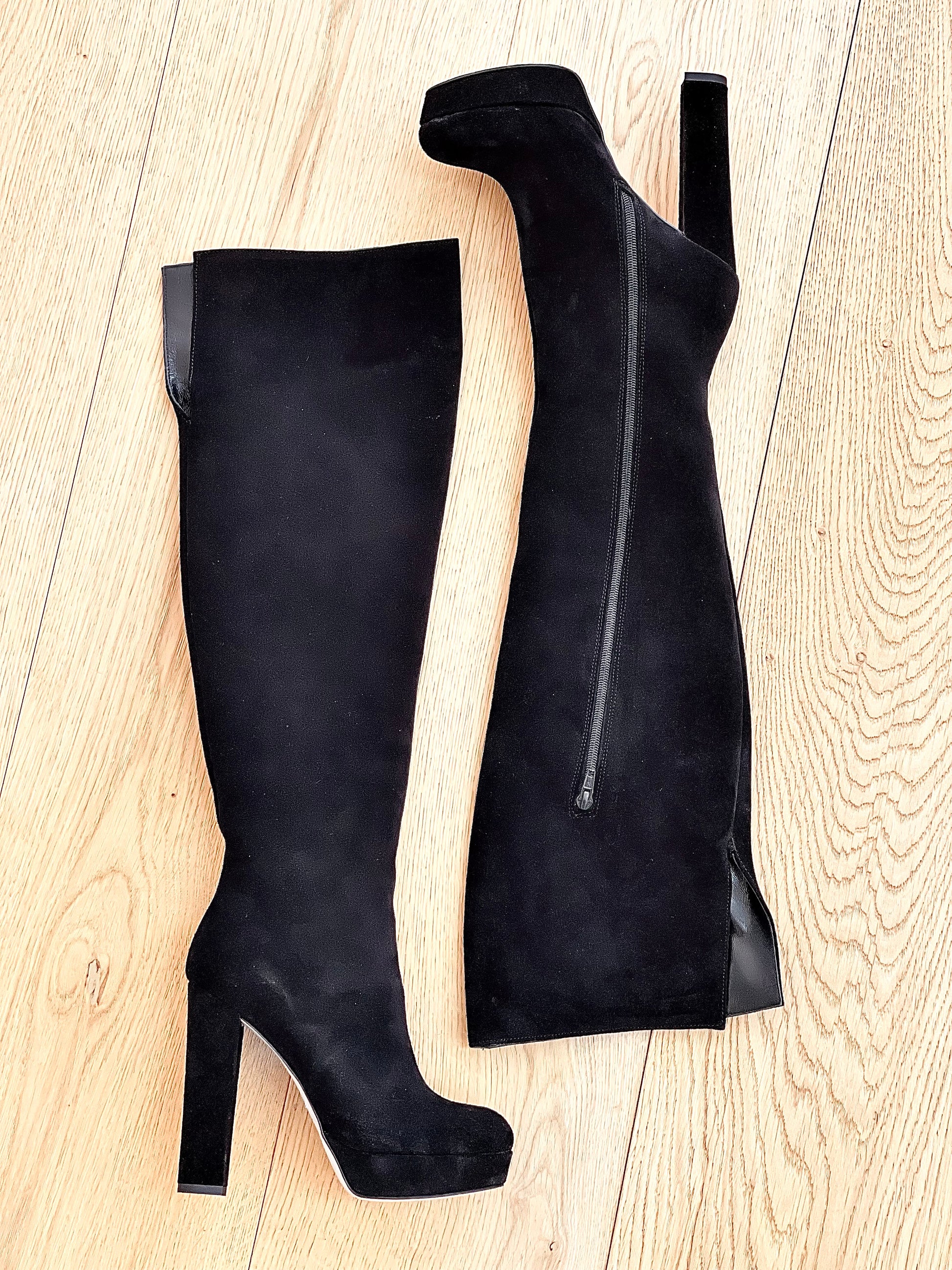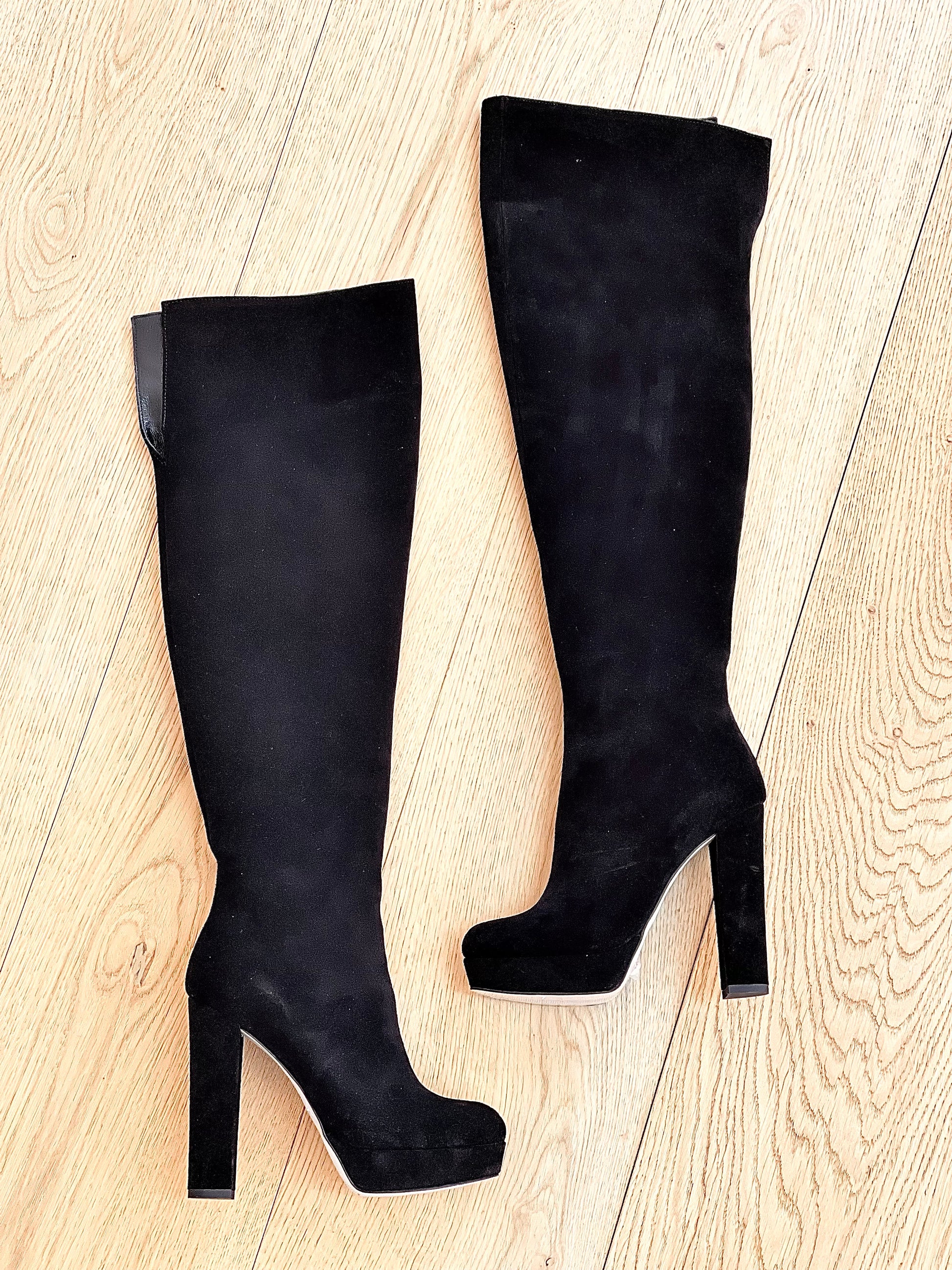 Μπότες πάνω από το γόνατο με στρογγυλή μύτη, από σουέτ, με φαρδύ τακούνι και πλατφόρμα.