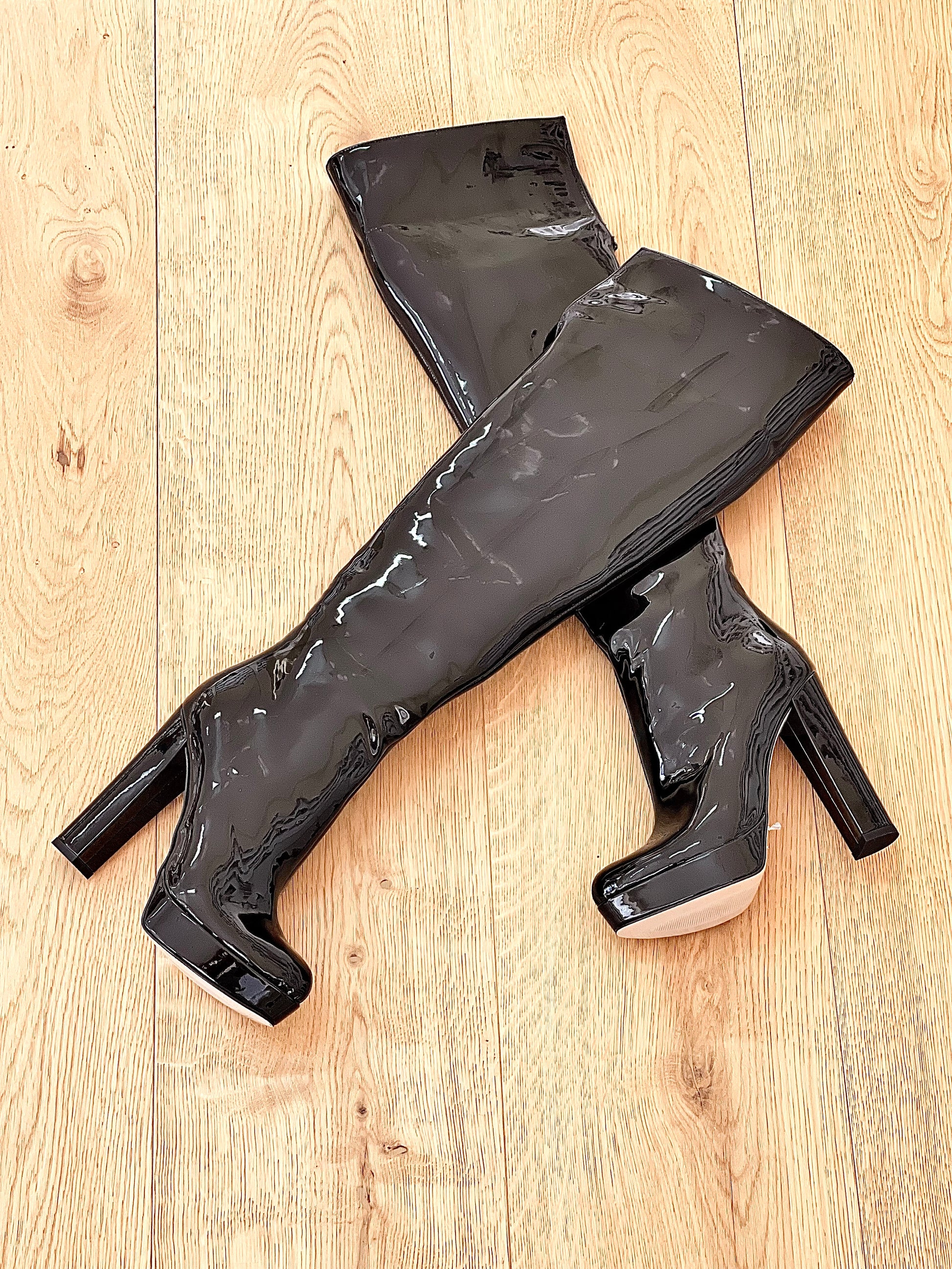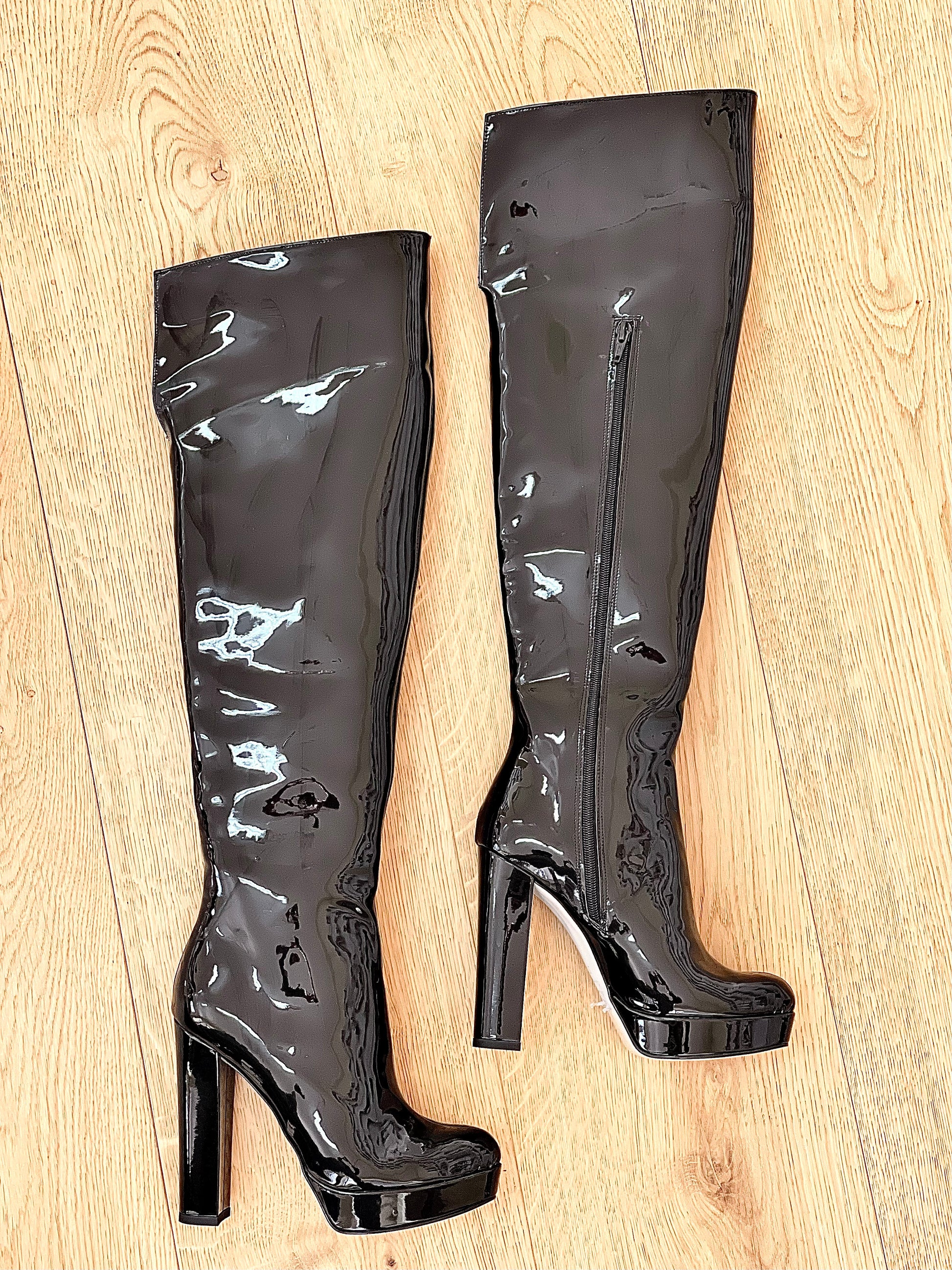 Μπότες πάνω από το γόνατο με στρογγυλή μύτη, από βερνίκι, με φαρδύ τακούνι και πλατφόρμα.