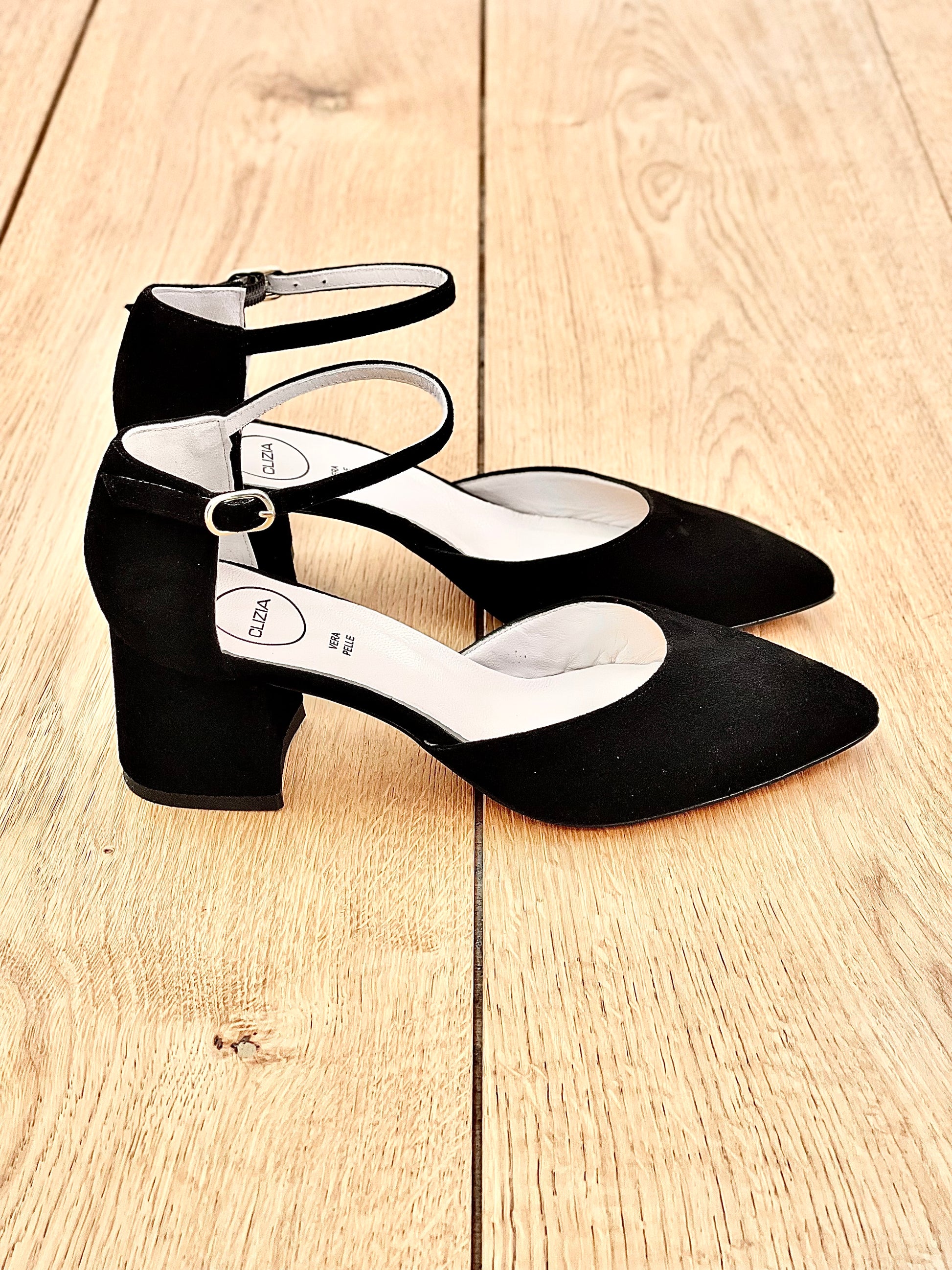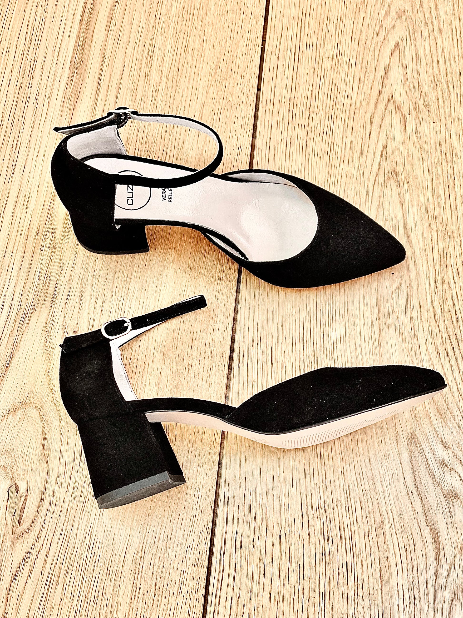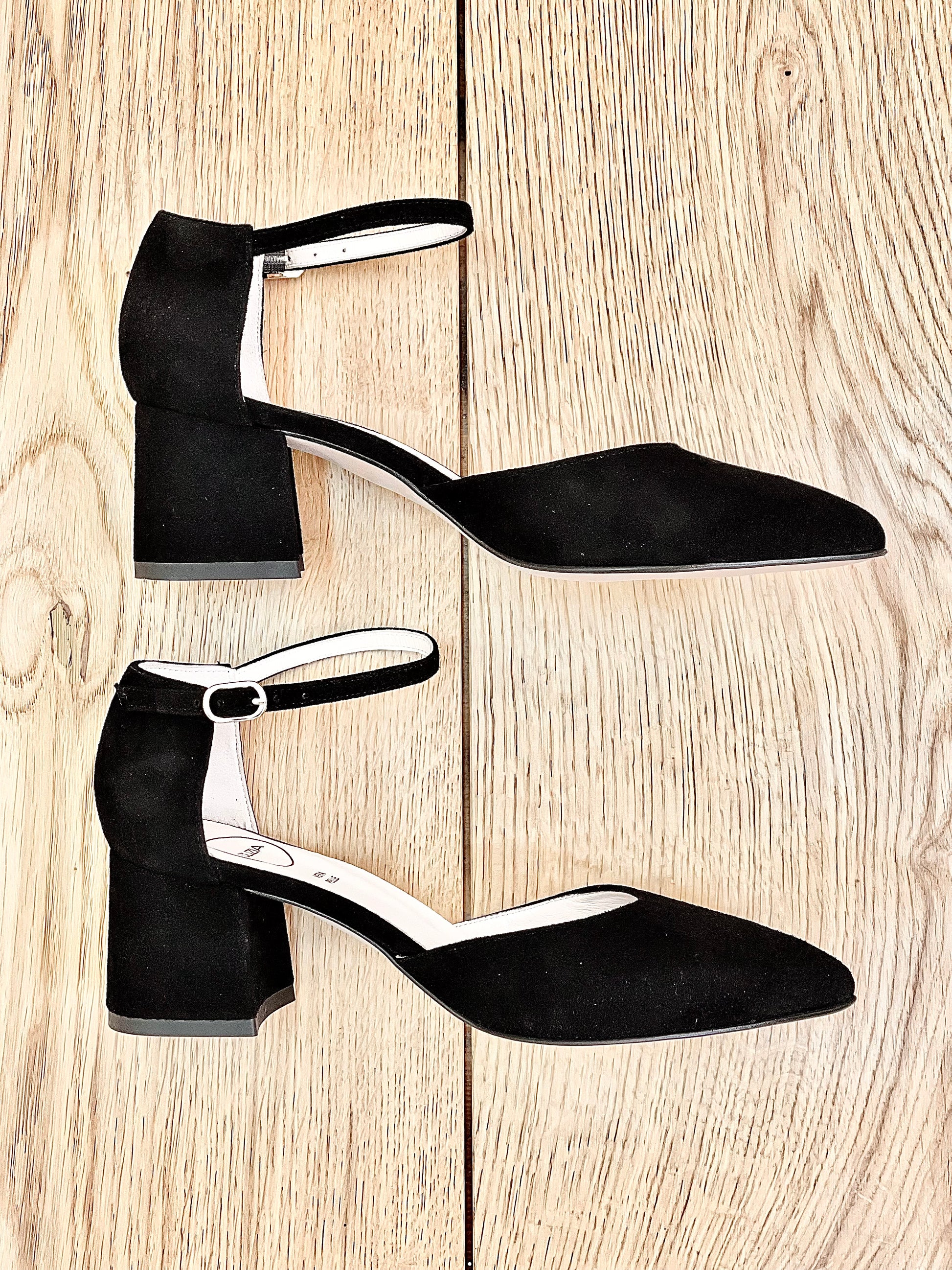 Γόβες με μυτερή μύτη και τακούνι από καμηλό δέρμα με φαρδύ τακούνι.