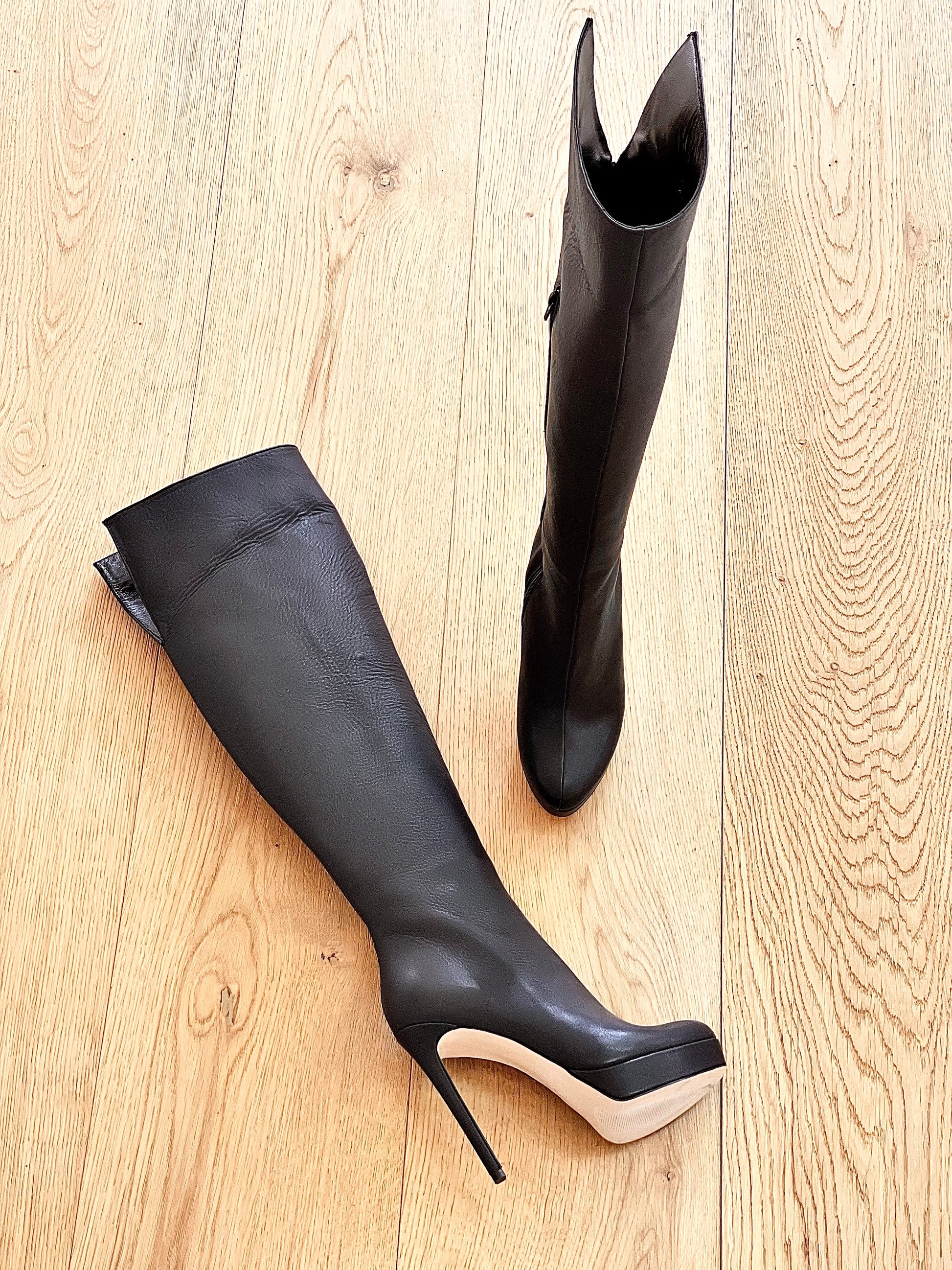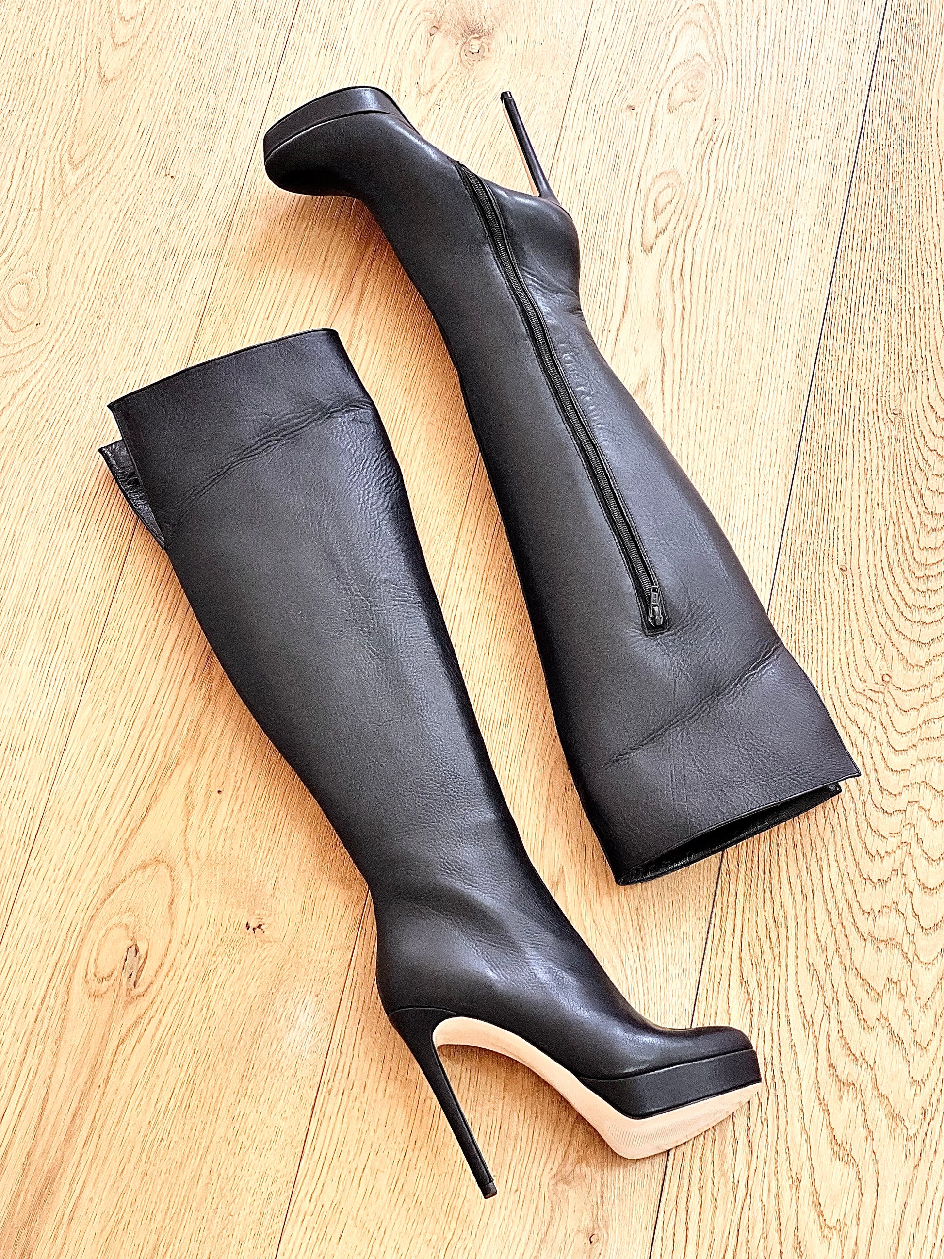 Μπότες πάνω από το γόνατο με στρογγυλή μύτη από δέρμα, πλατφόρμα και τακούνι.