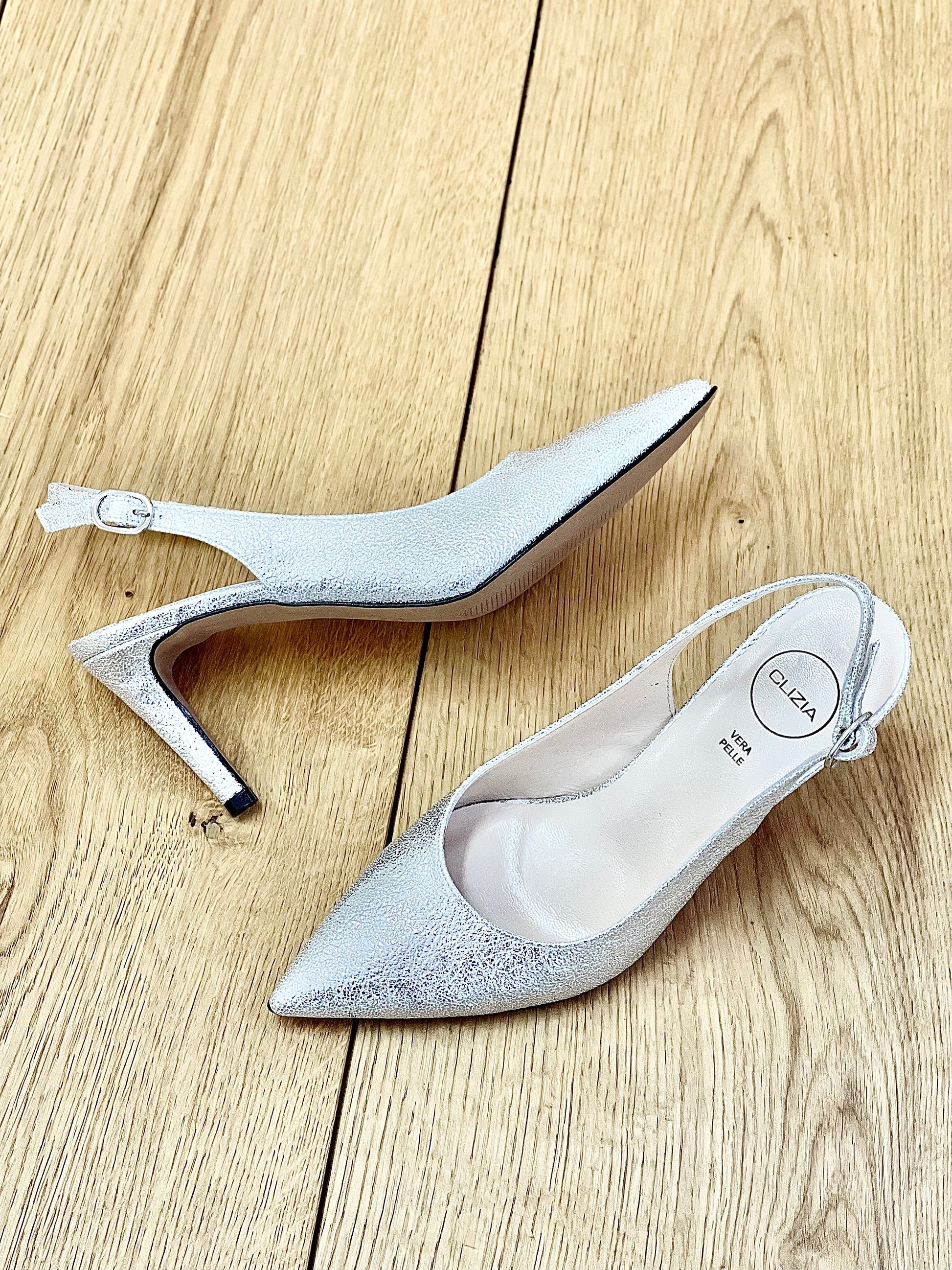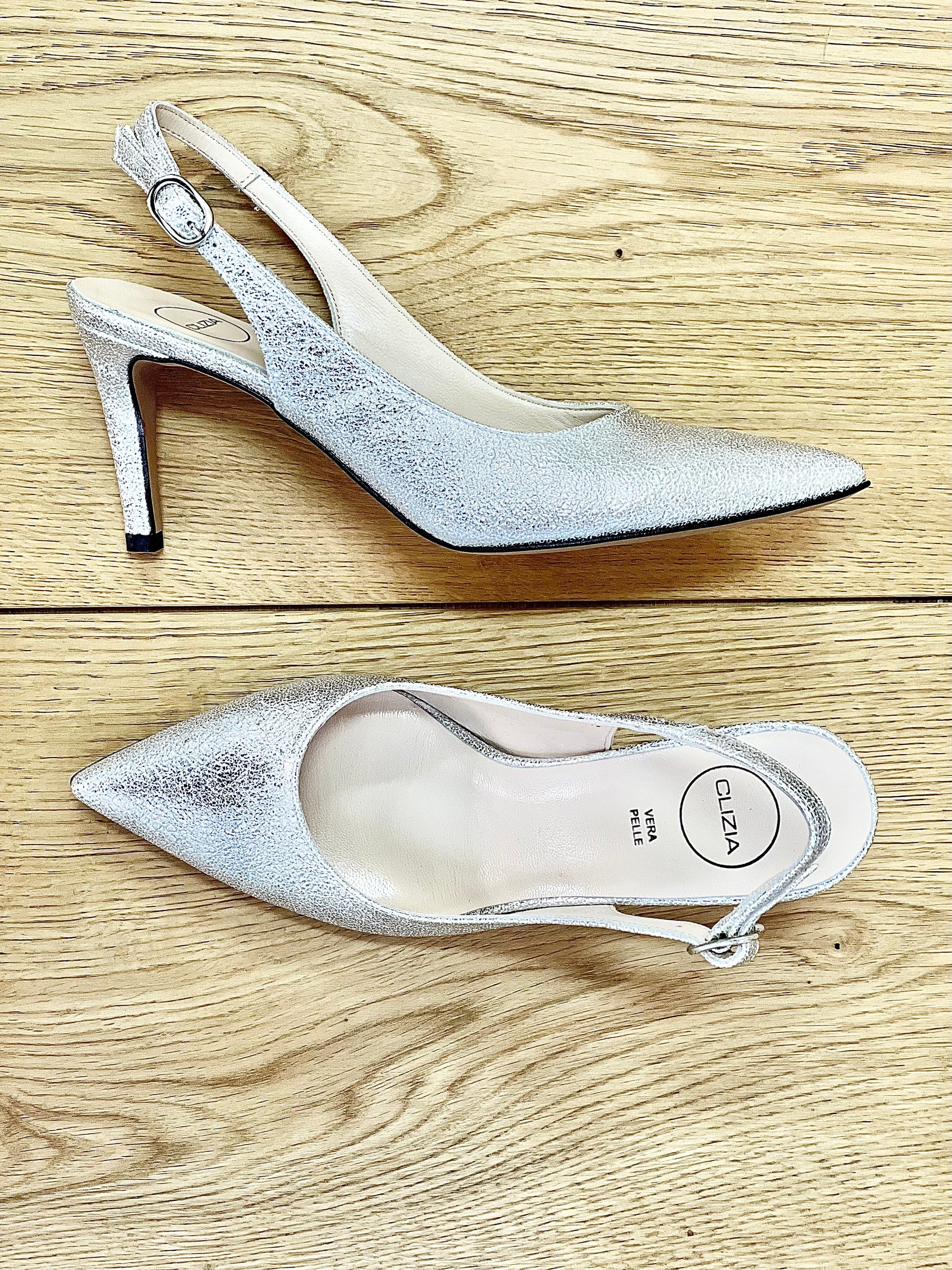 Σλιπ-ον γόβες με λεπτή μύτη από λαμινέ, τακούνι 75 mm.