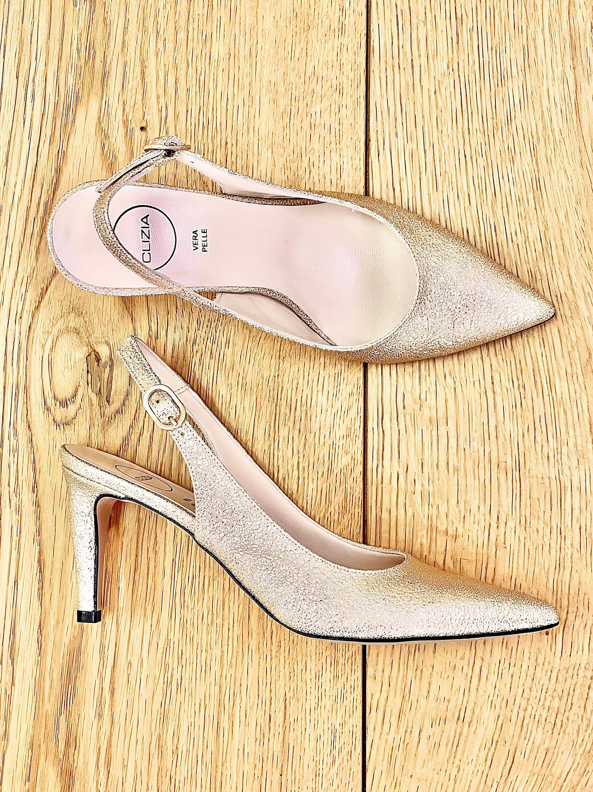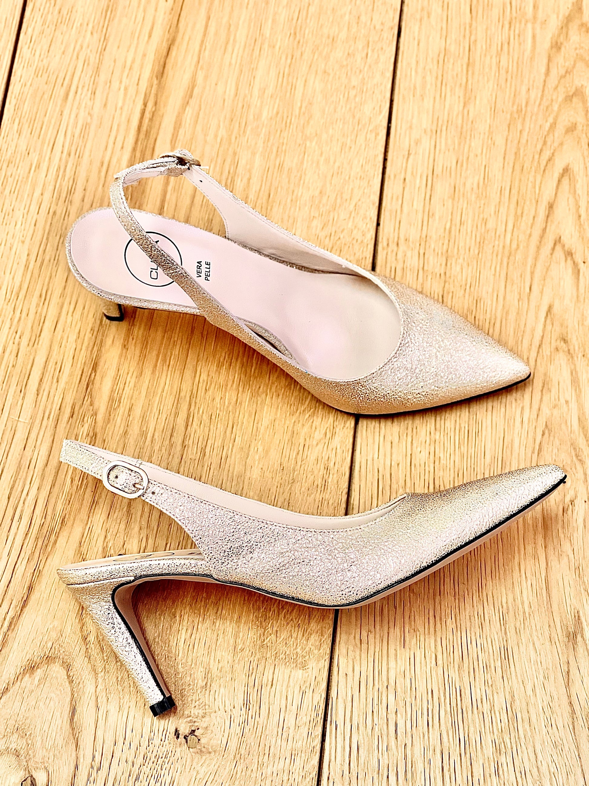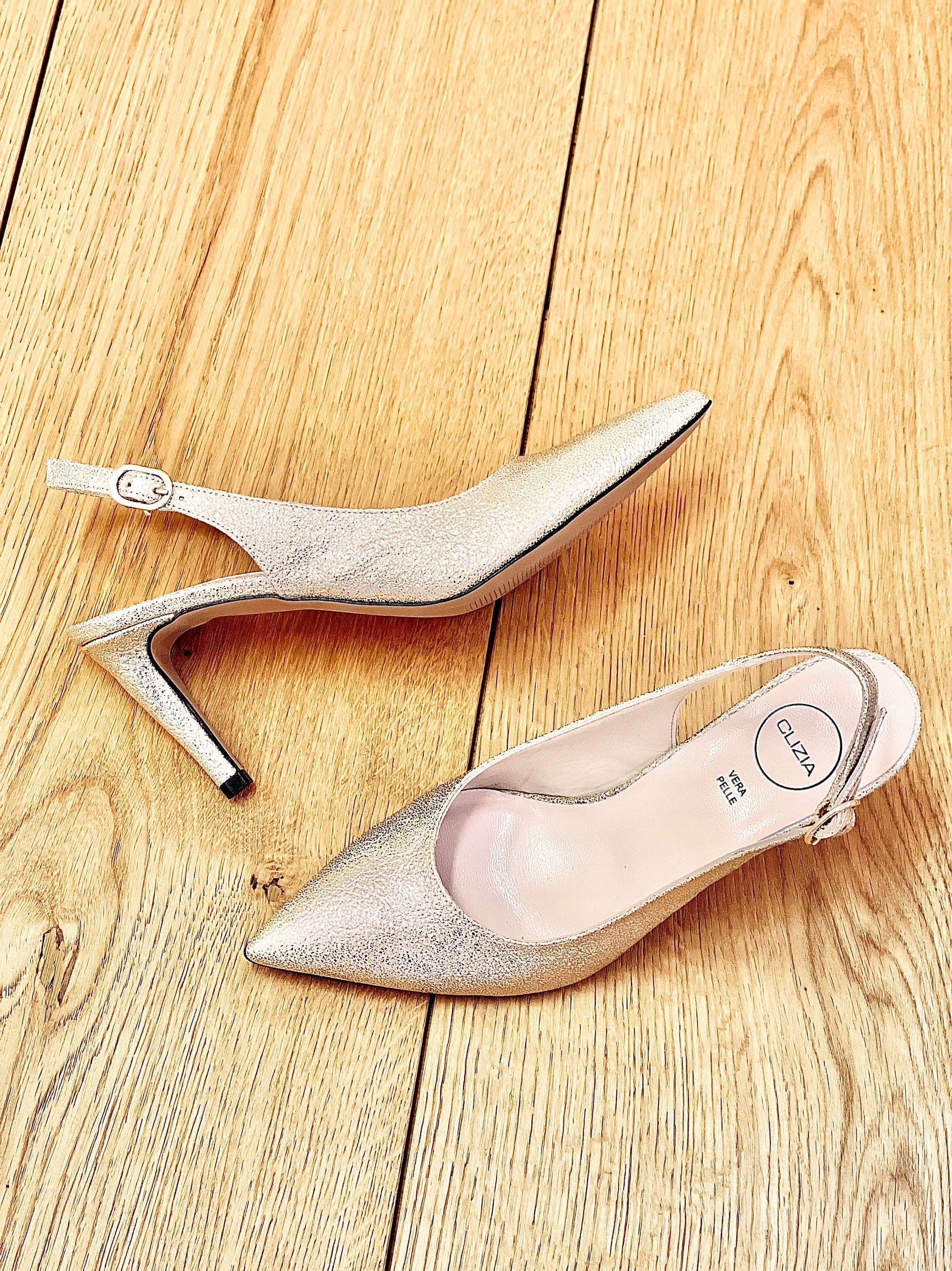 Σλιπ-ον γόβες με λεπτή μύτη από λαμινέ, τακούνι 75 mm.