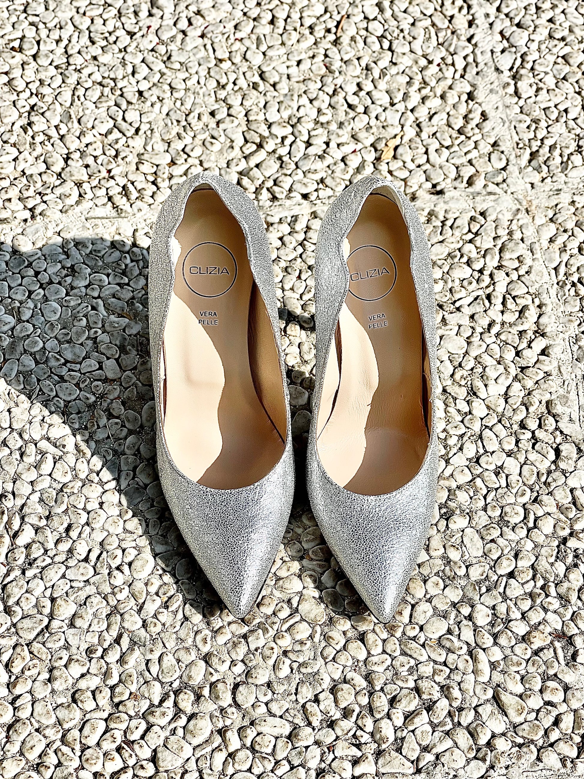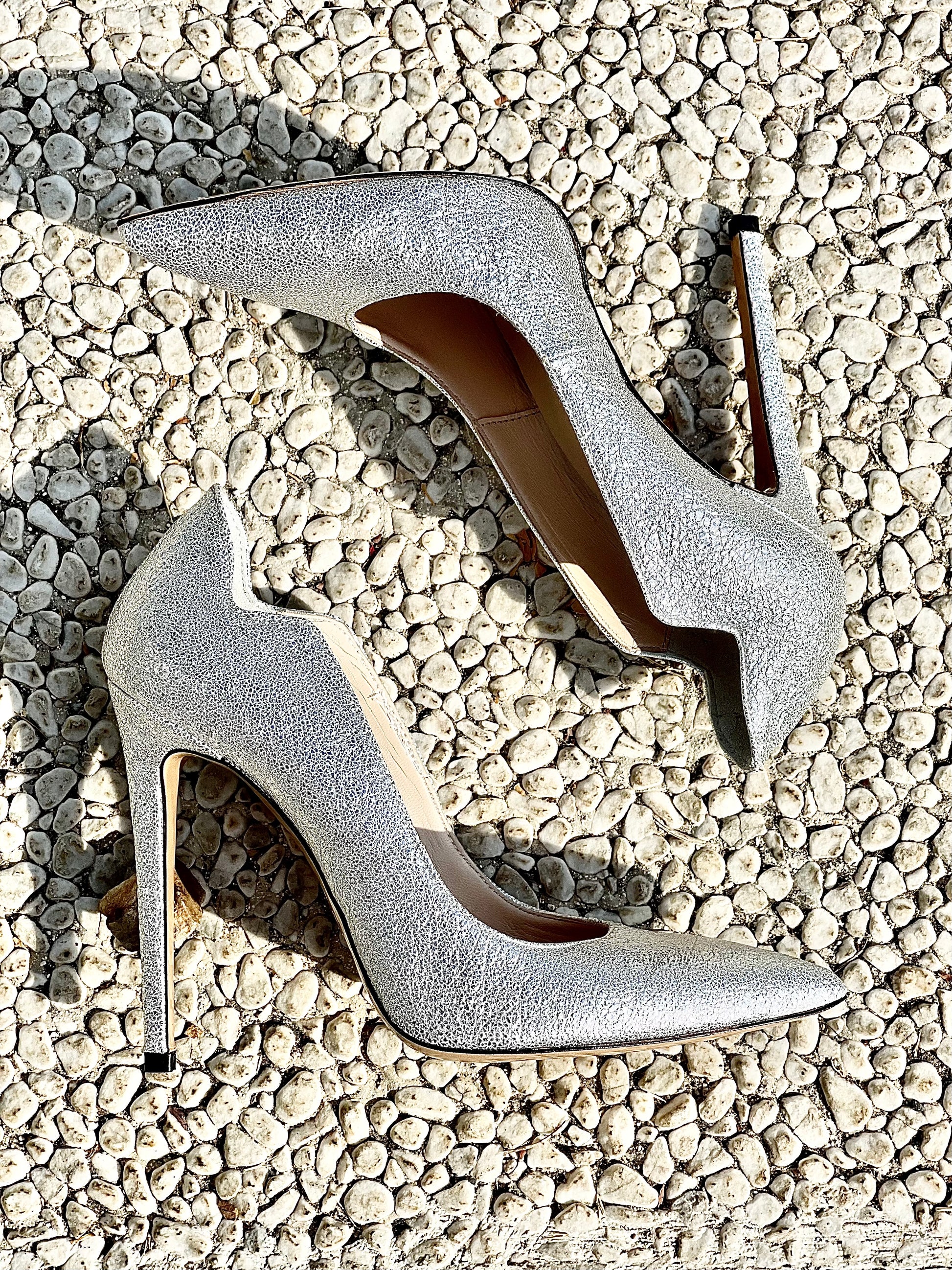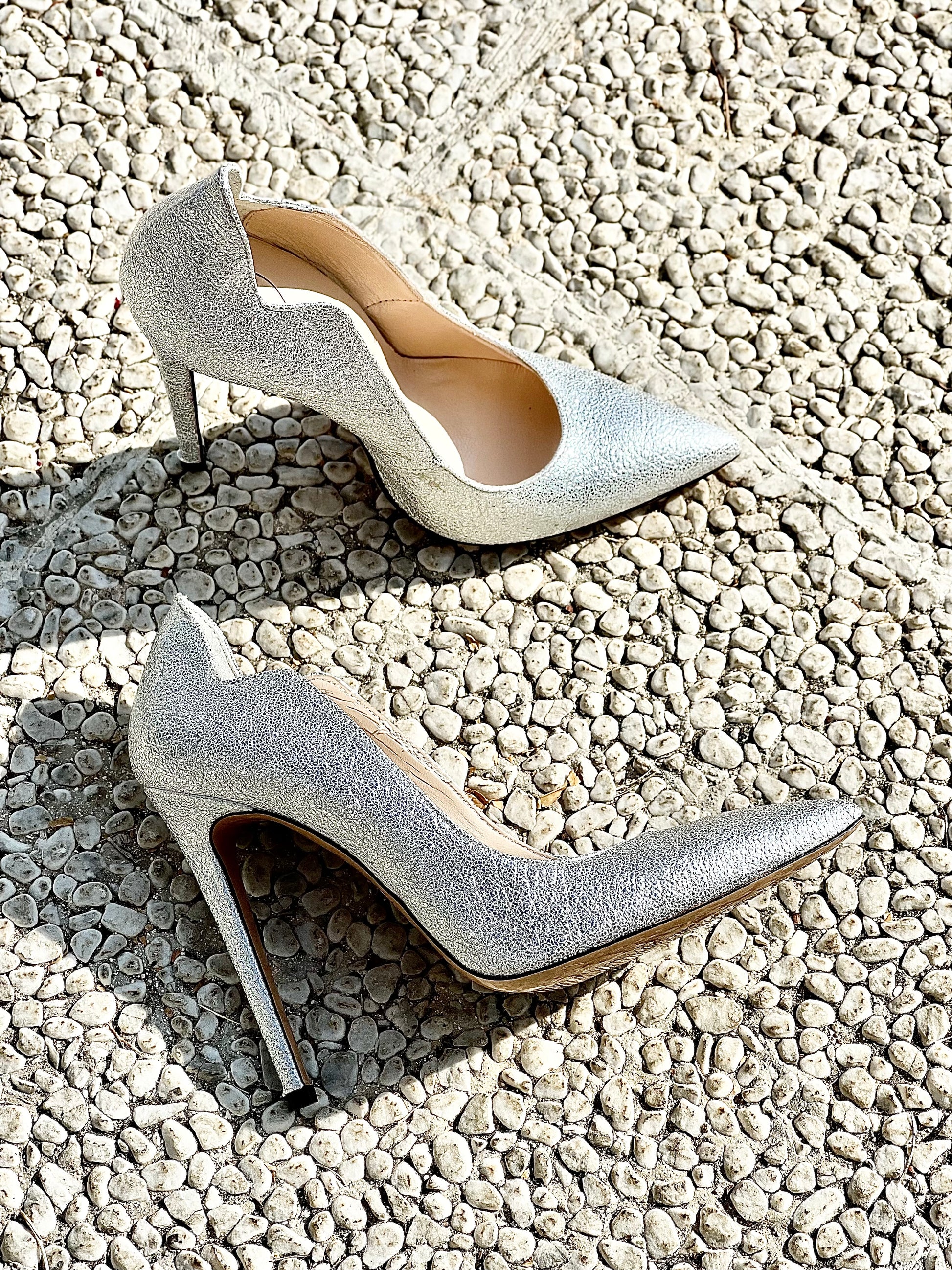 Ανοιχτά γόβα με λεπτή μύτη από λαμινέ και ψηλό τακούνι.