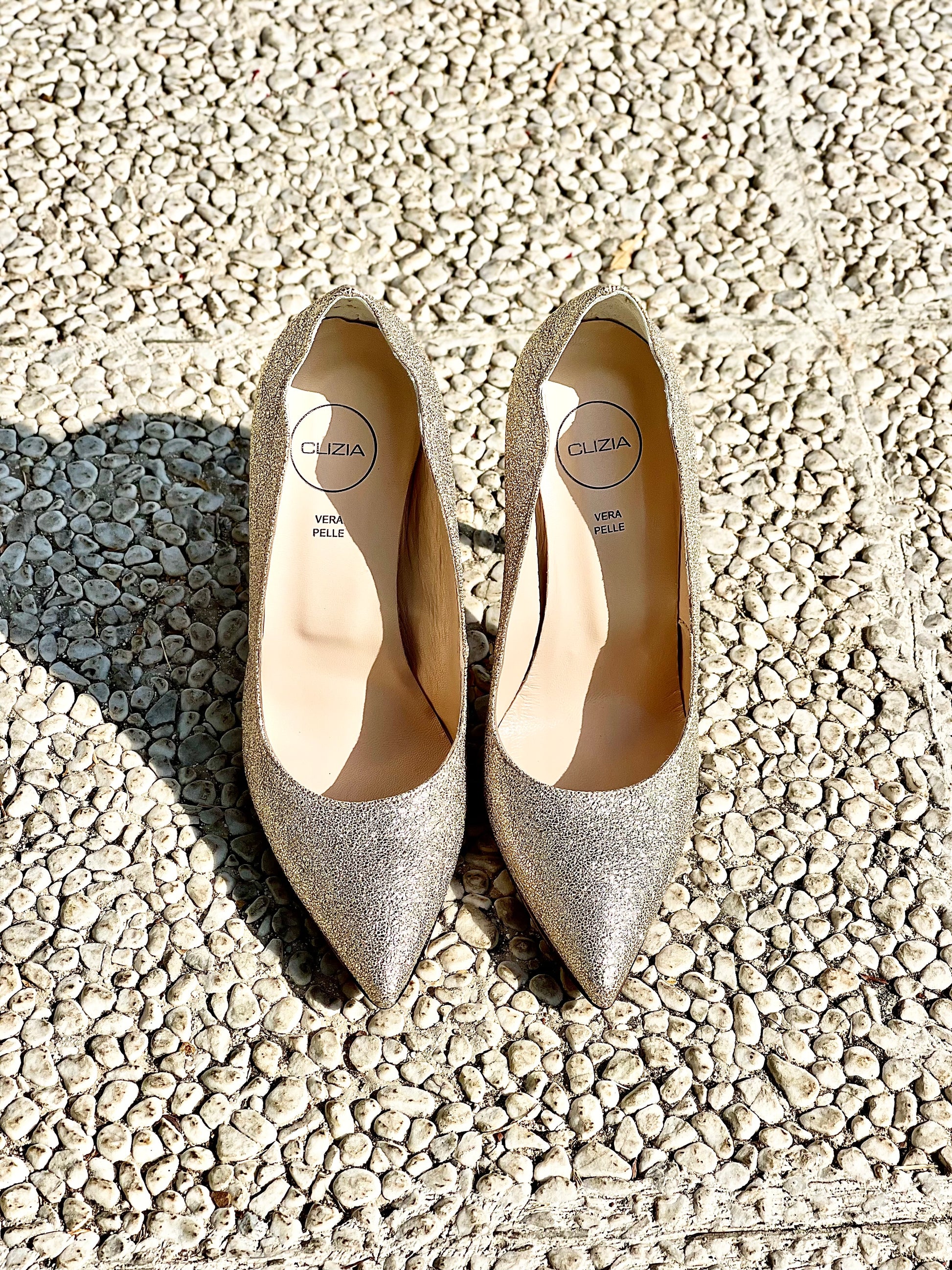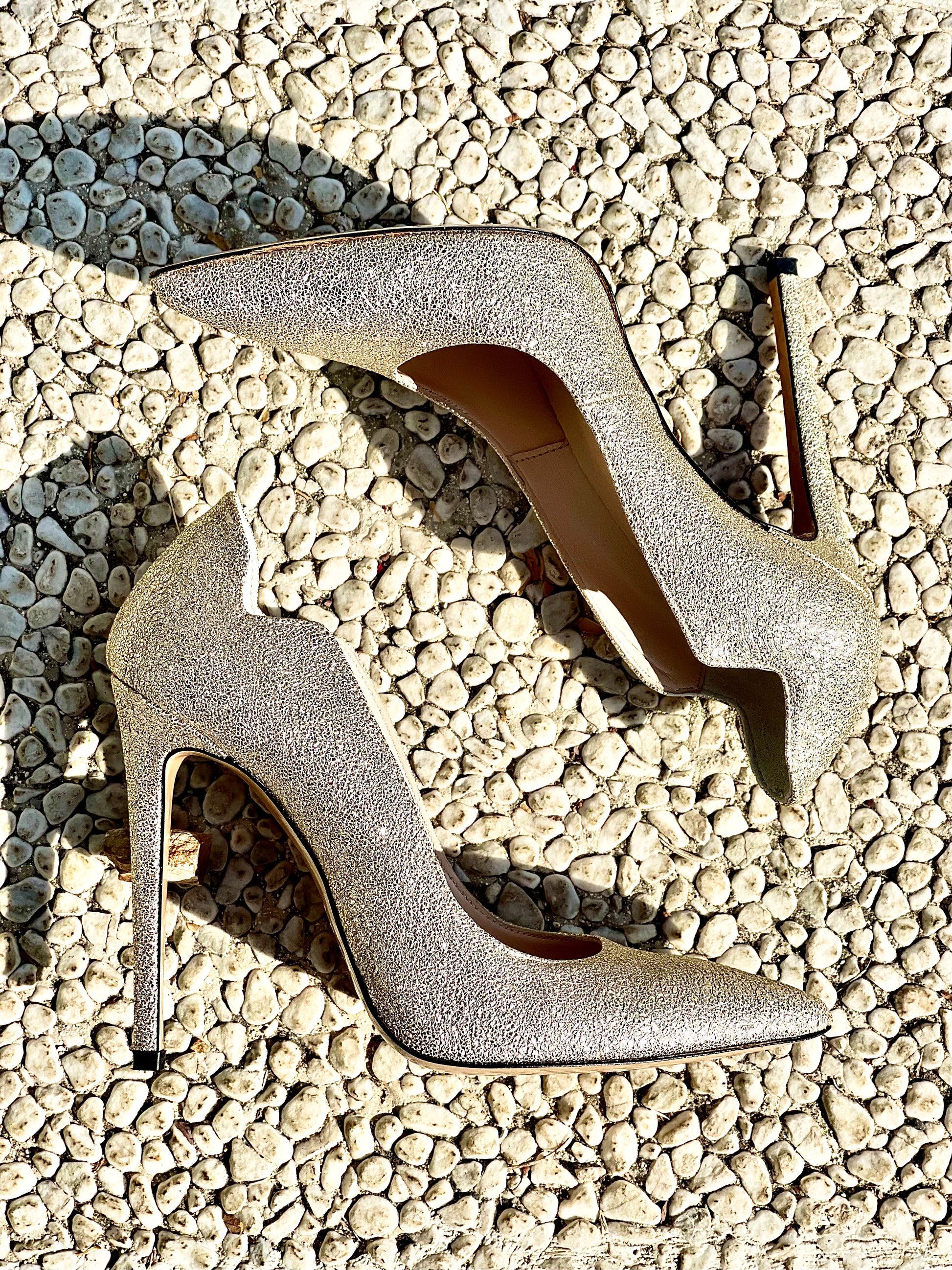 Ανοιχτά γόβα με λεπτή μύτη από λαμινέ και ψηλό τακούνι.