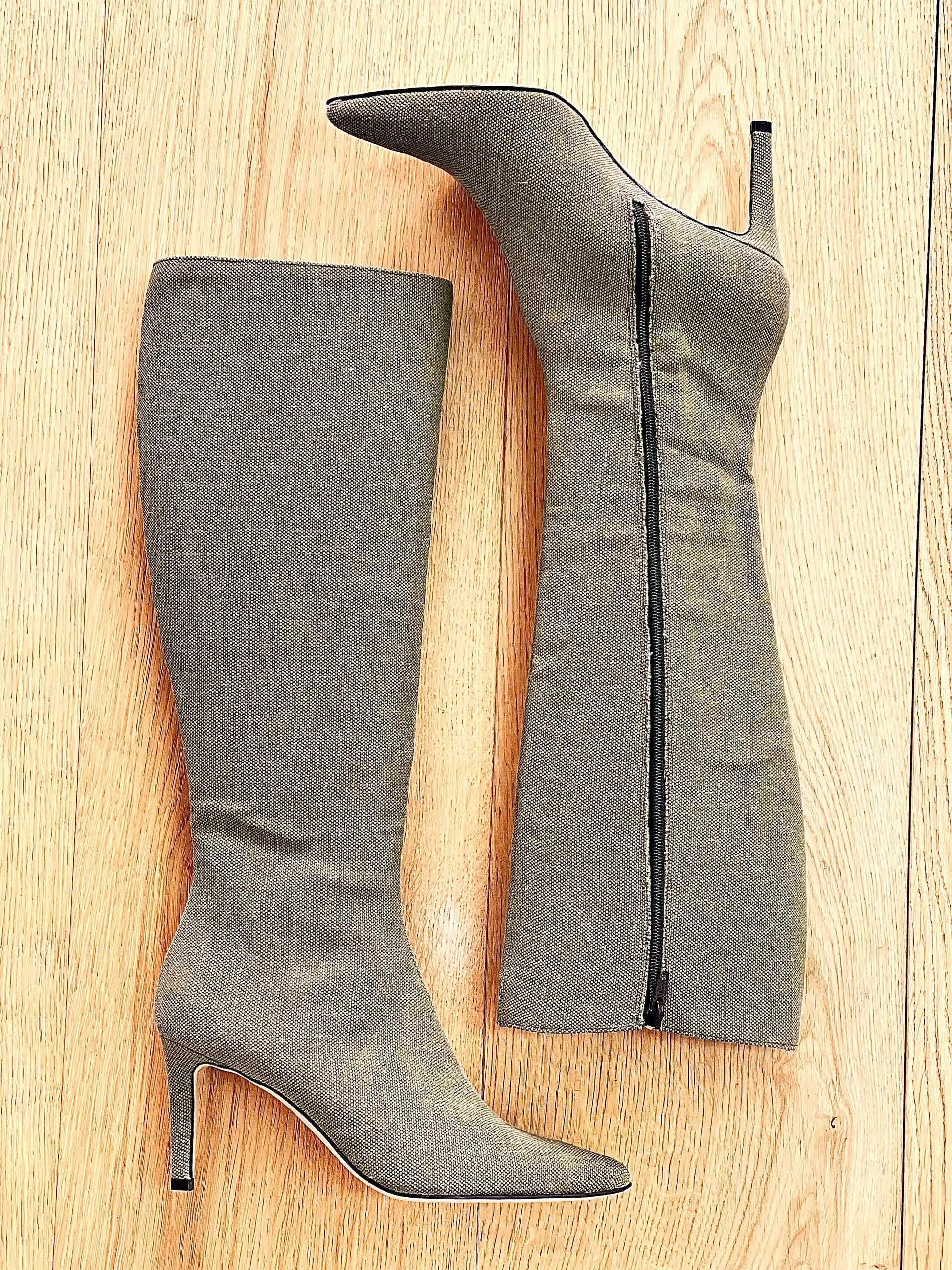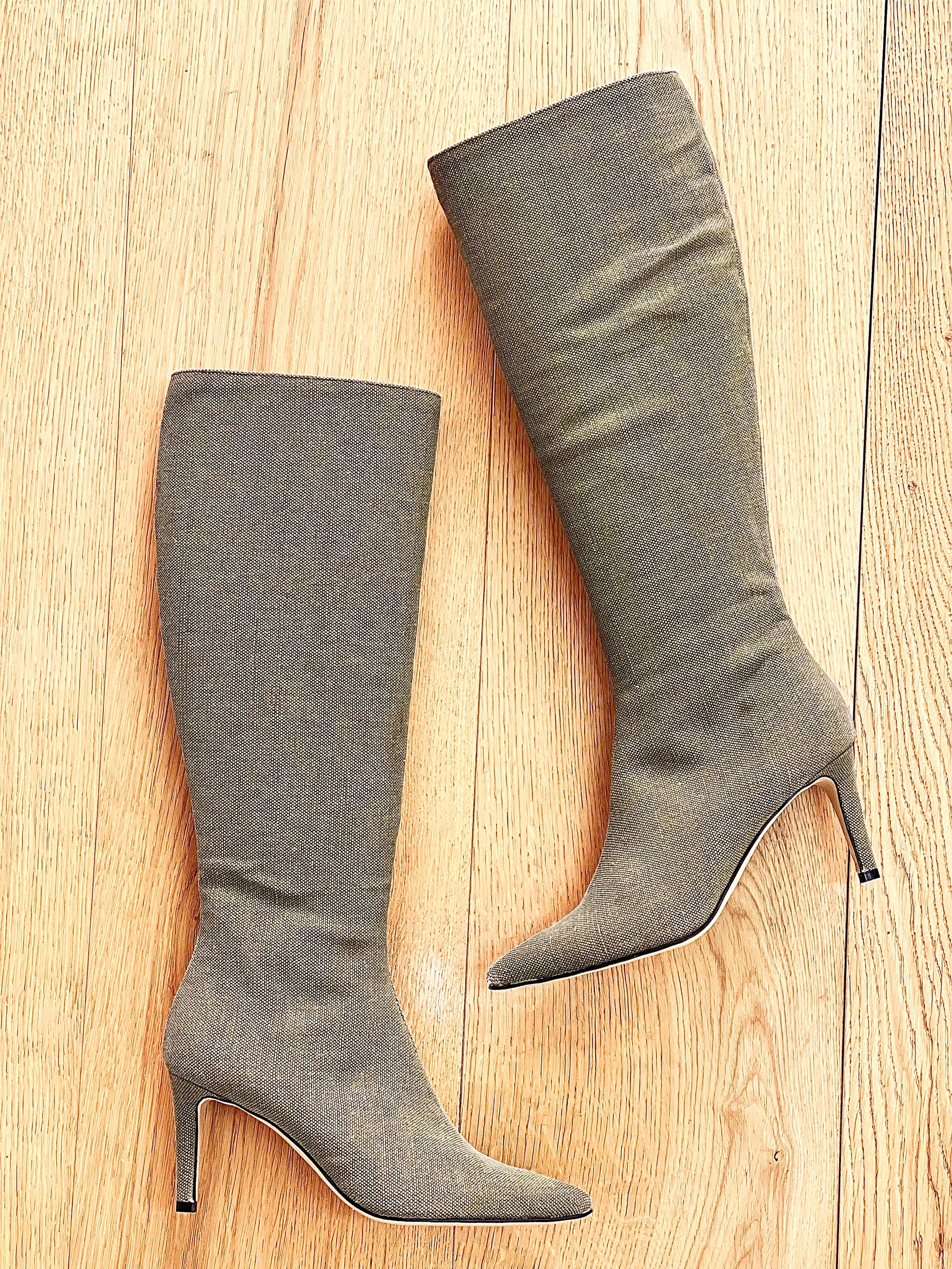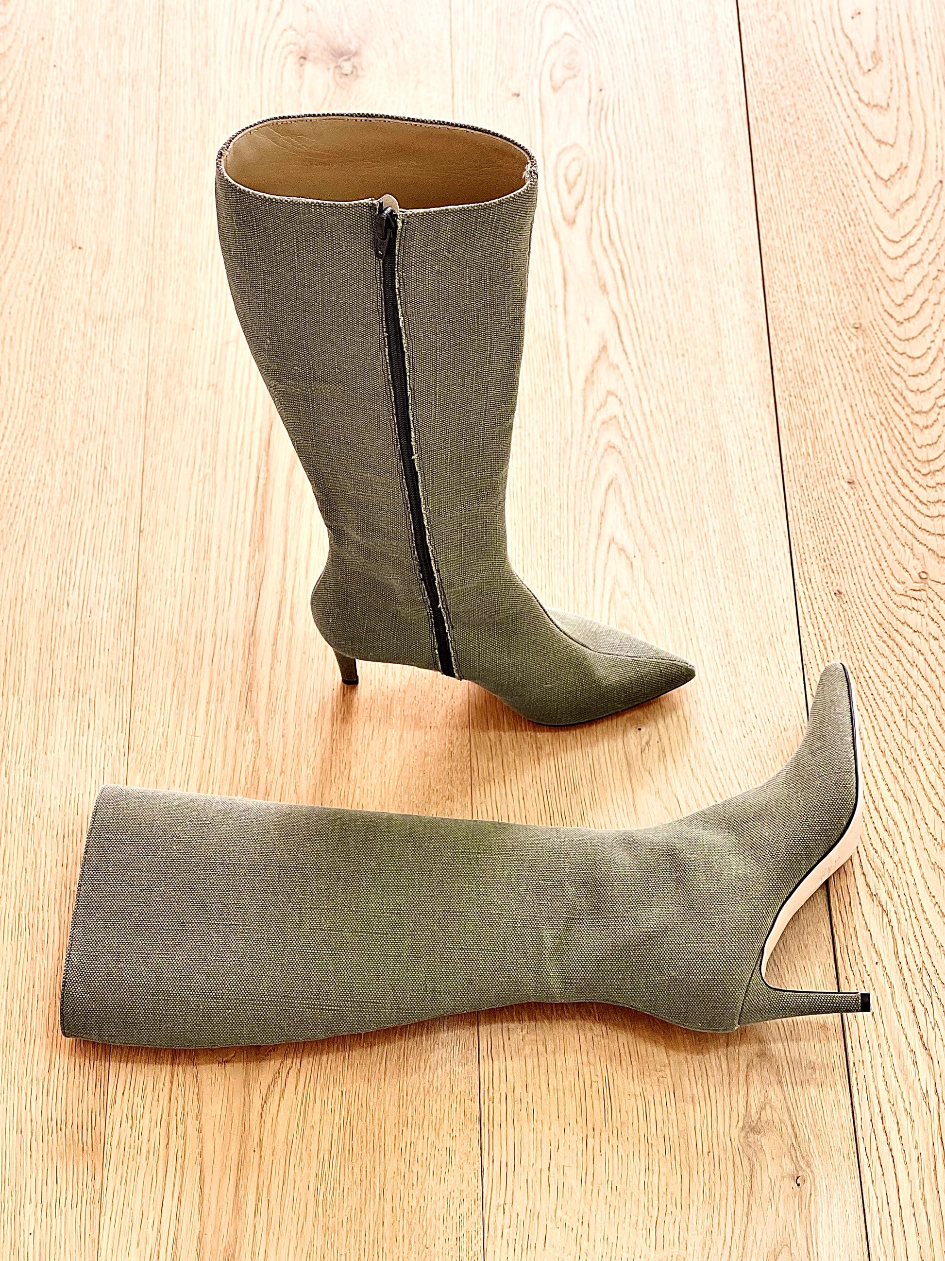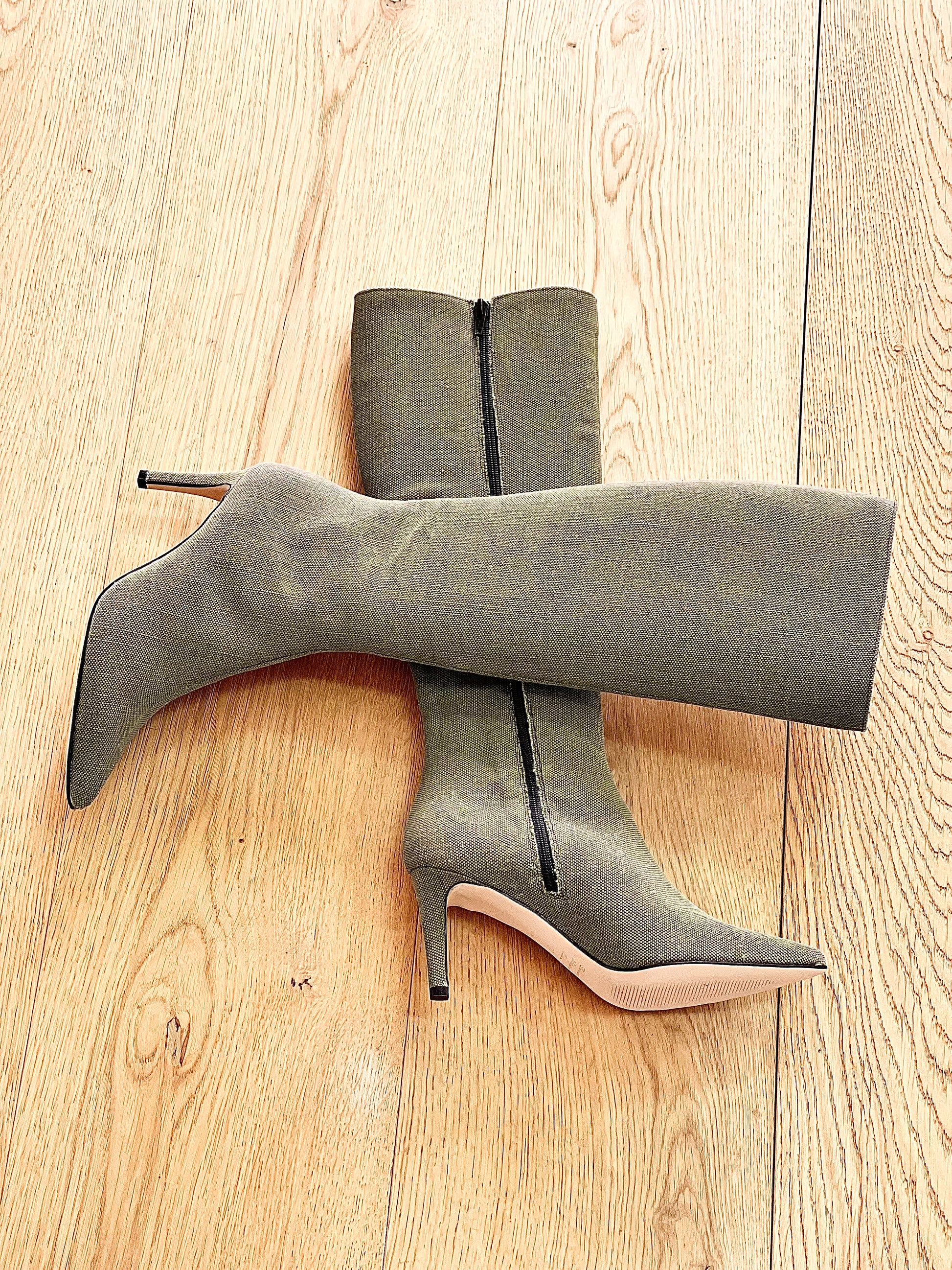 Μπότες με μυτερή μύτη από στρατιωτικό καμβά και λεπτό τακούνι.