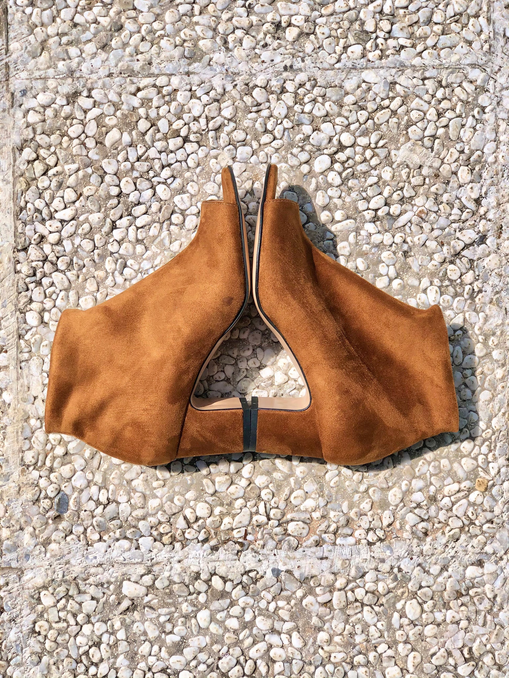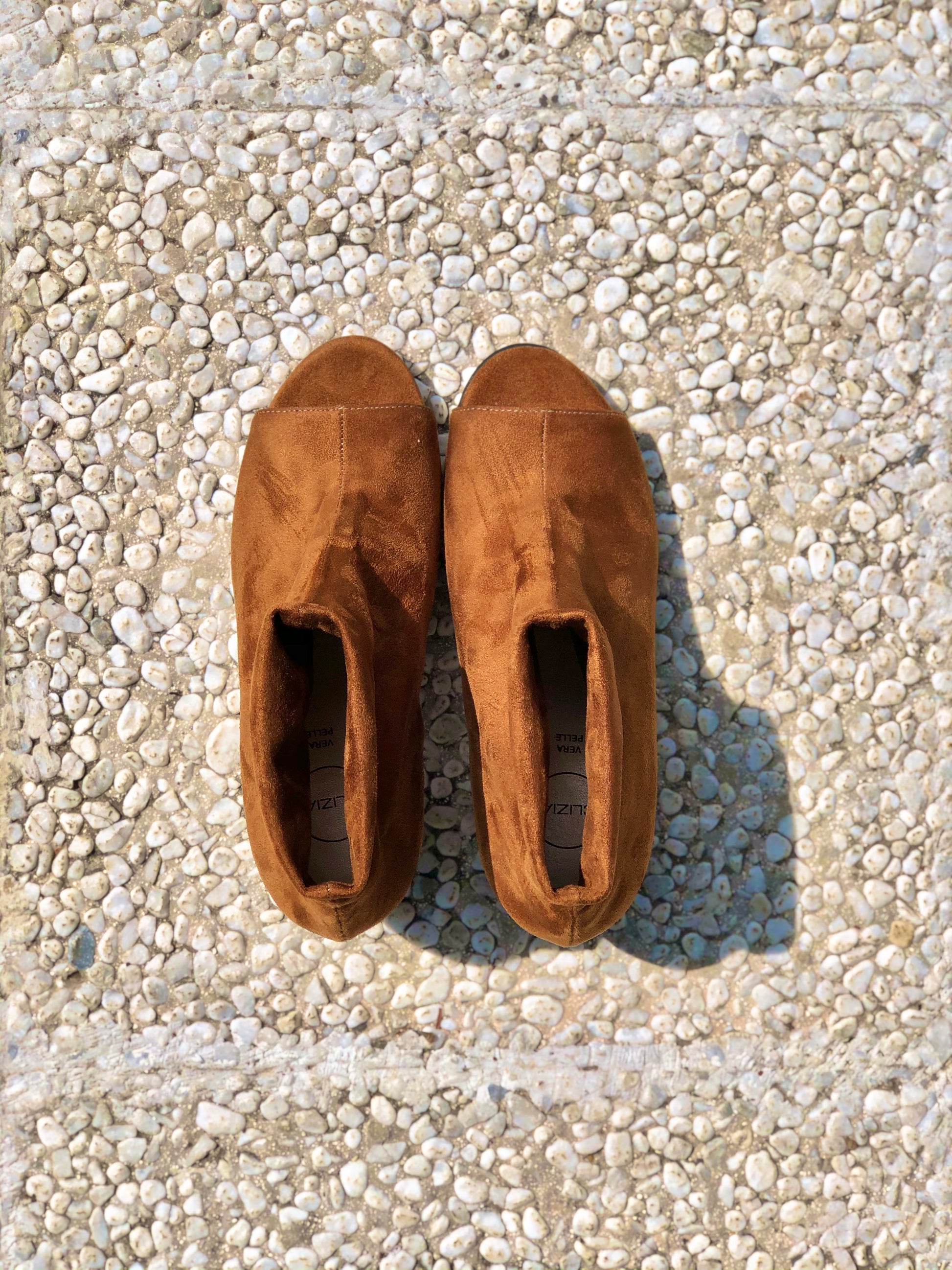 Ελαστικά μποτάκια με ανοιχτή μύτη, από σουέτ, με φαρδύ τακούνι.
