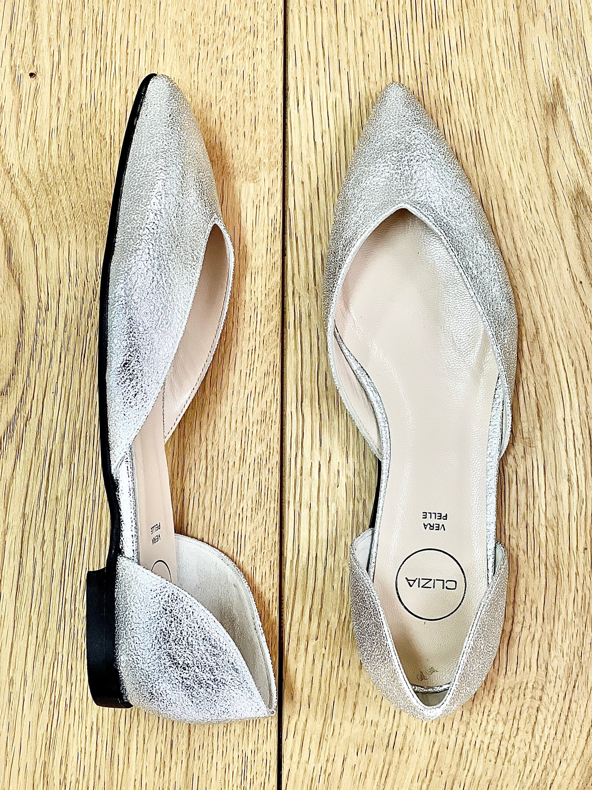 Μπαλαρίνες με ανοιχτή μύτη και τακούνι από πλαστικό υλικό, με V λαιμόκοψη.