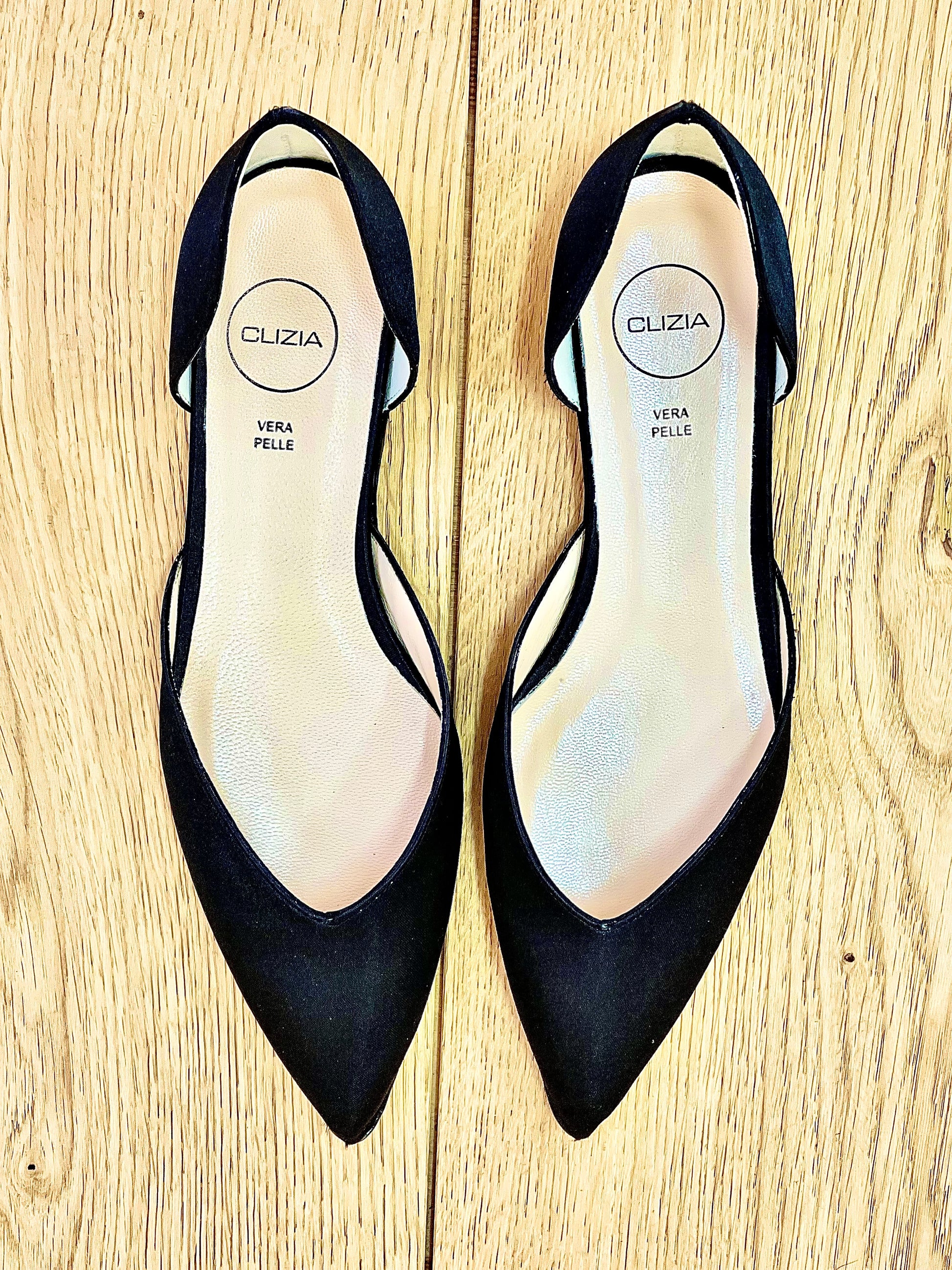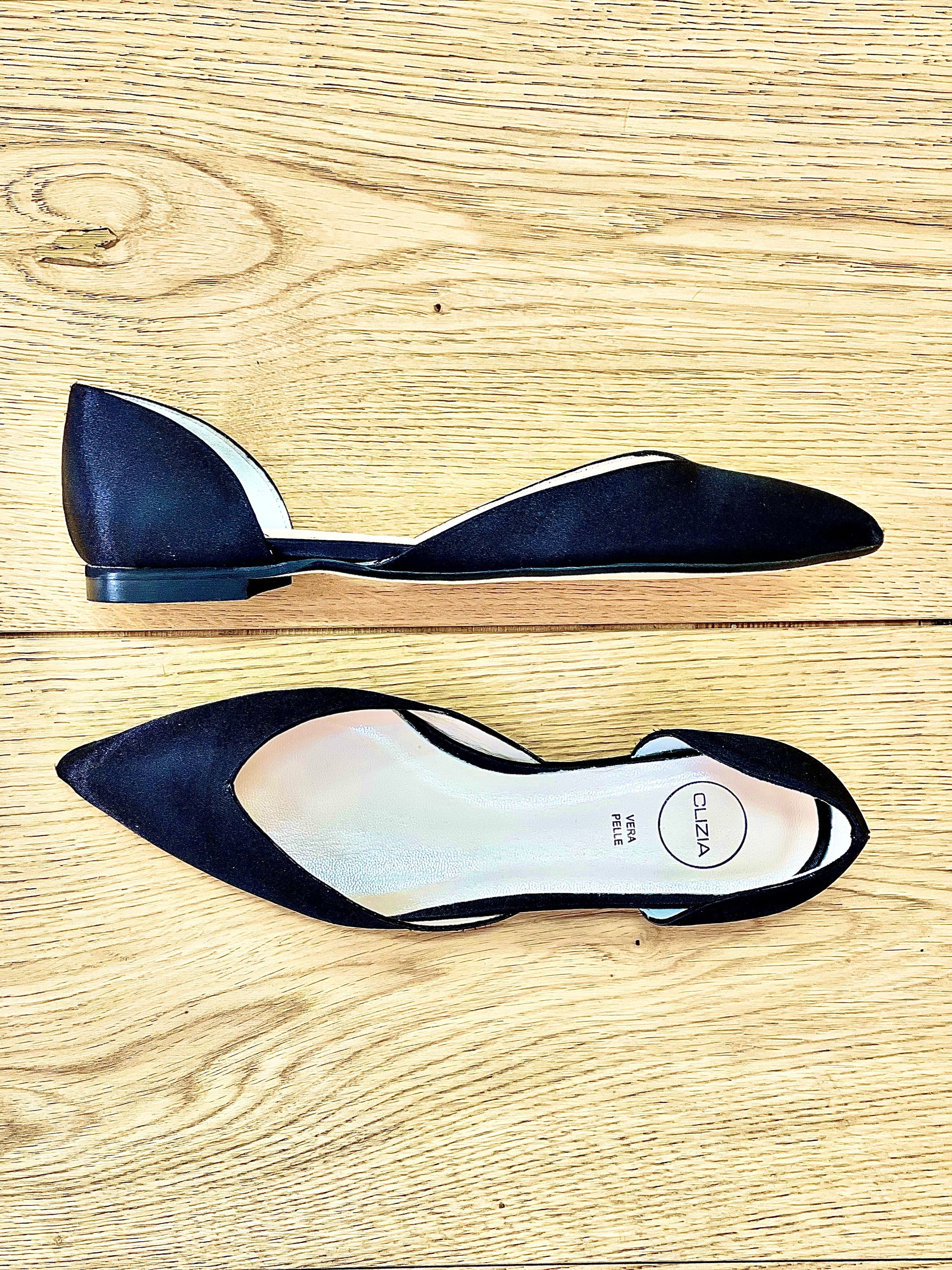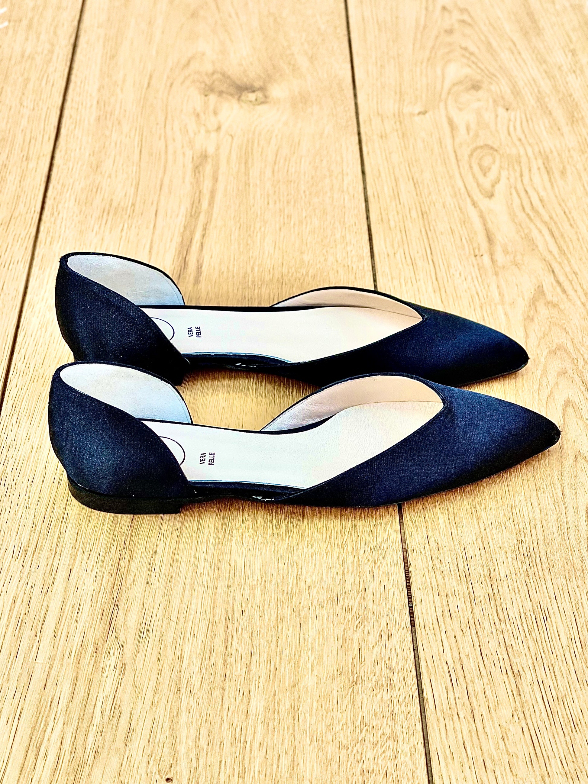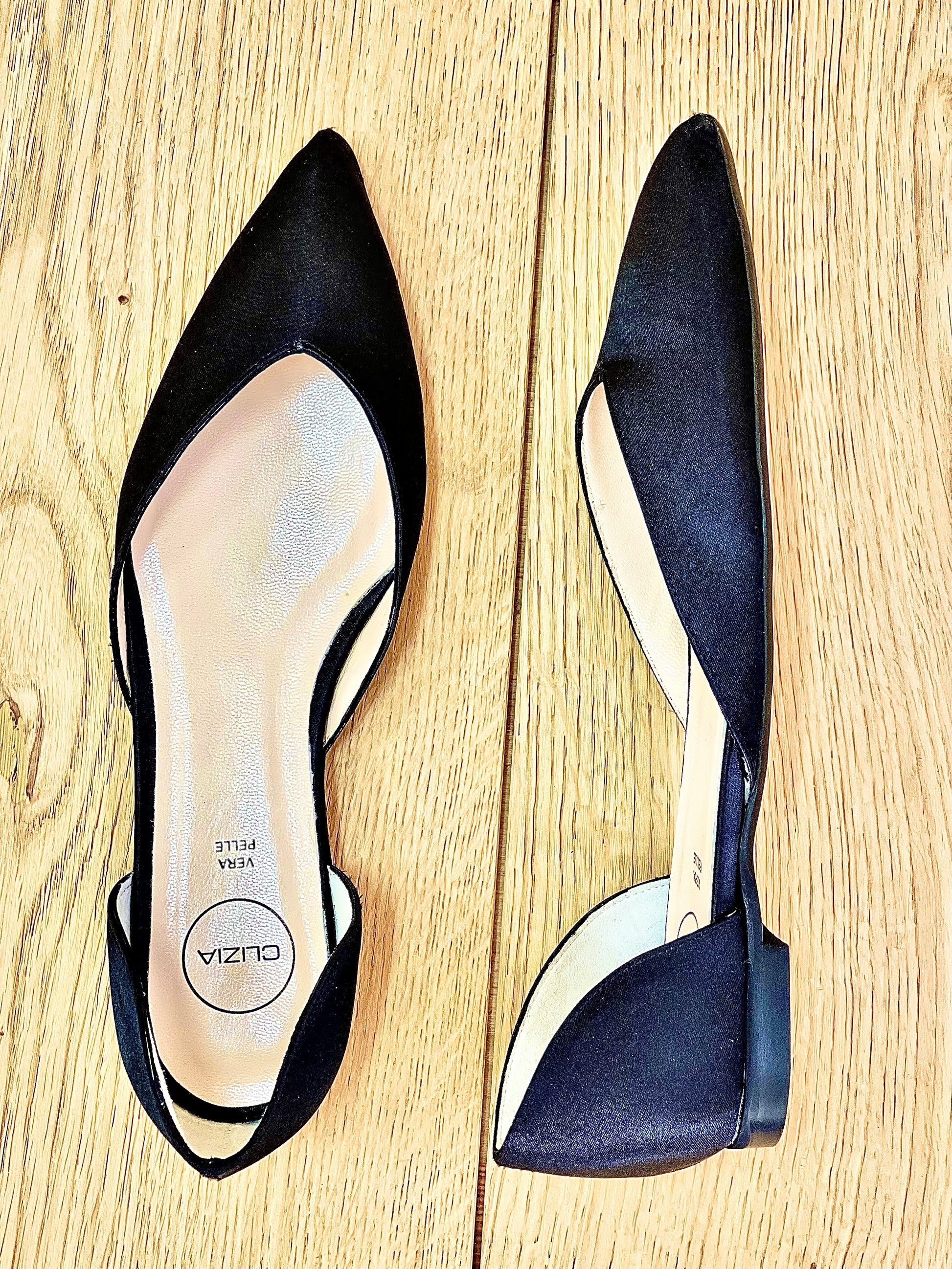 Μπαλαρίνες με ανοιχτή μύτη και τακούνι από σατέν, με V λαιμόκοψη.