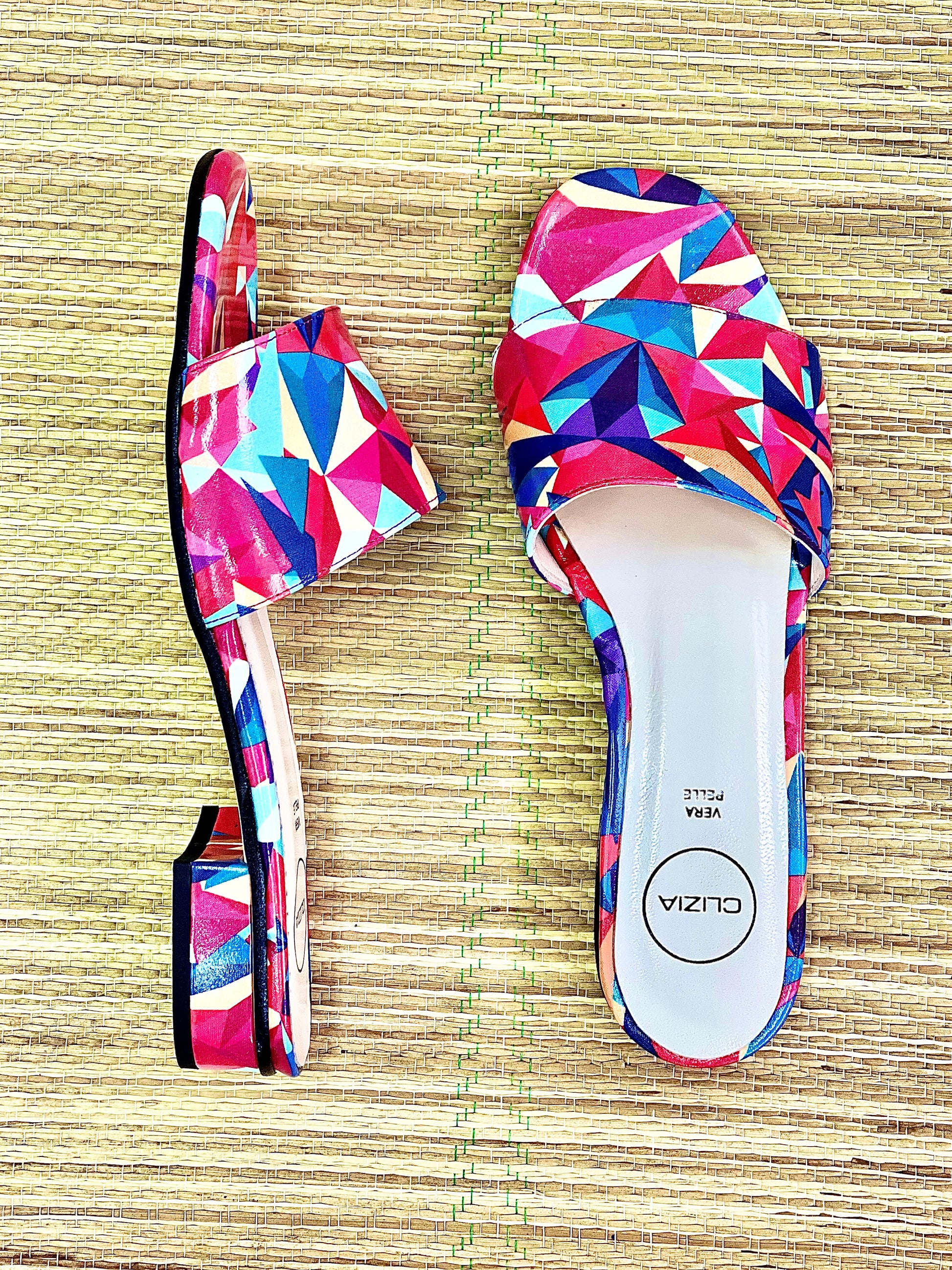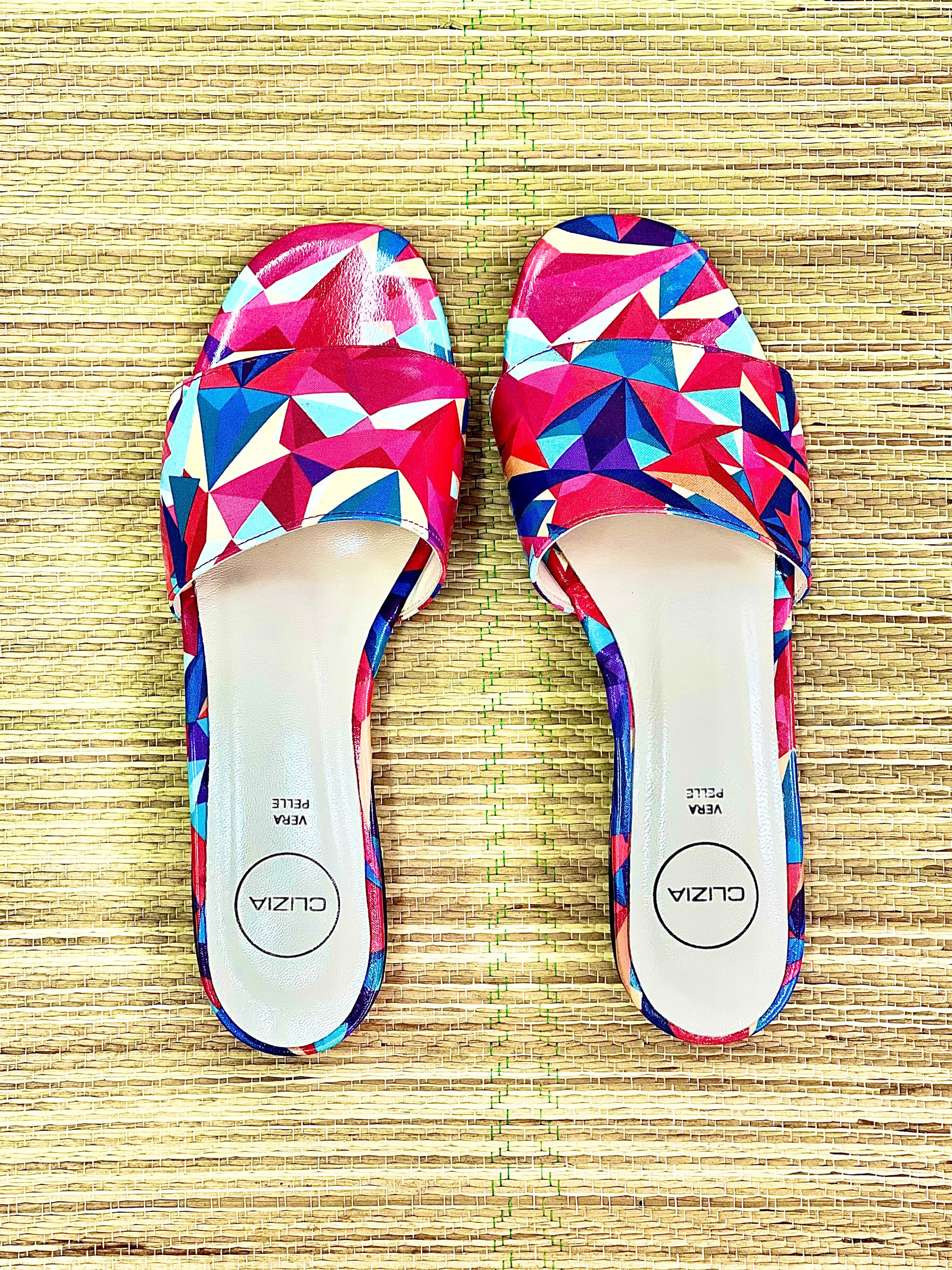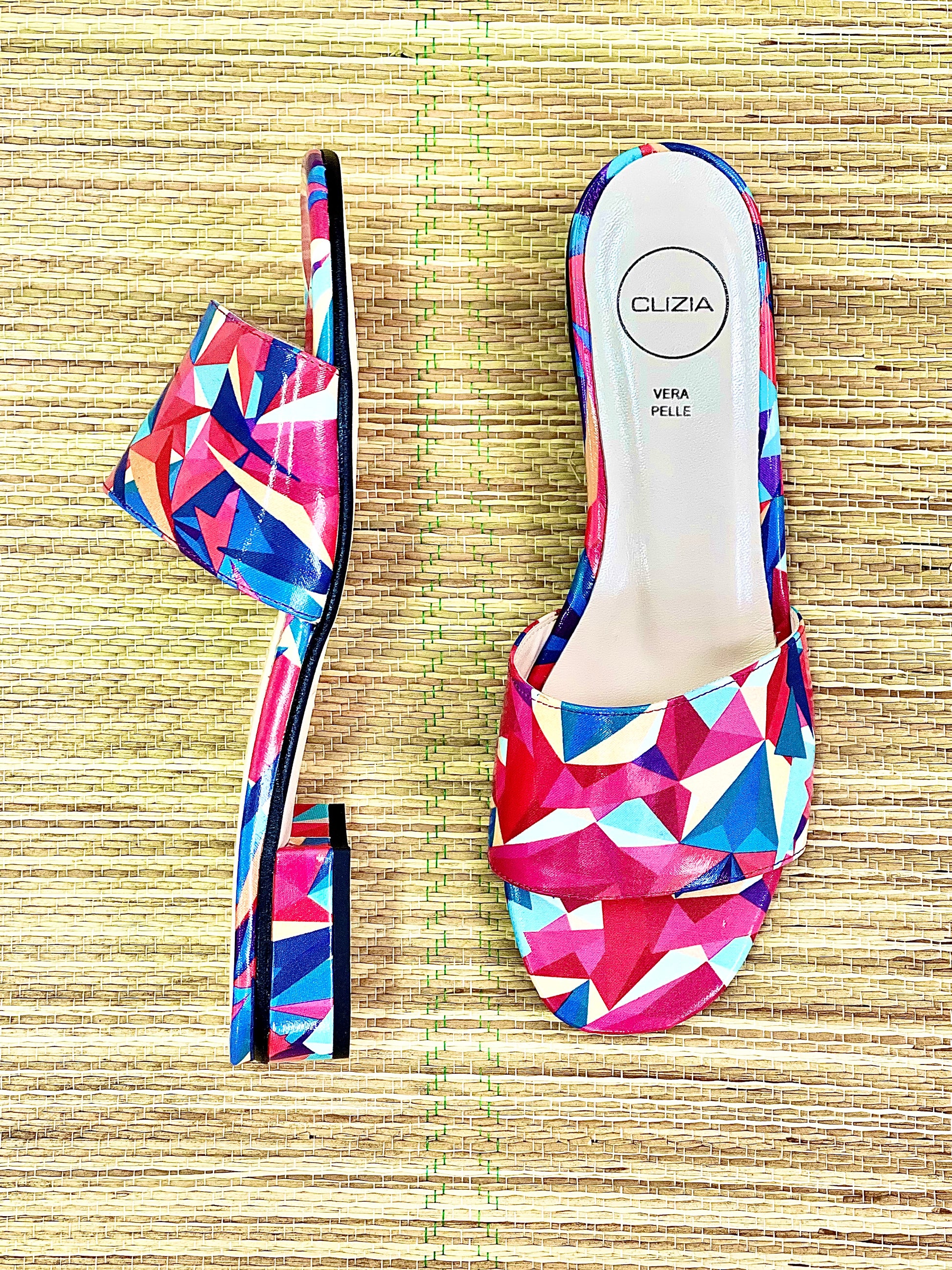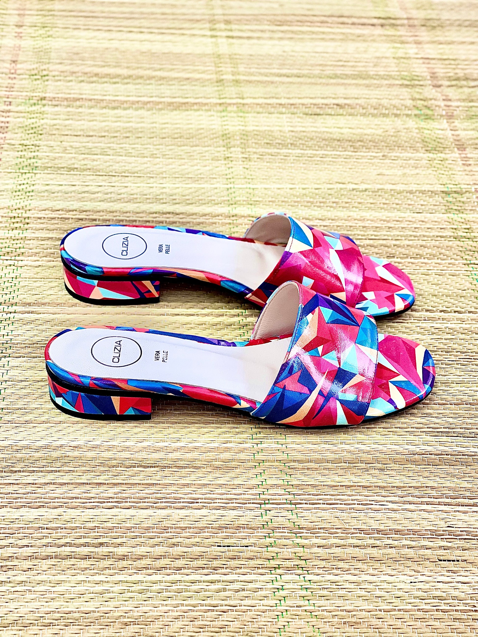 Χαμηλά σανδάλια μούλες από υφασμάτινο γεωμετρικό ύφασμα με φαρδύ τακούνι 2 cm.