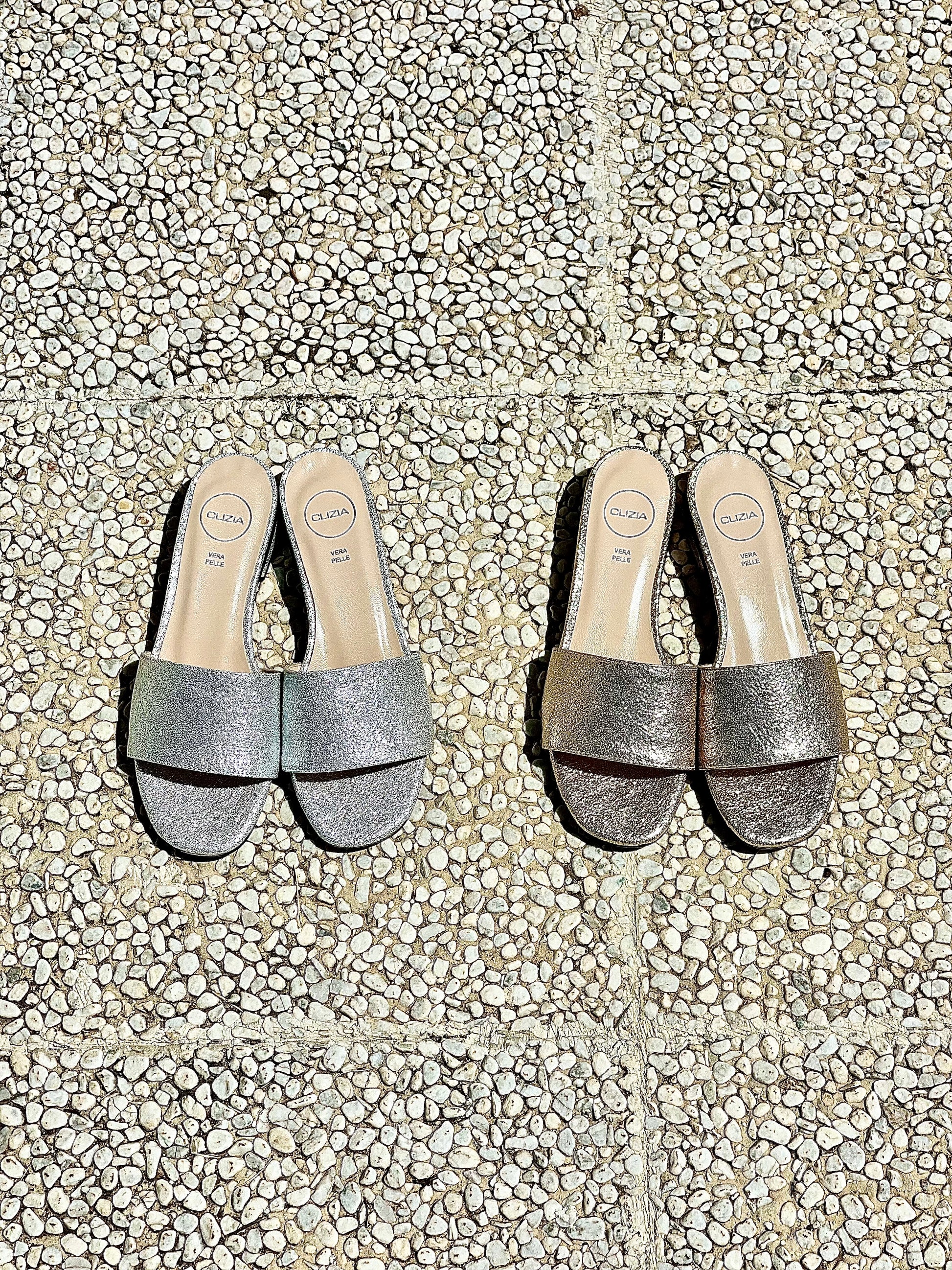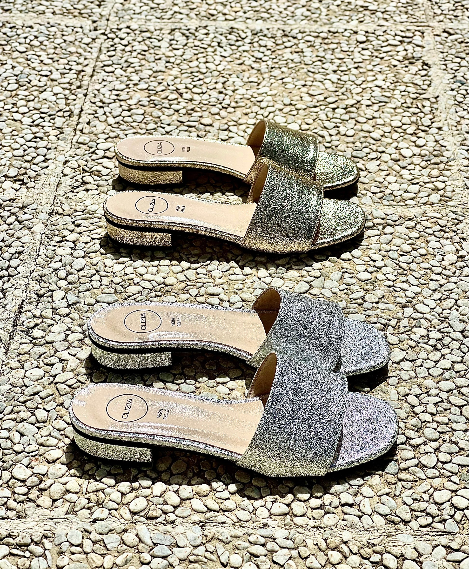 Χαμηλά σανδάλια μούλες σε λαμινέ με φαρδύ τακούνι 2 εκ.