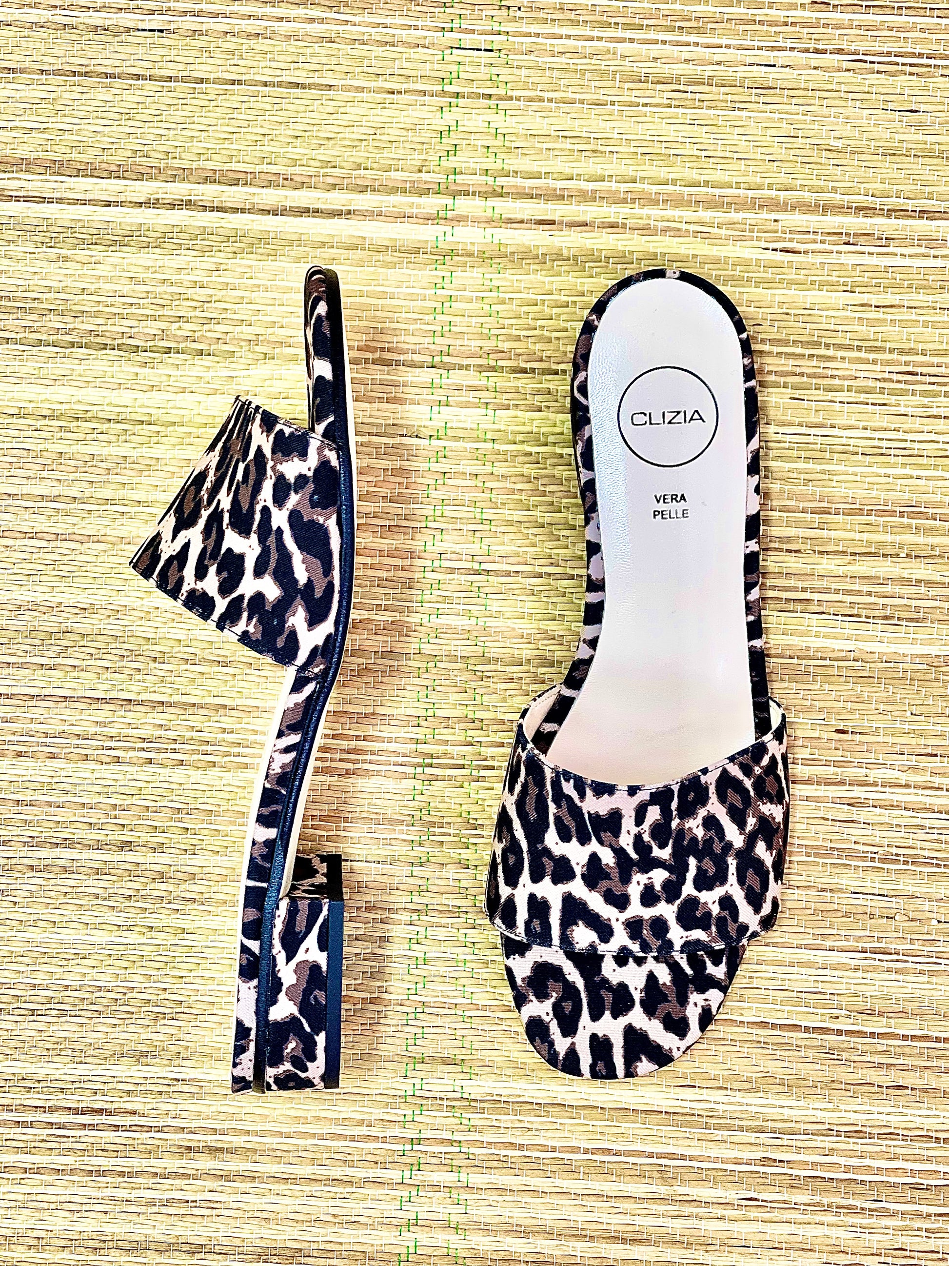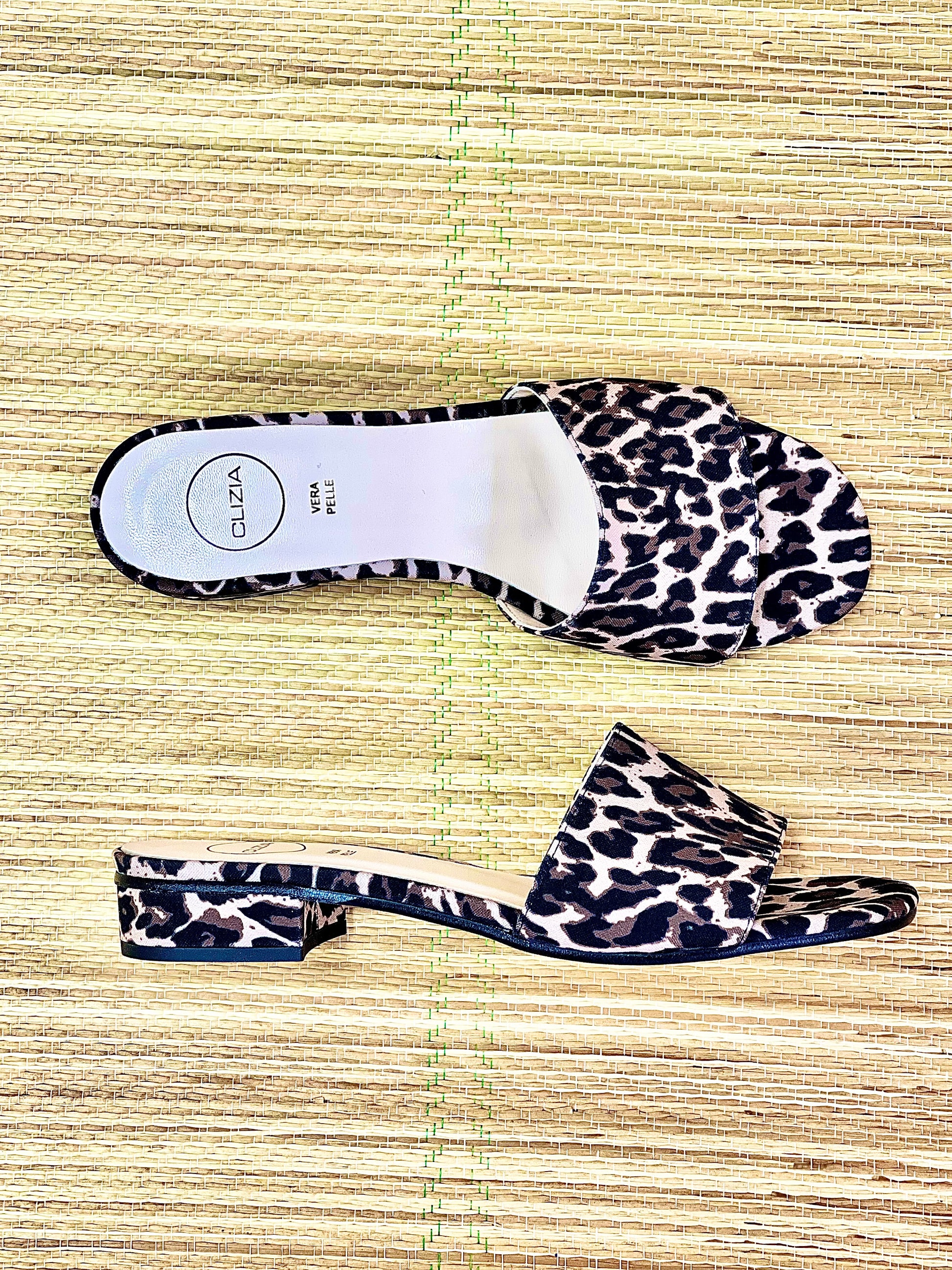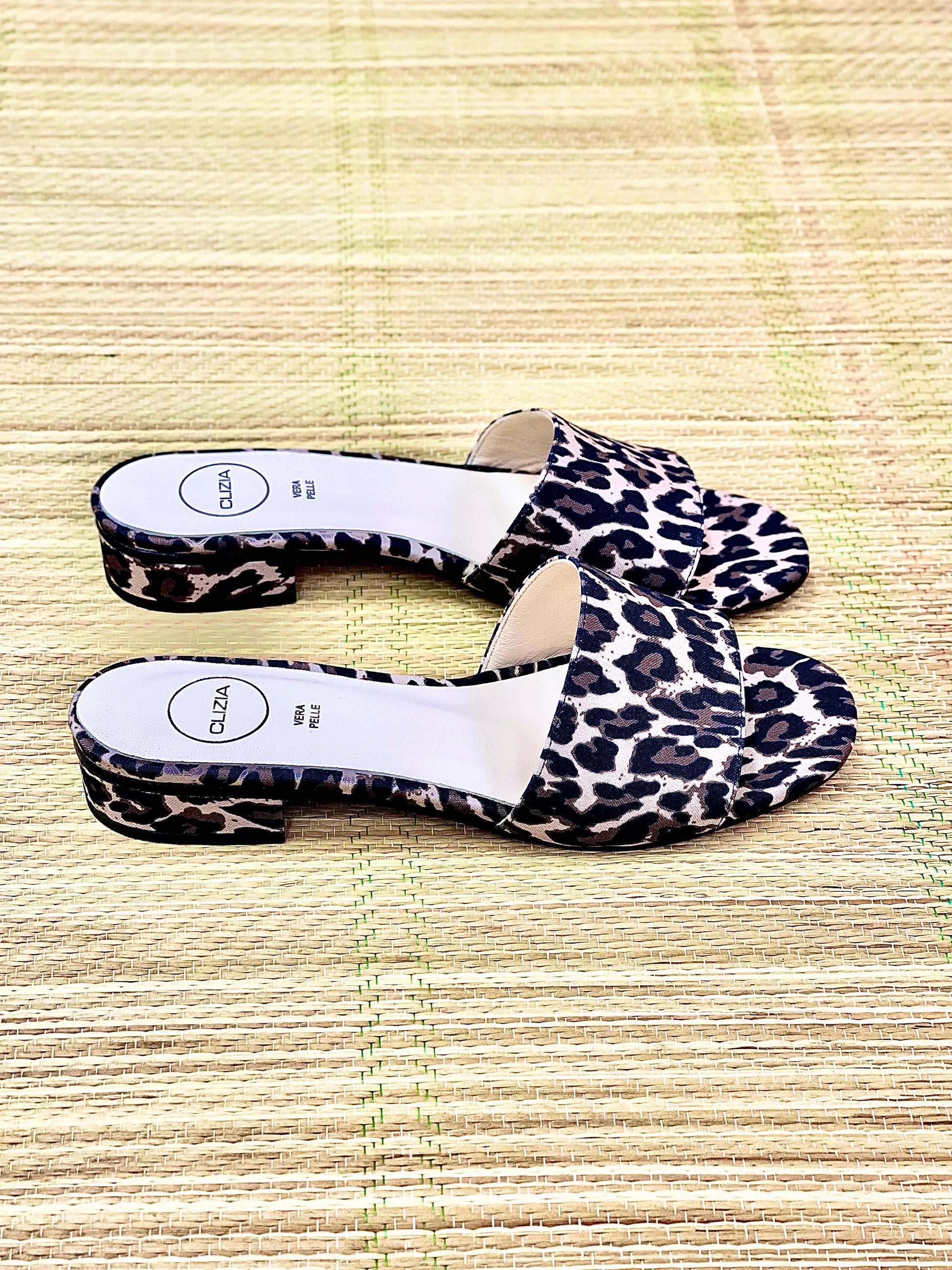 Χαμηλά σανδάλια μούλες από ύφασμα με animalier μοτίβο και φαρδύ τακούνι 2 cm.