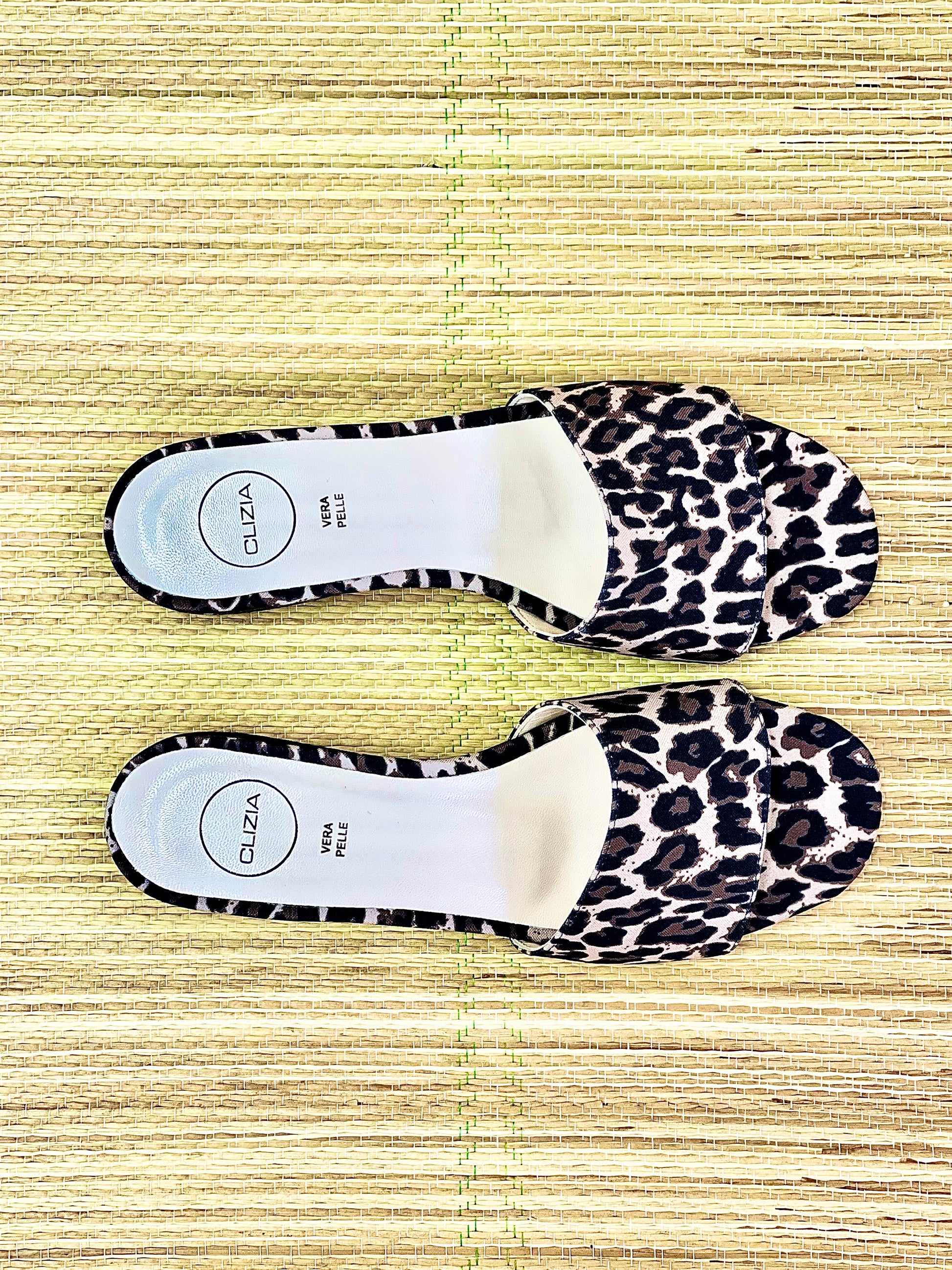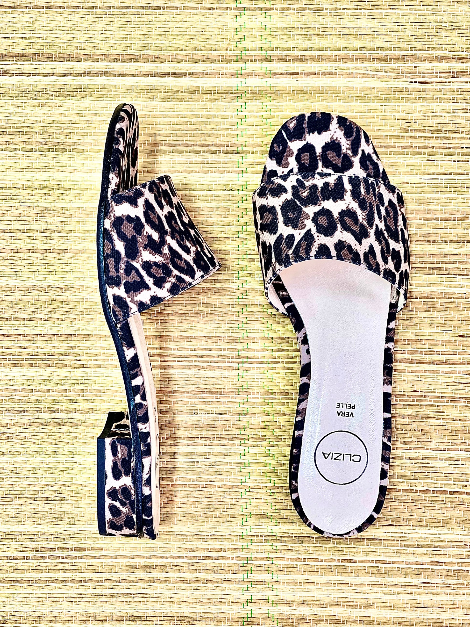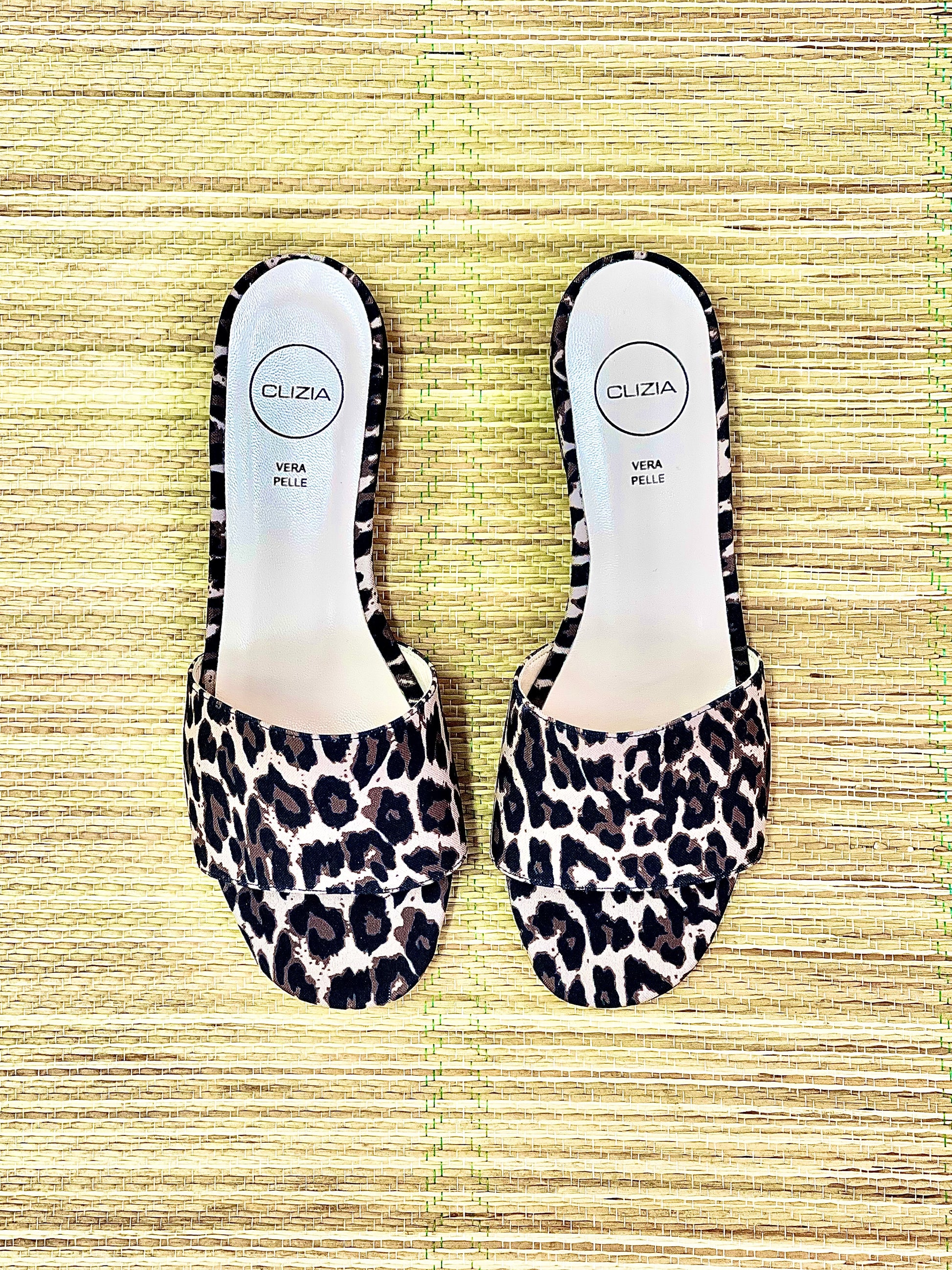 Χαμηλά σανδάλια μούλες από ύφασμα με animalier μοτίβο και φαρδύ τακούνι 2 cm.
