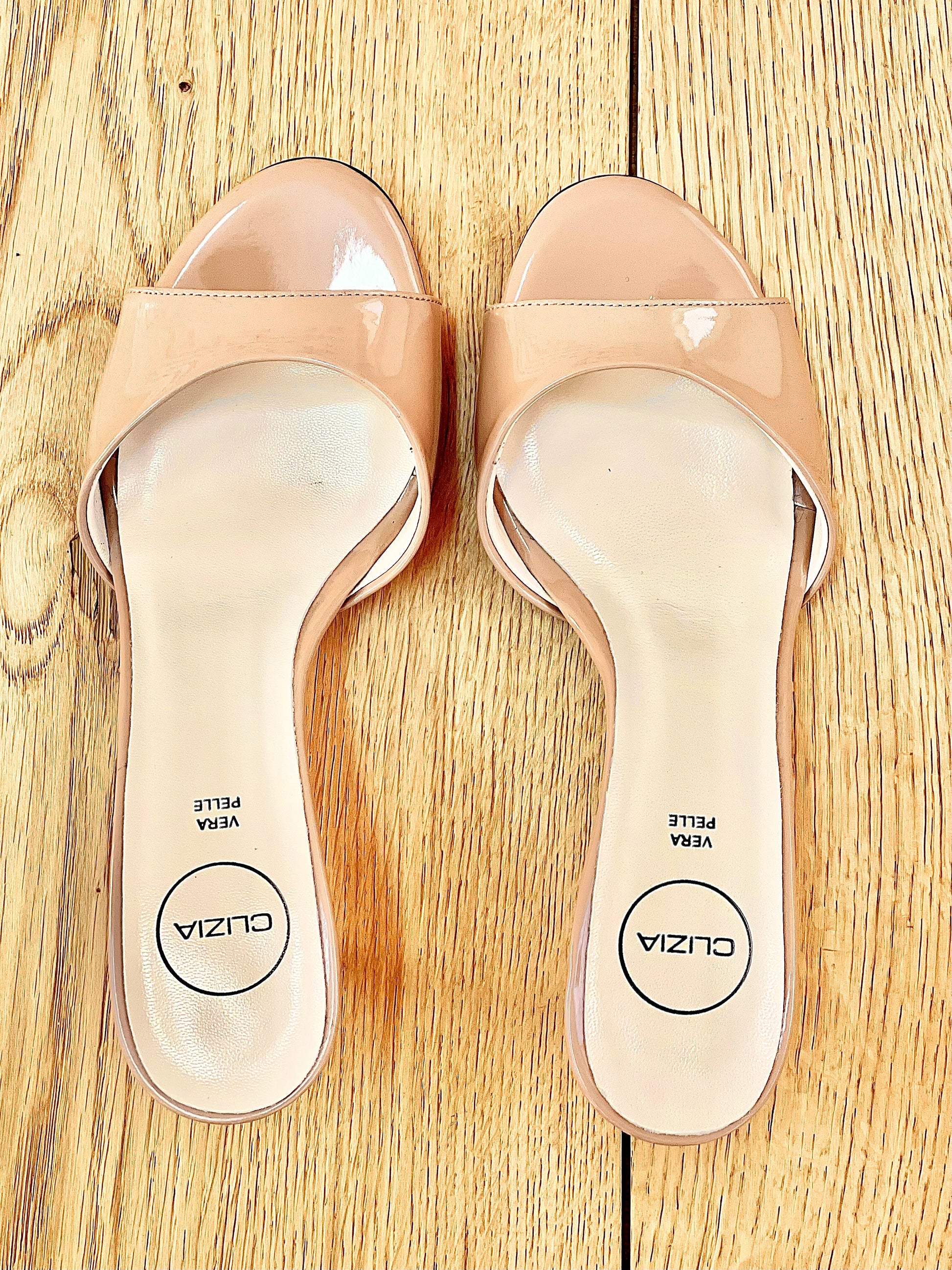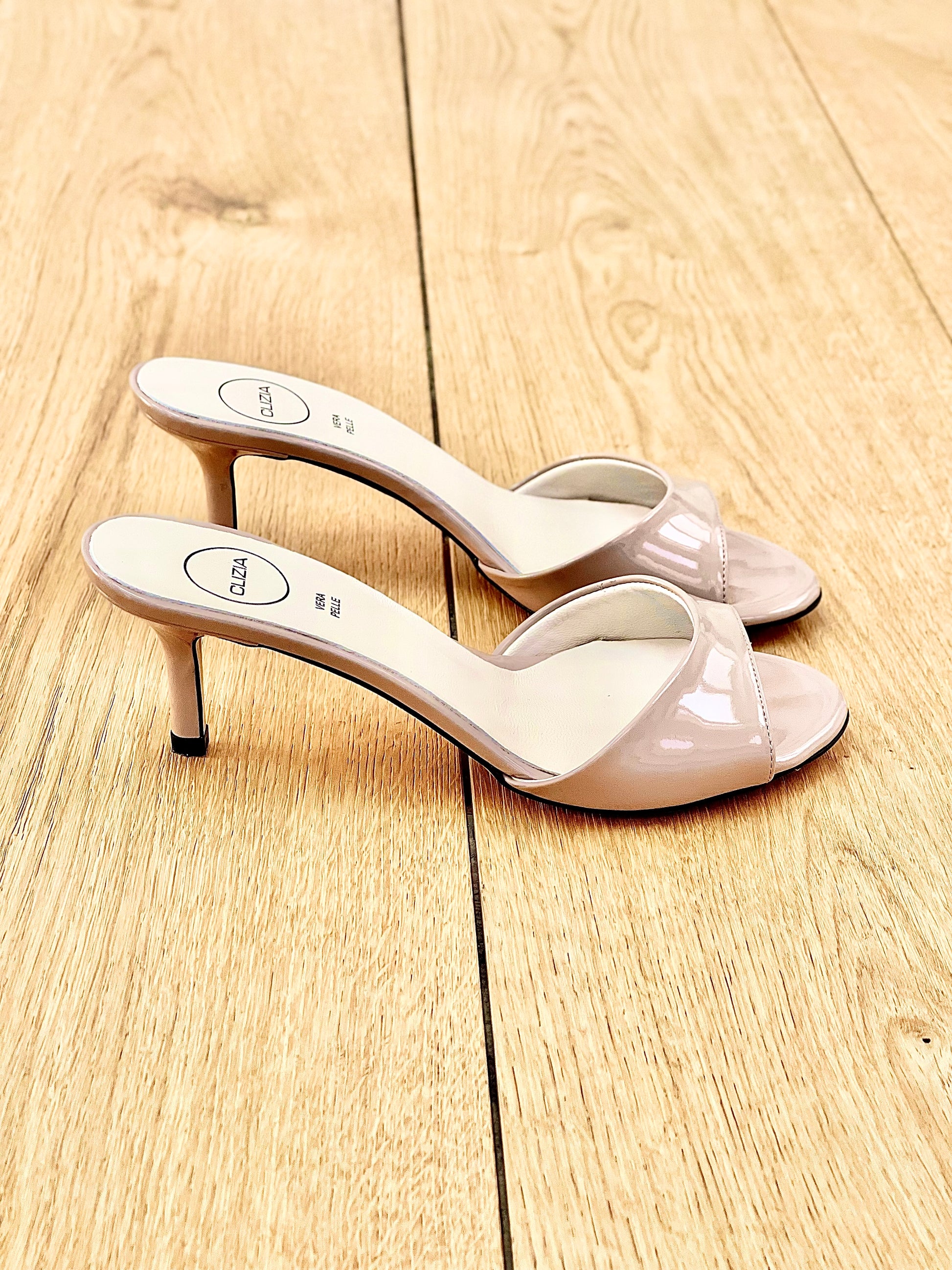 Χαμηλά σανδάλια μούλες από βερνίκι με τακούνι 6 εκατοστά.