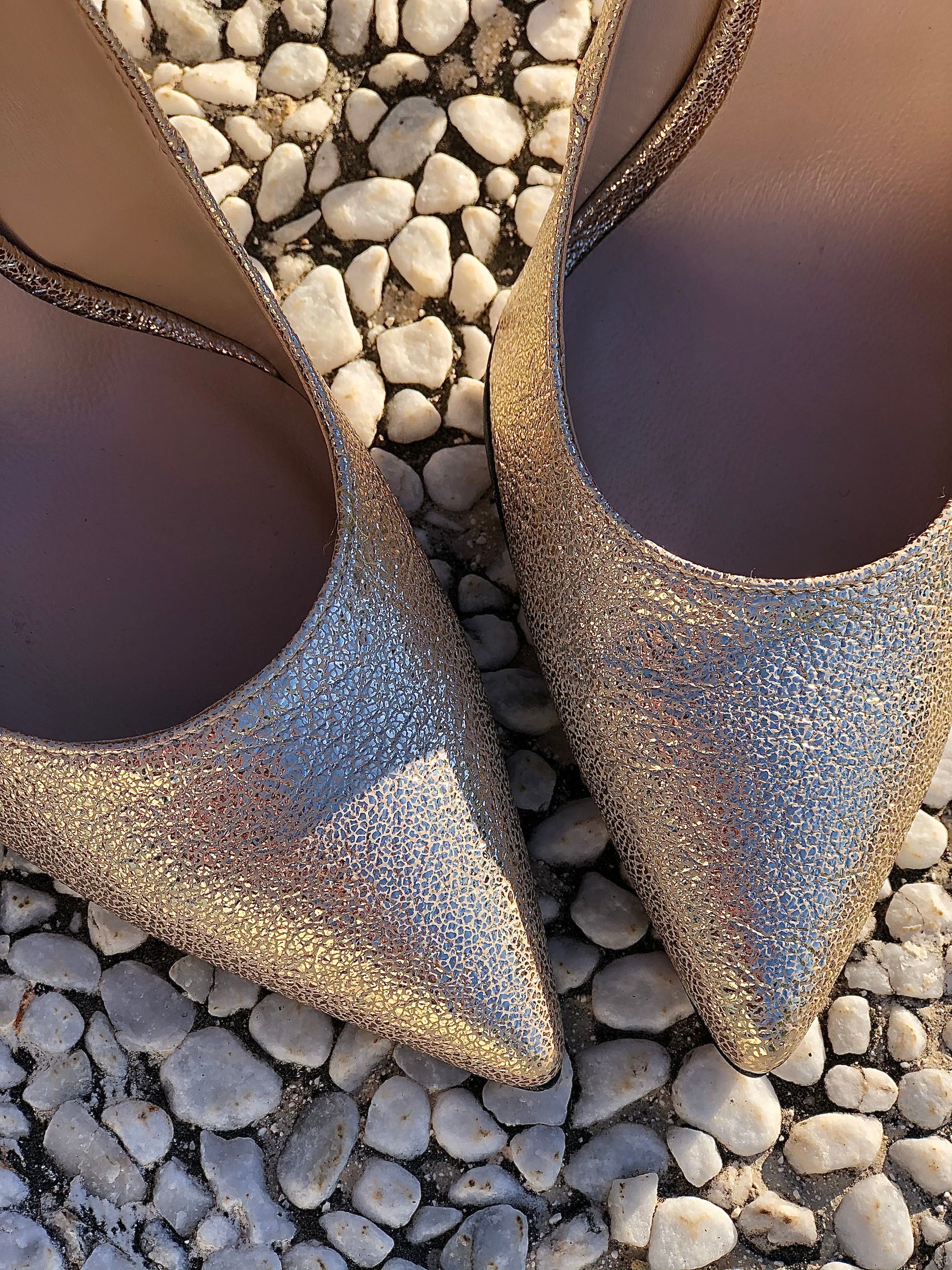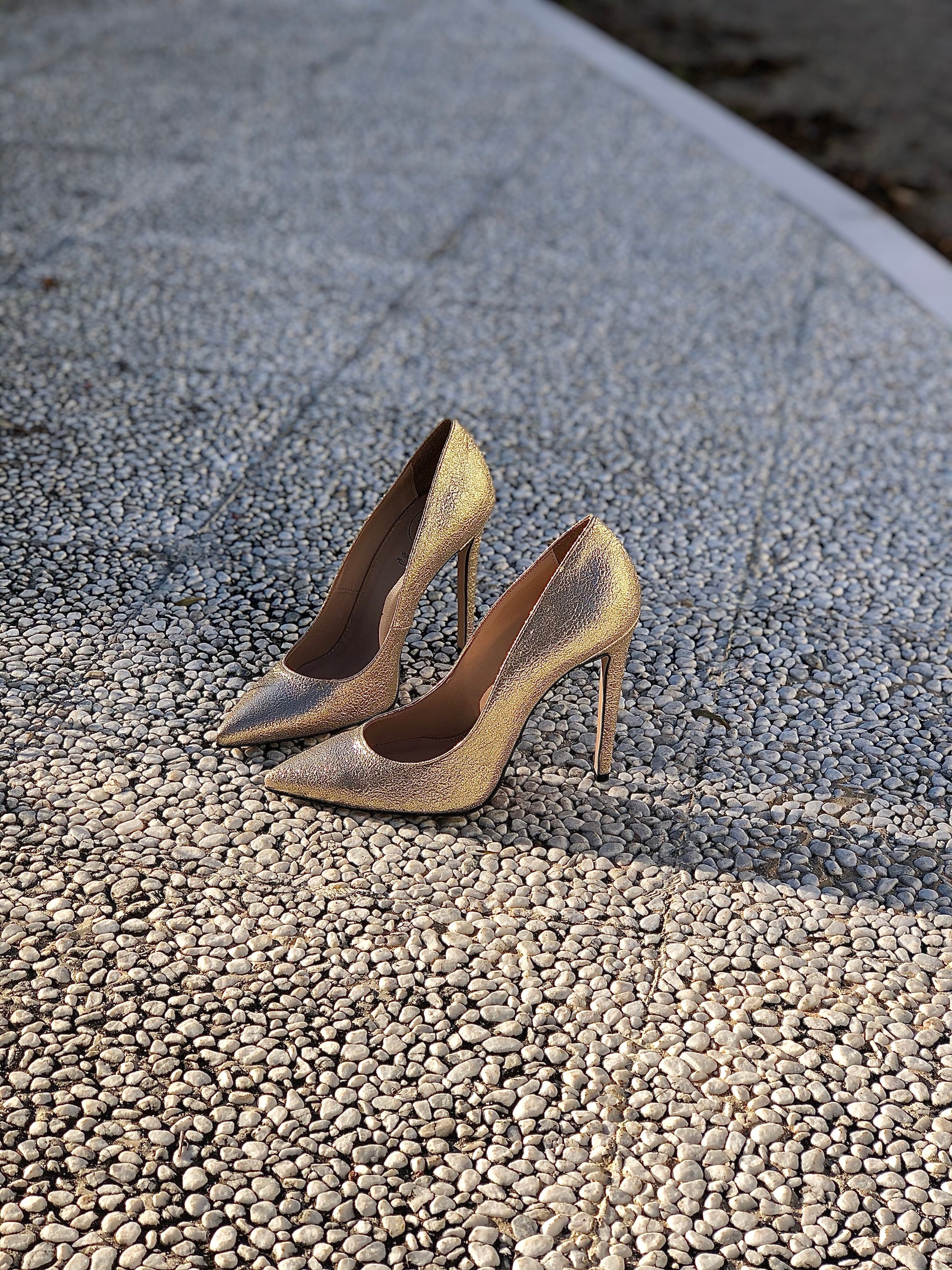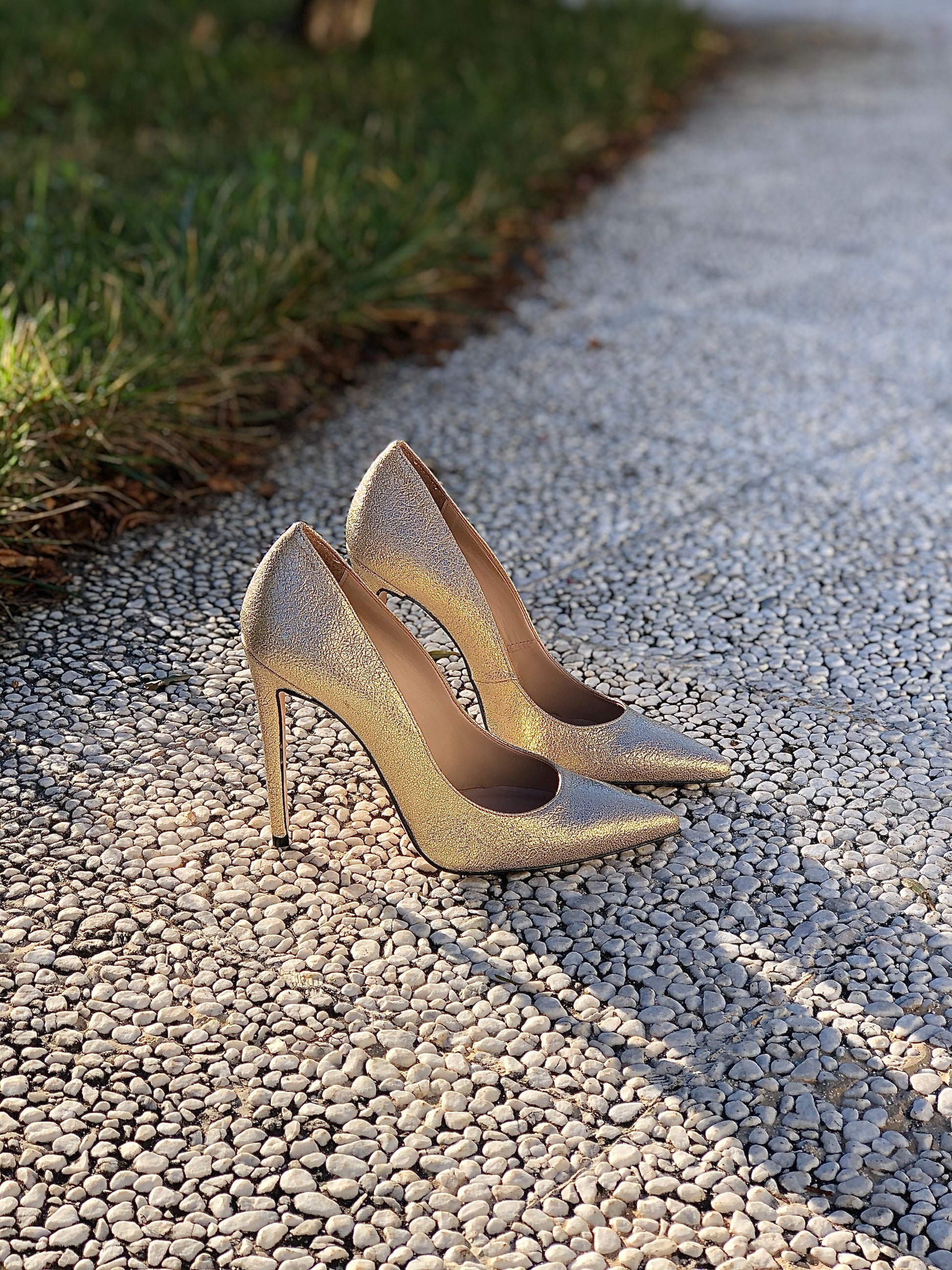Γόβες με λεπτή μύτη από χρυσό λαμινέ με τακούνι 10 εκ.