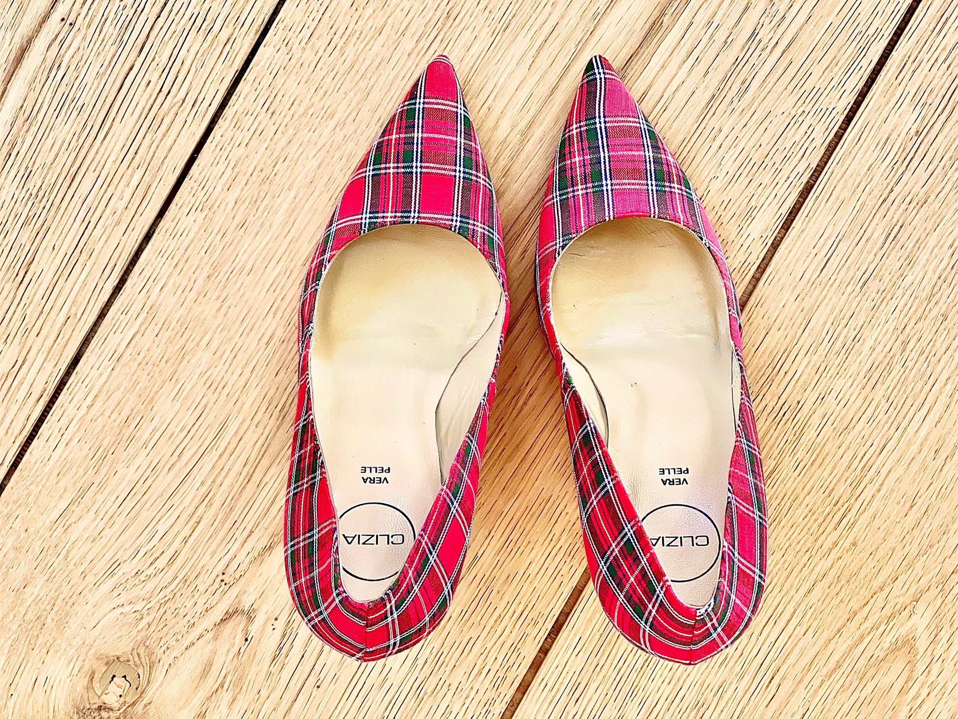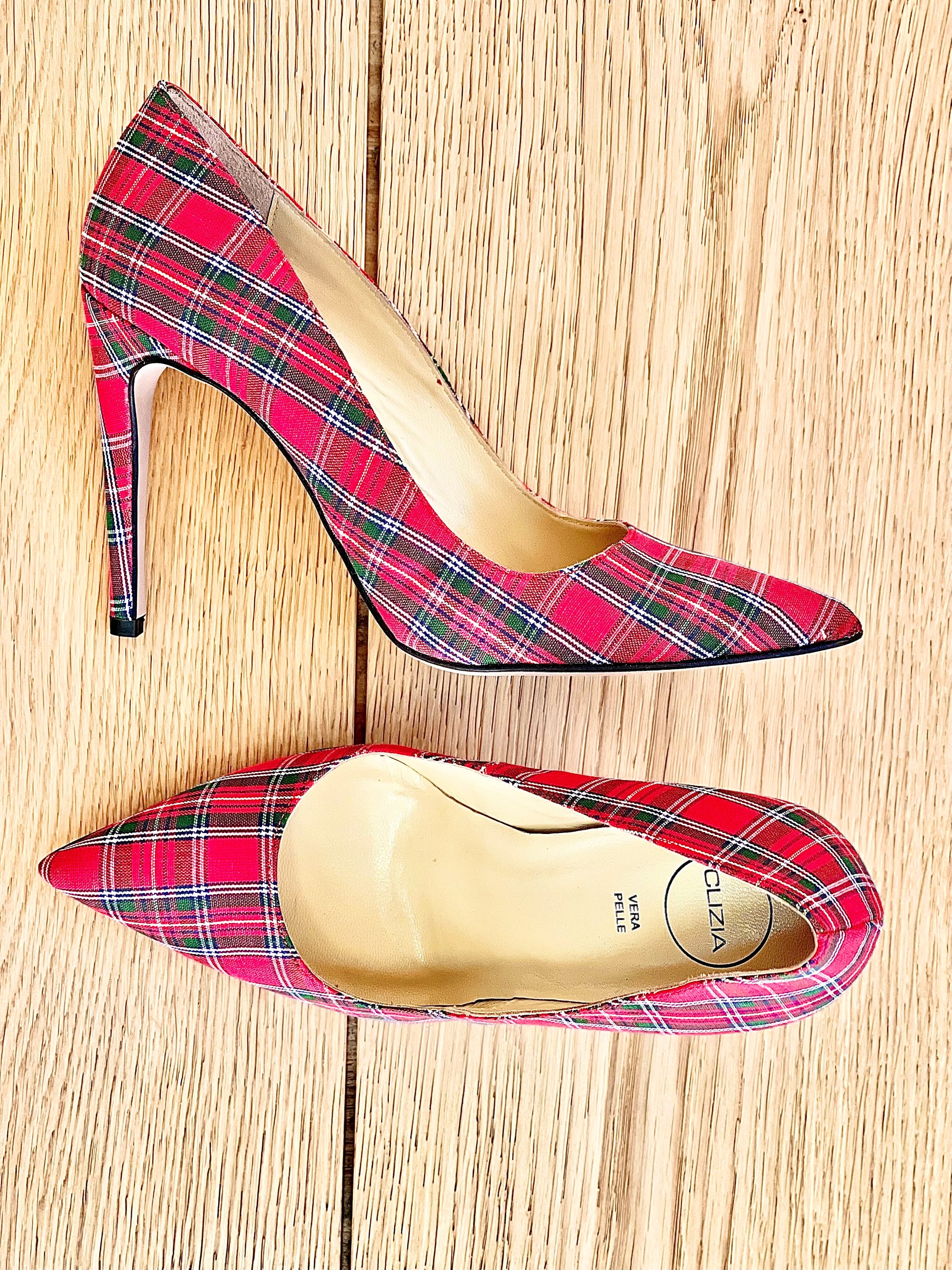 Ανοιχτά γόβα με στρογγυλή μύτη σε καρό μοτίβο και τακούνι 10 εκ.