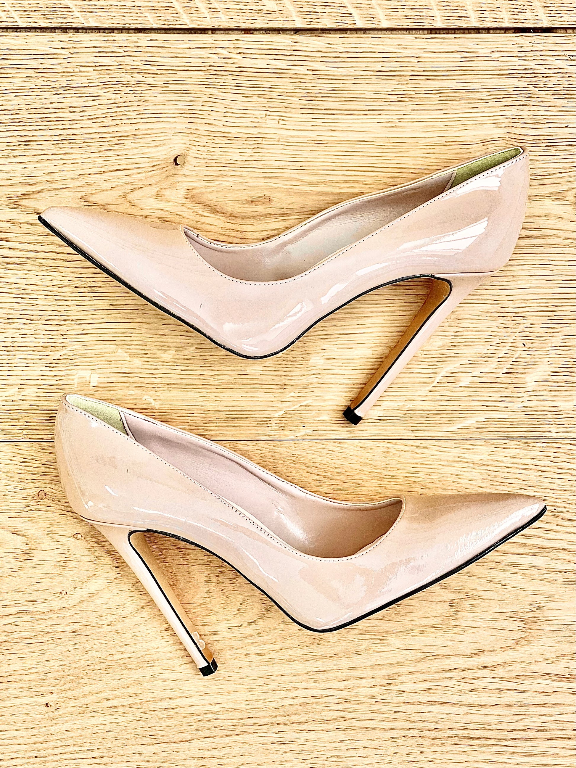 Ανοιχτά γόβα με μυτερή μύτη από βερνίκι και ψηλό τακούνι.