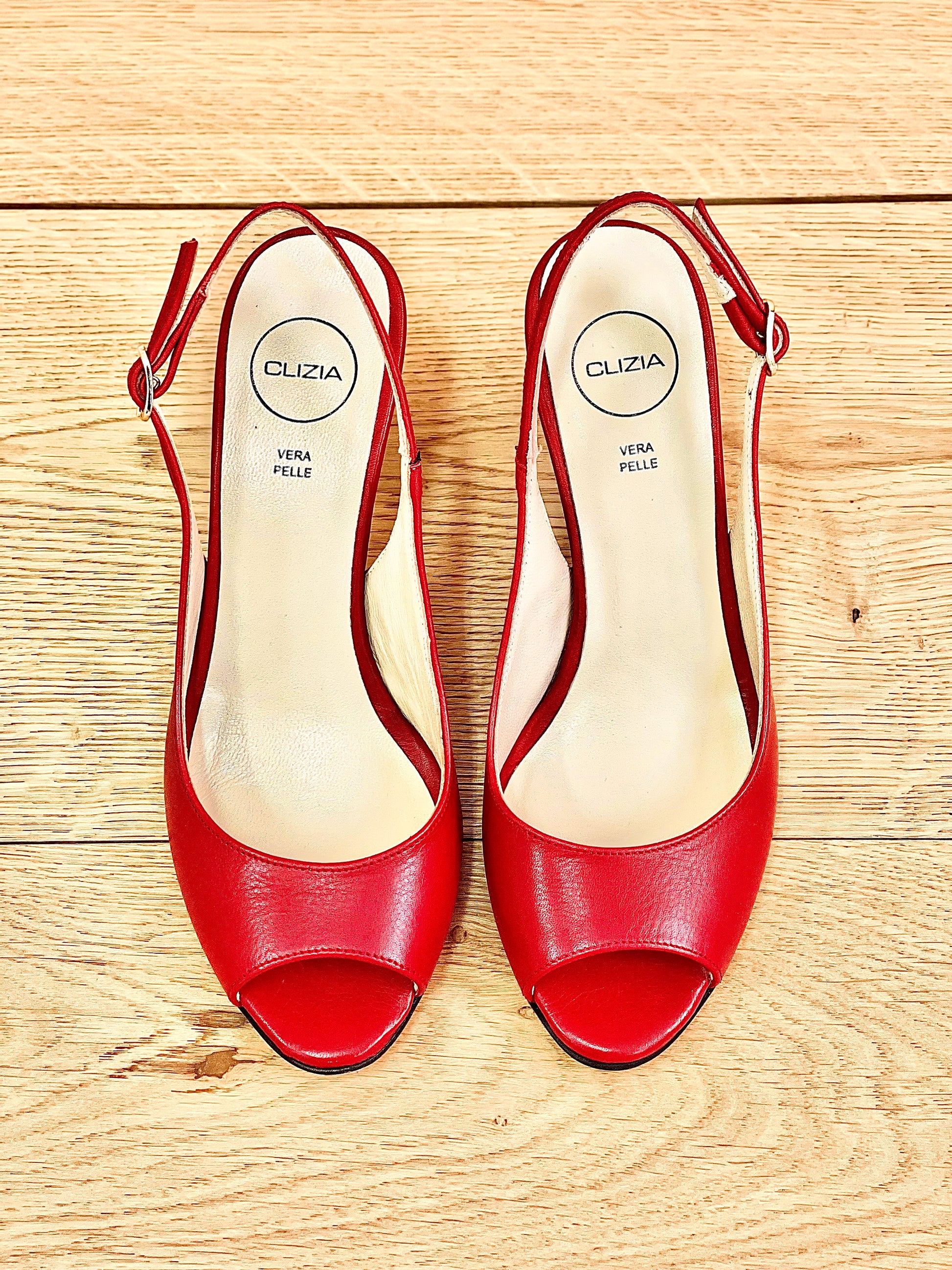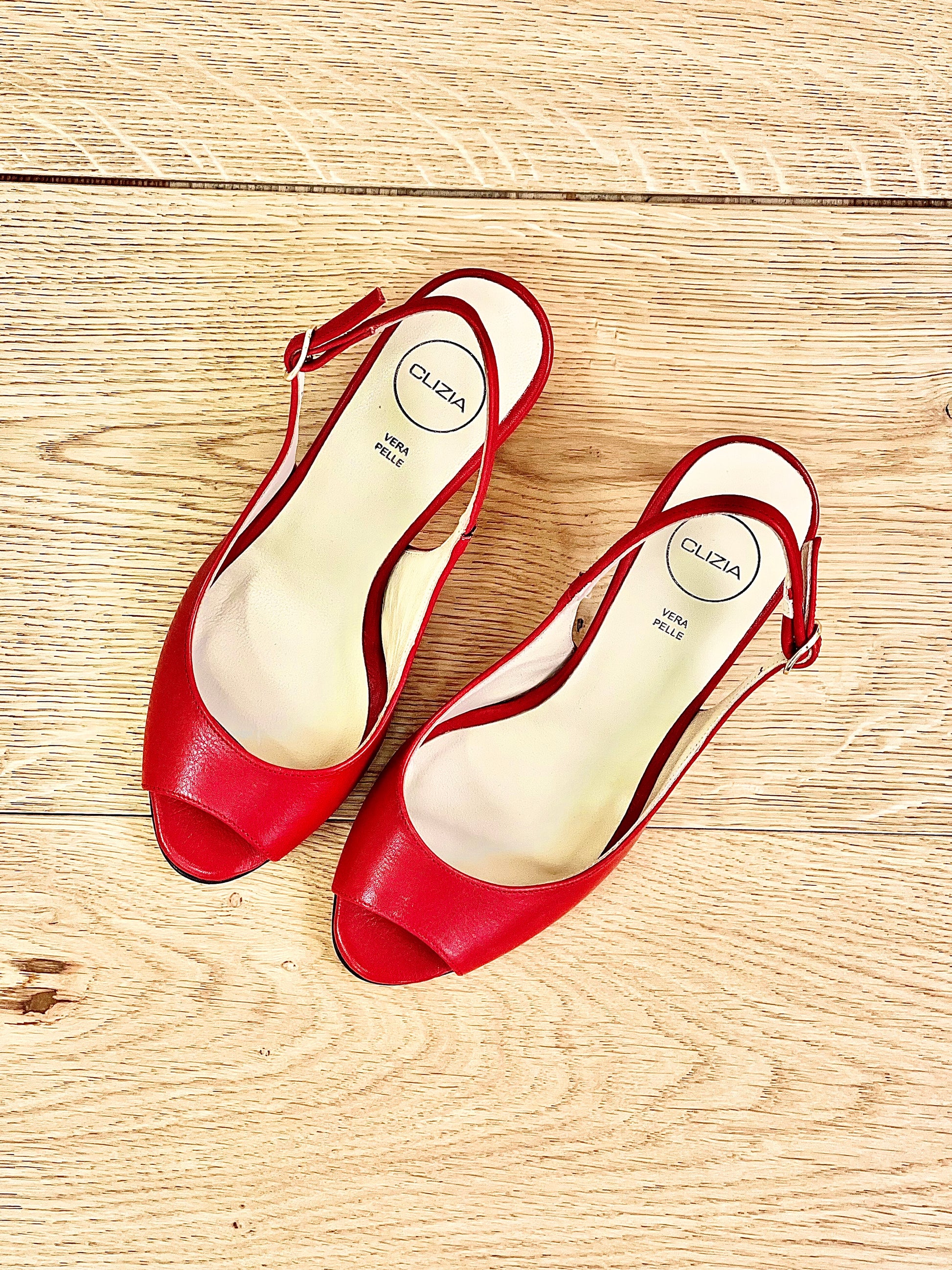 Ανοιχτά γόβα με λουράκι στο πίσω μέρος, από δέρμα, με τακούνι 7,5 εκ.