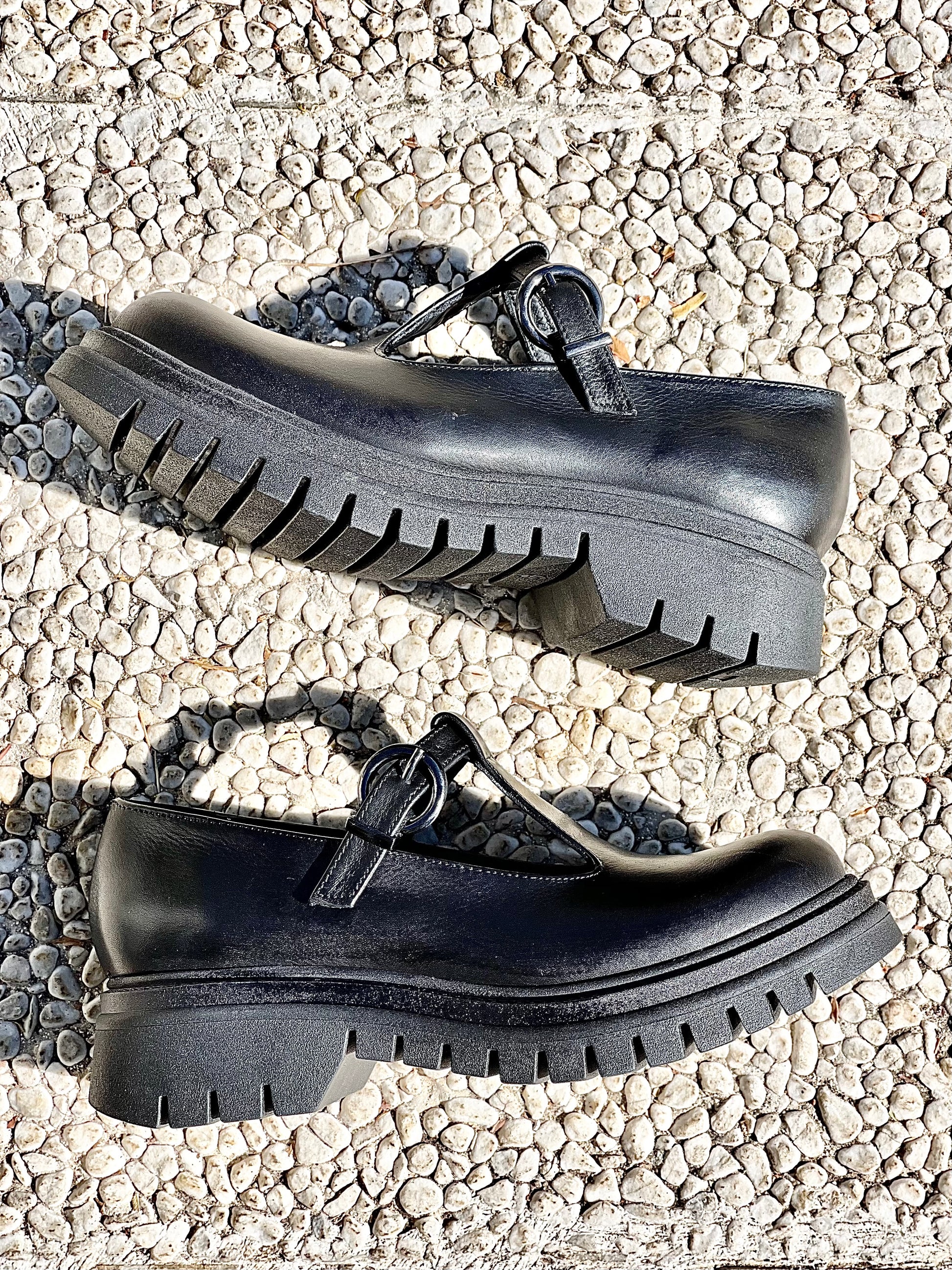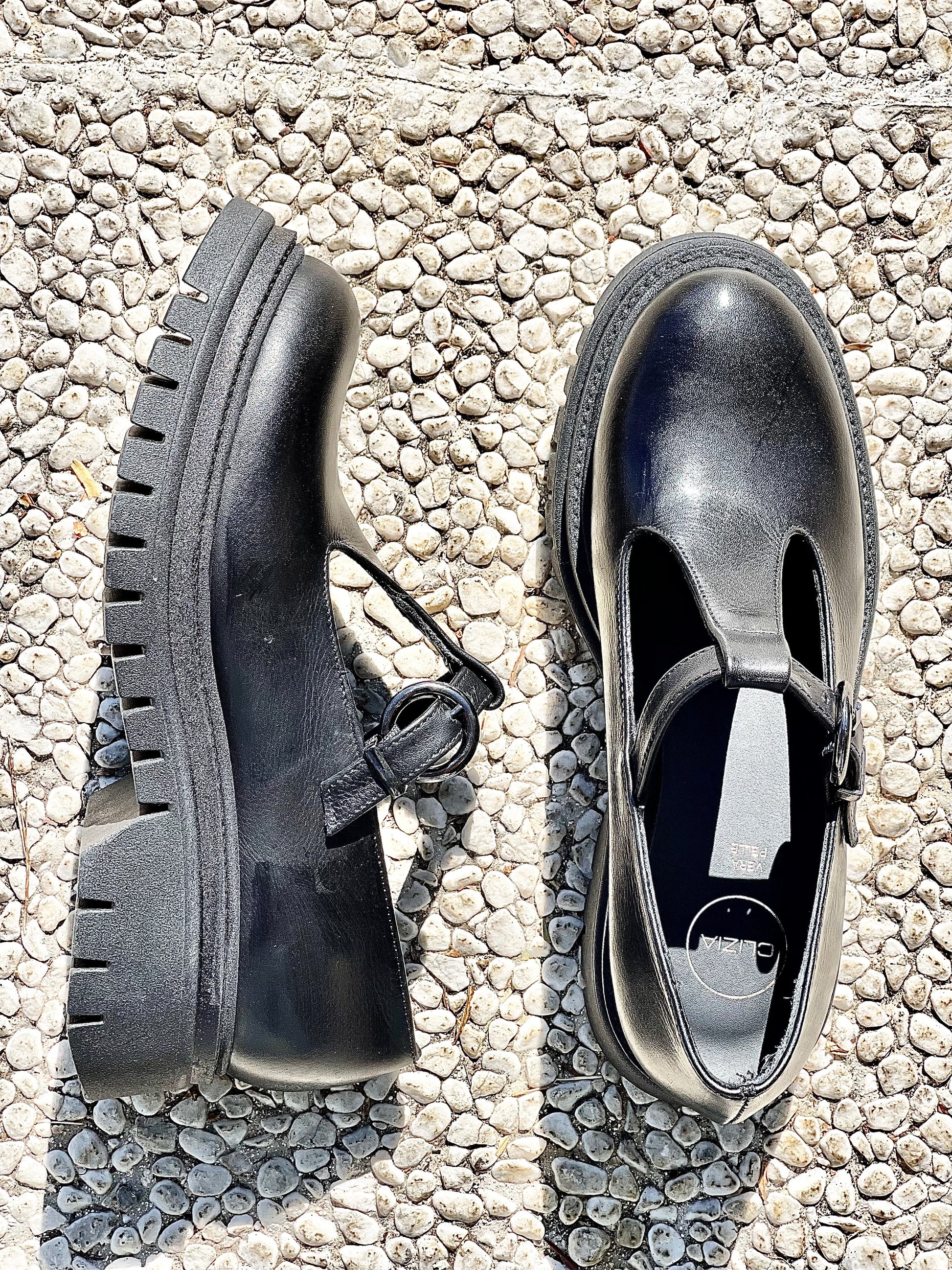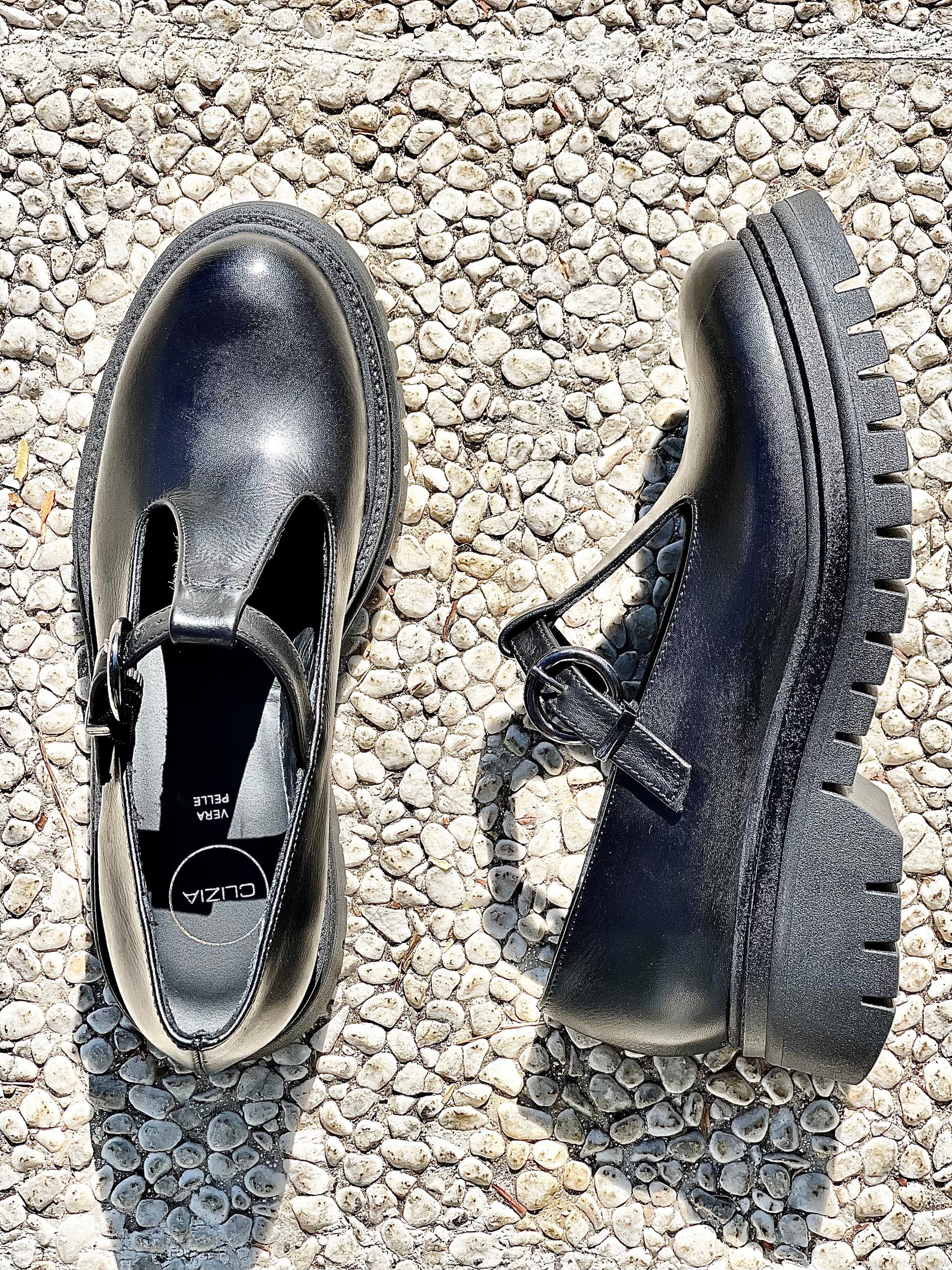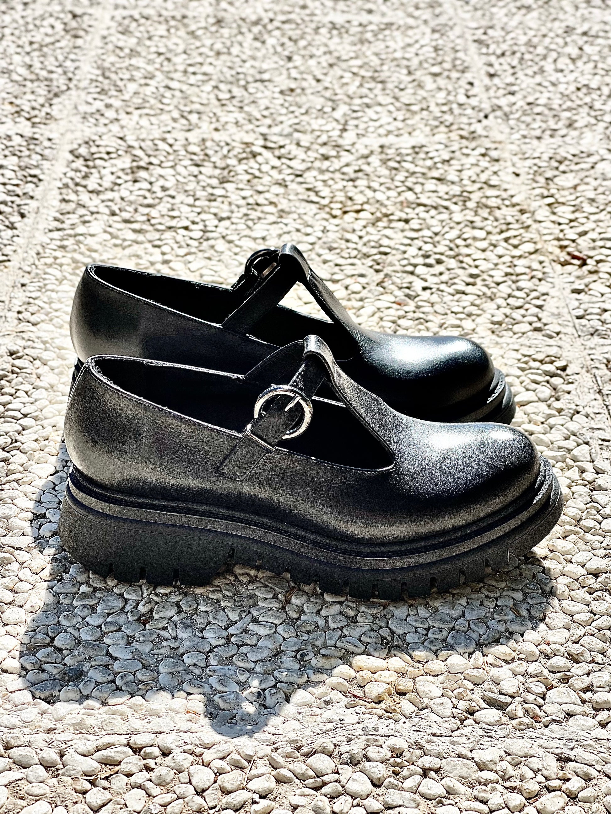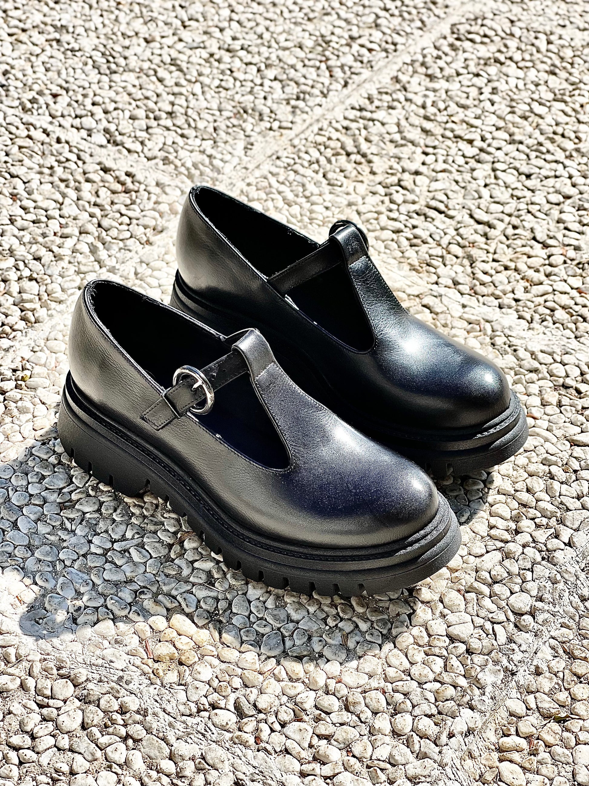 Χαμηλό δερμάτινο παπούτσι με λουράκι μπροστά και τακούνι 3 cm.