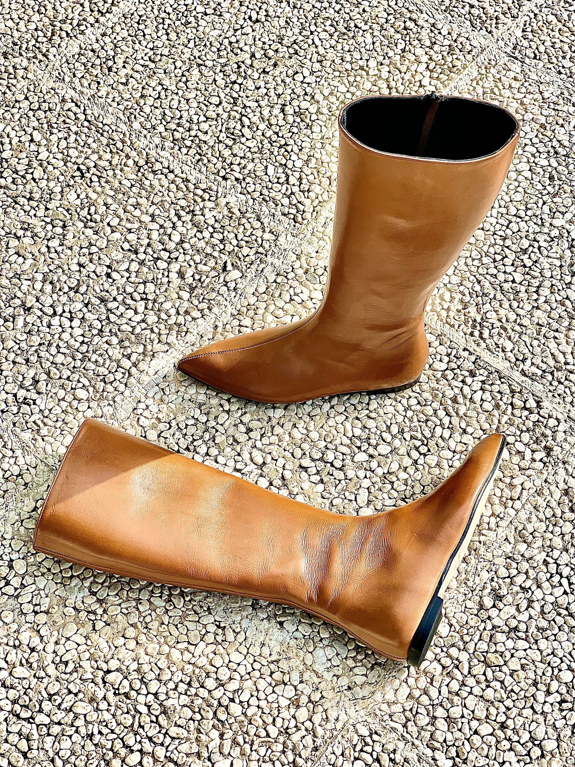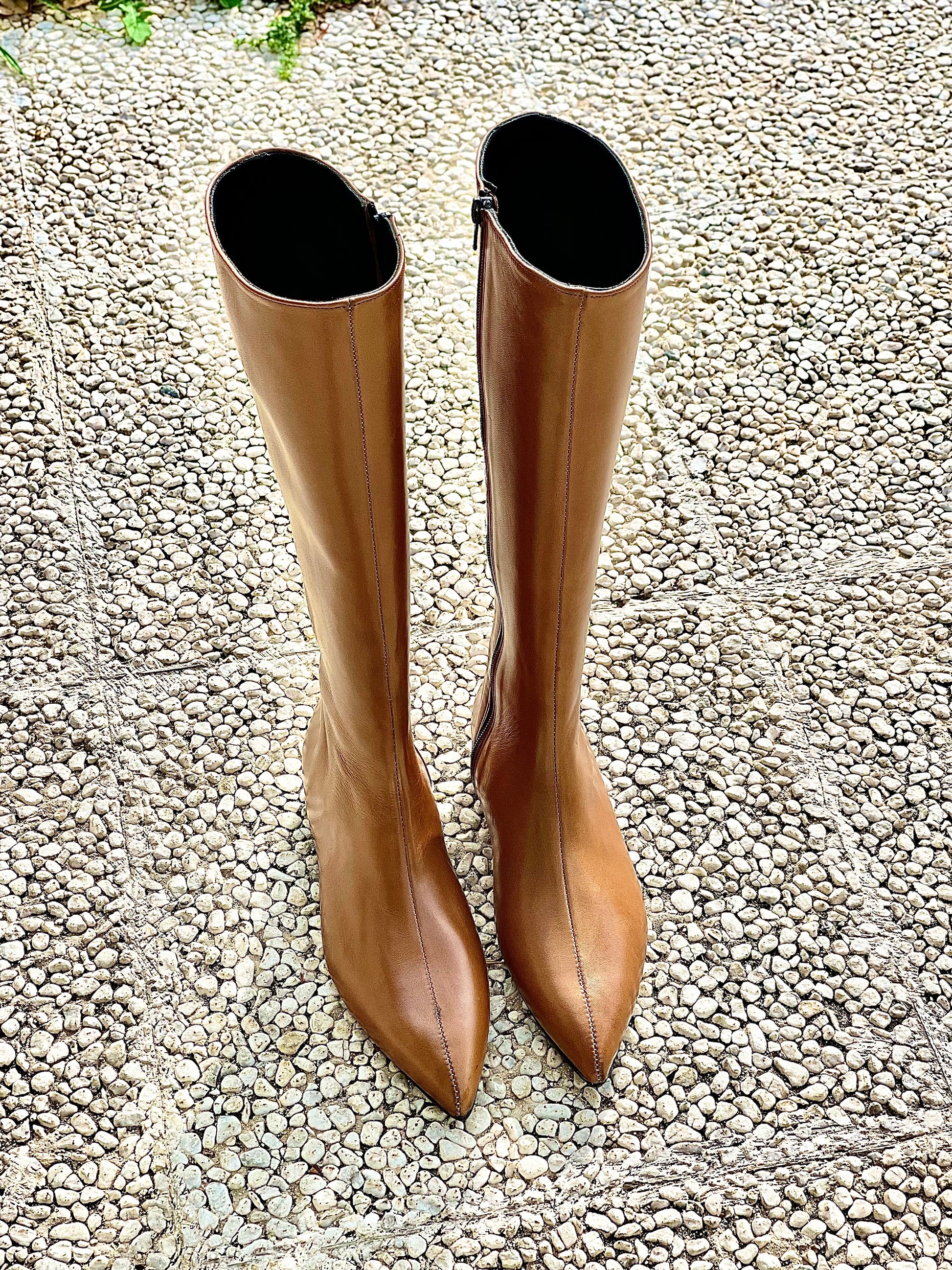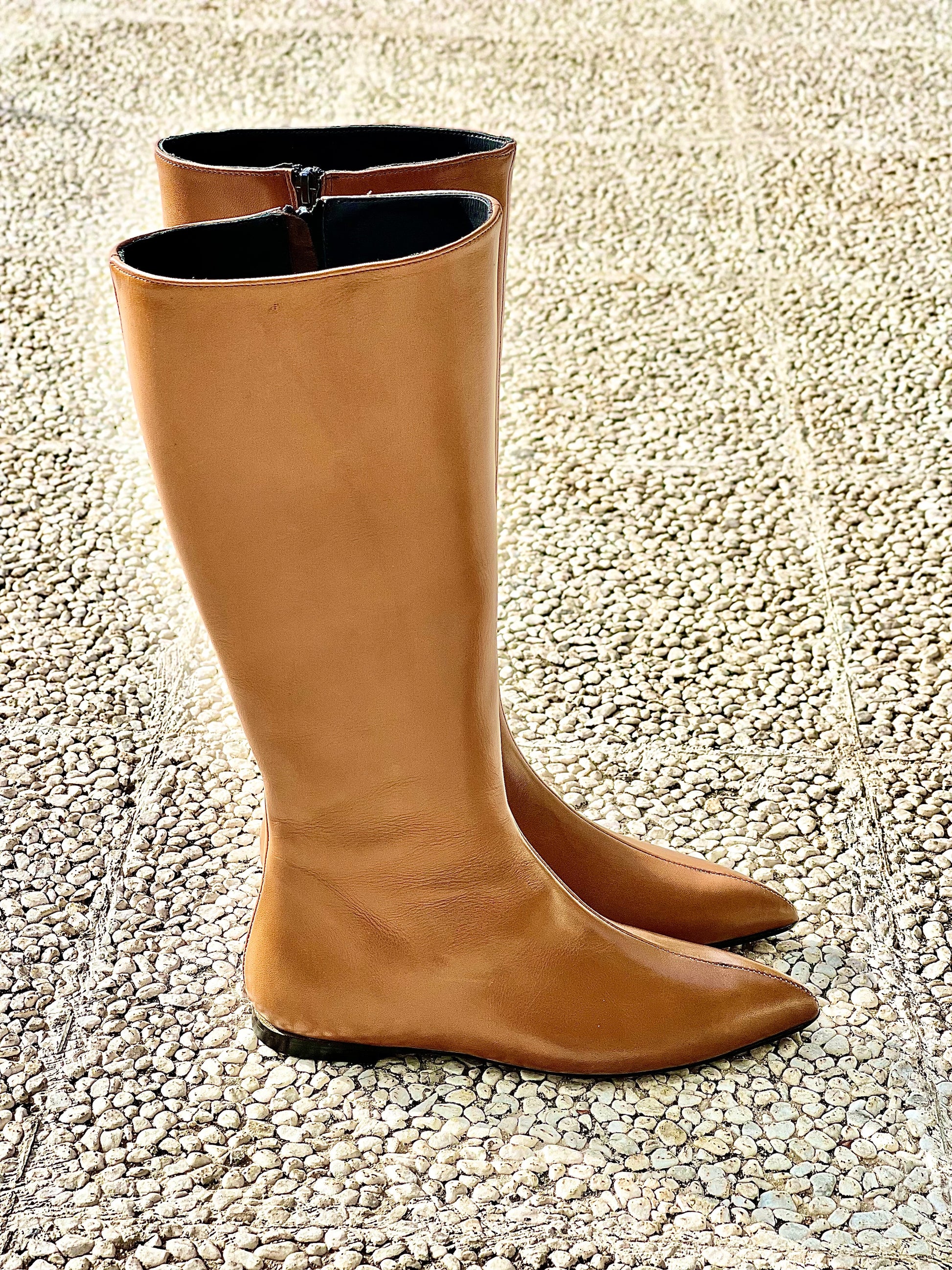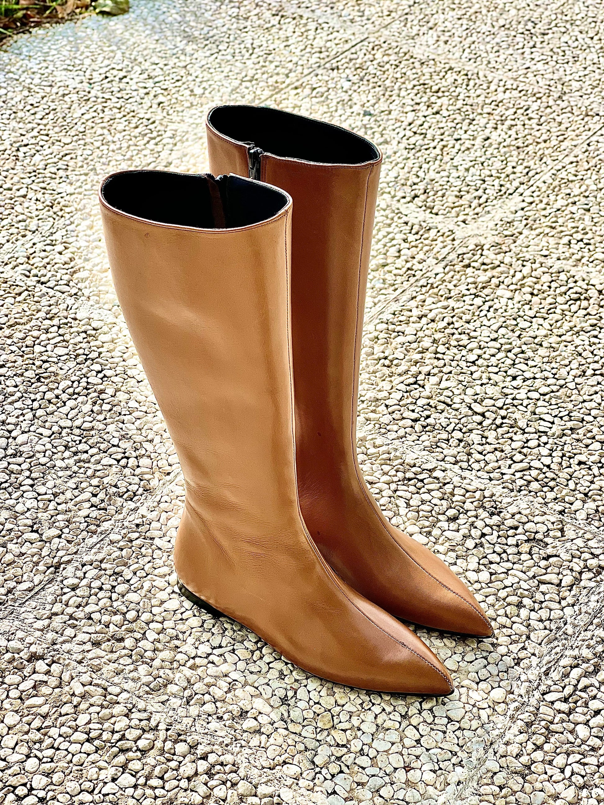 Μπότες με μυτερή μύτη από δέρμα, τακούνι 1 cm.