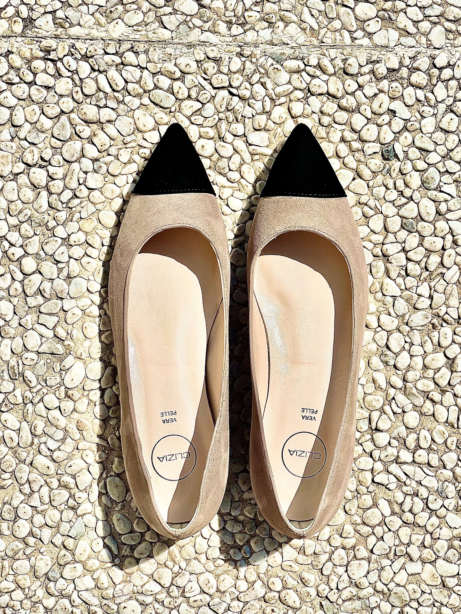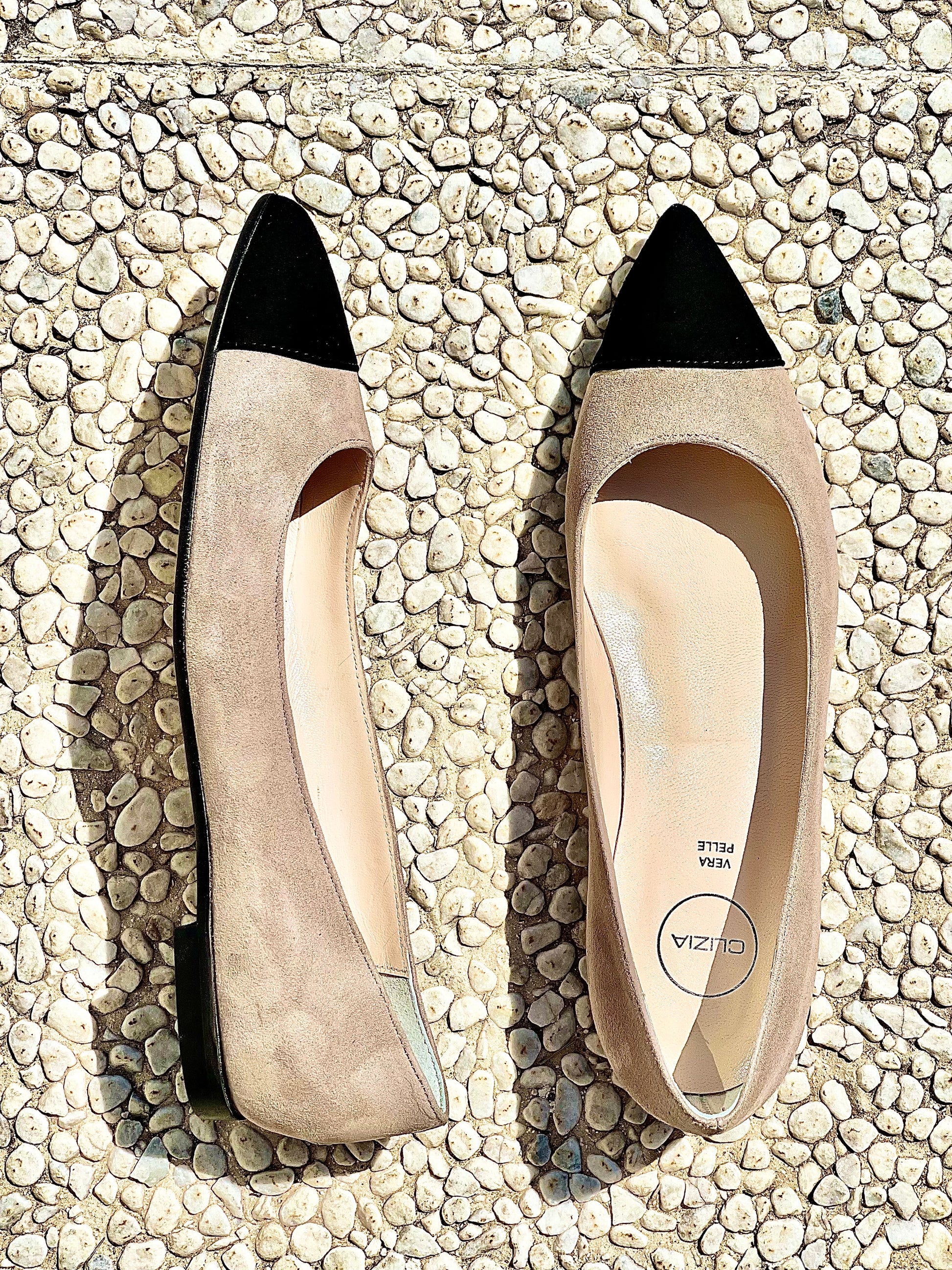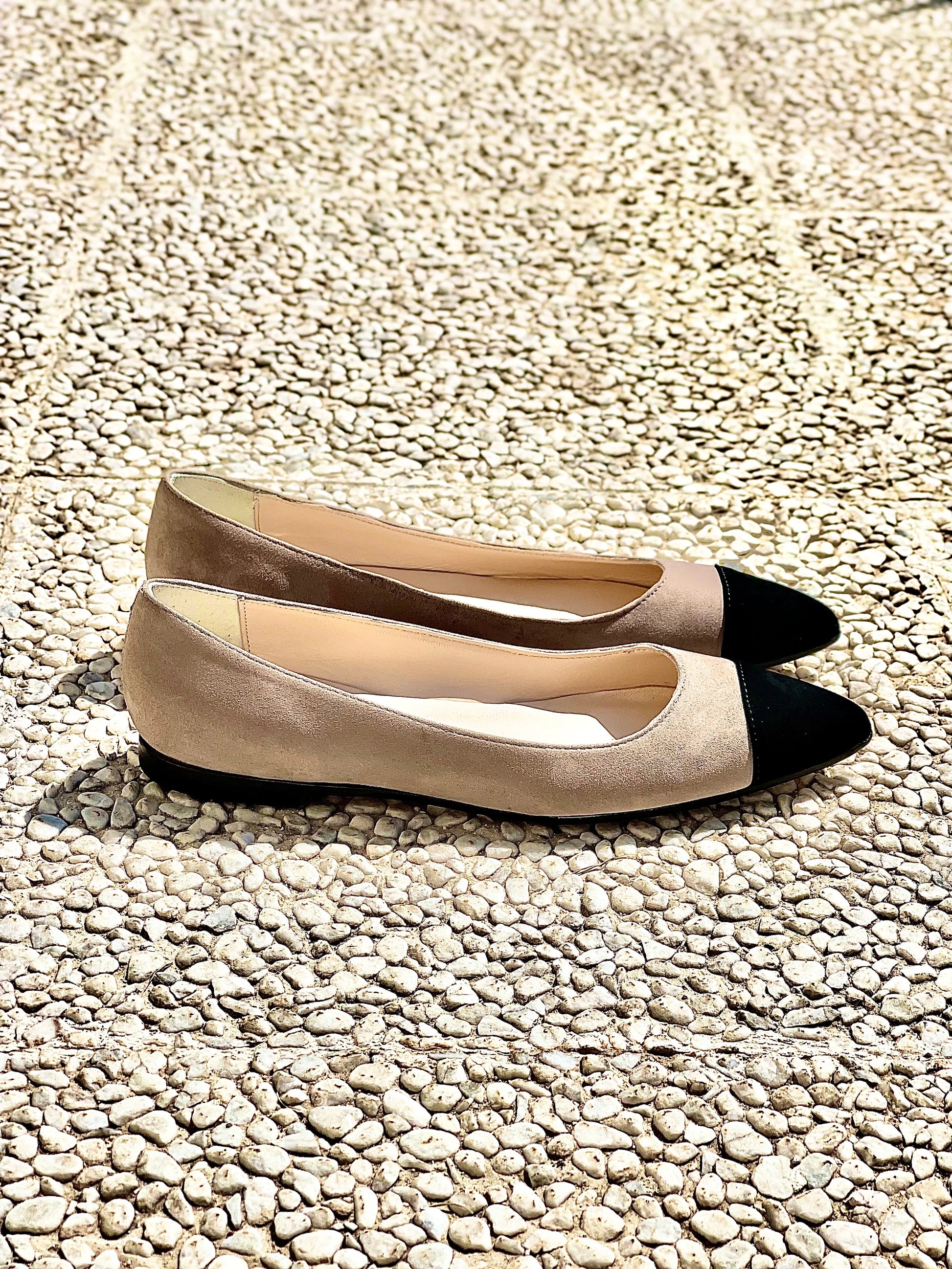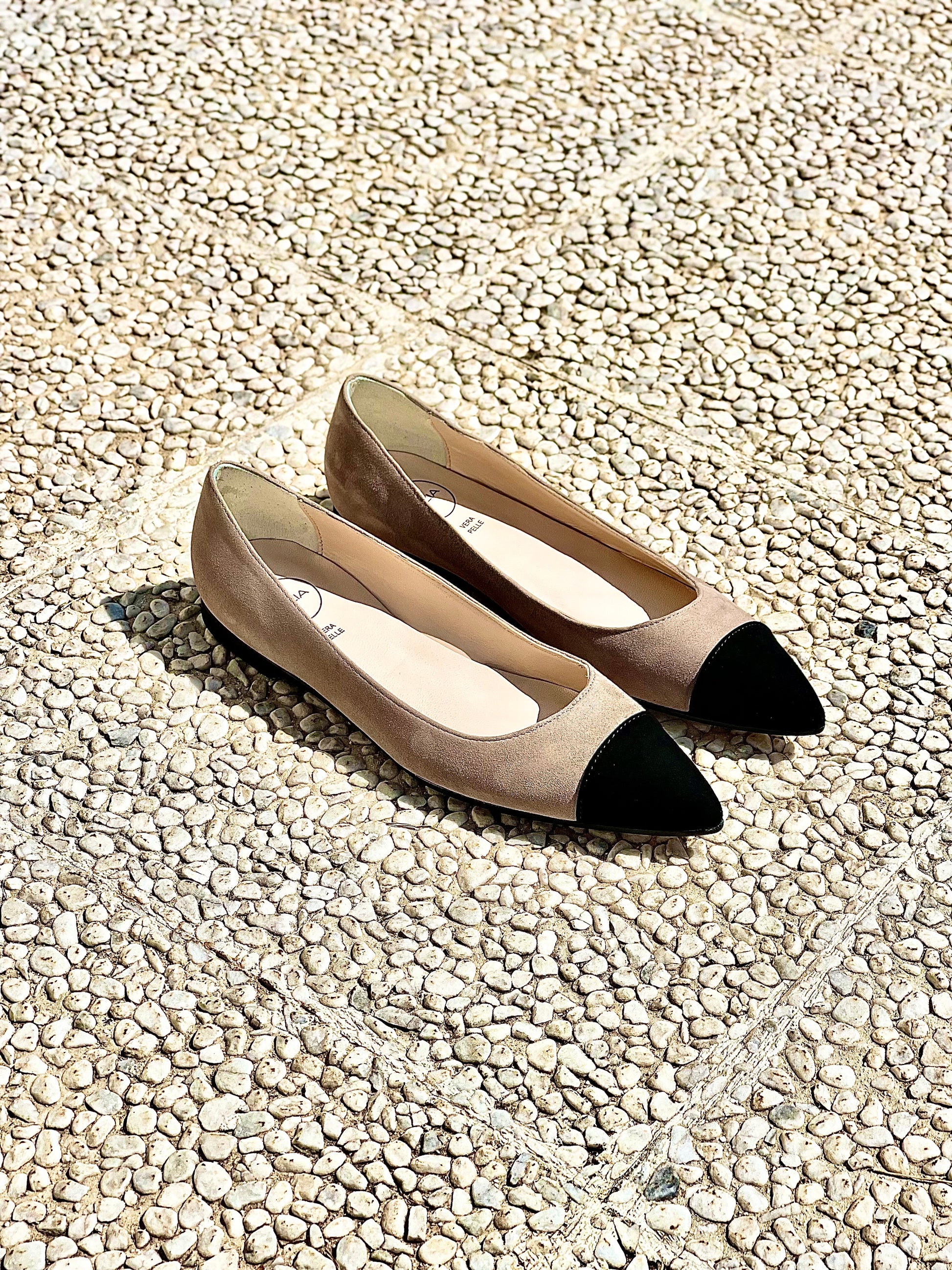 Δίχρωμες μπαλαρίνες σε nude και μαύρο χρώμα με μυτερή μύτη από σουέτ, τακούνι 1 εκ.