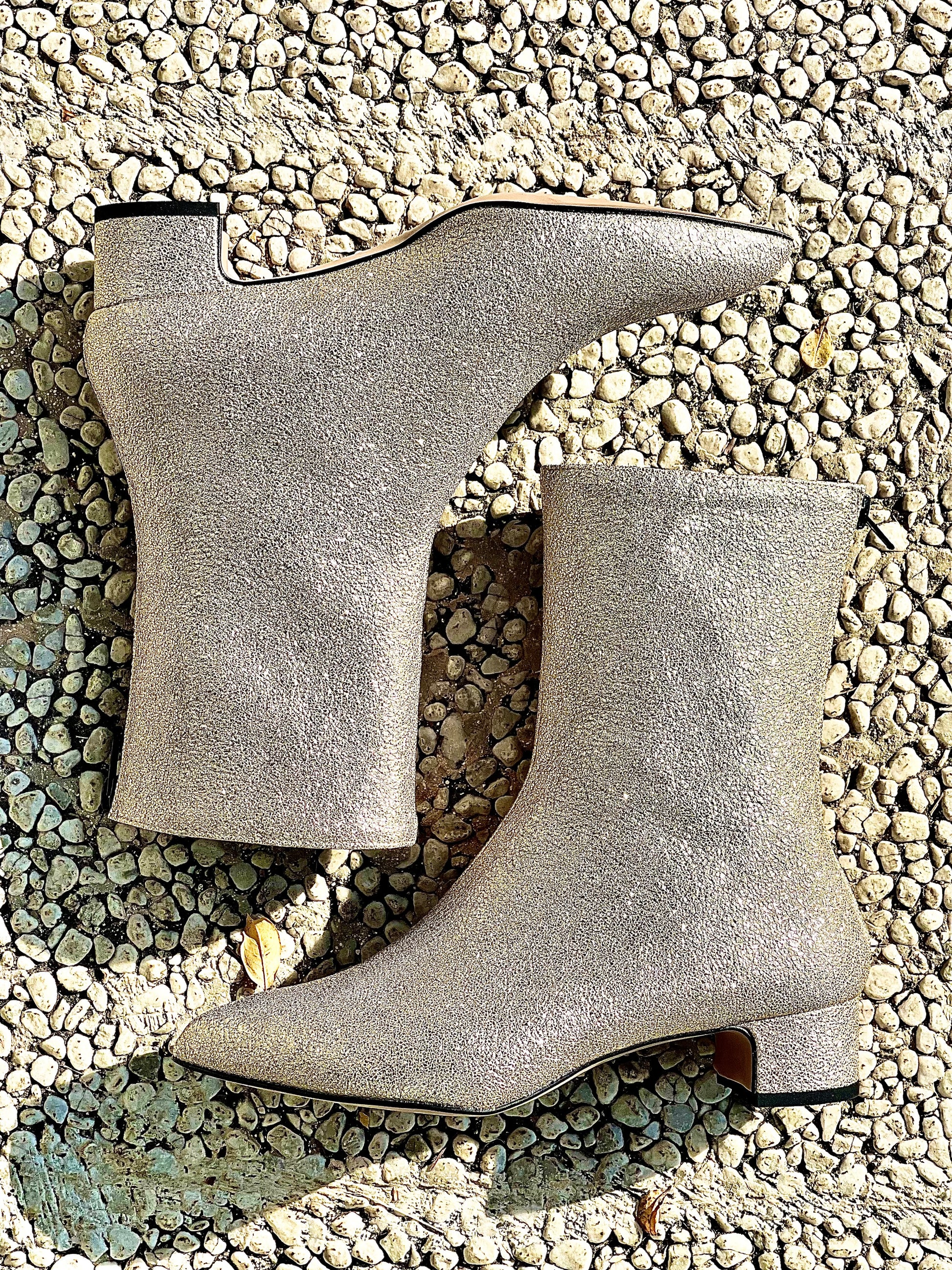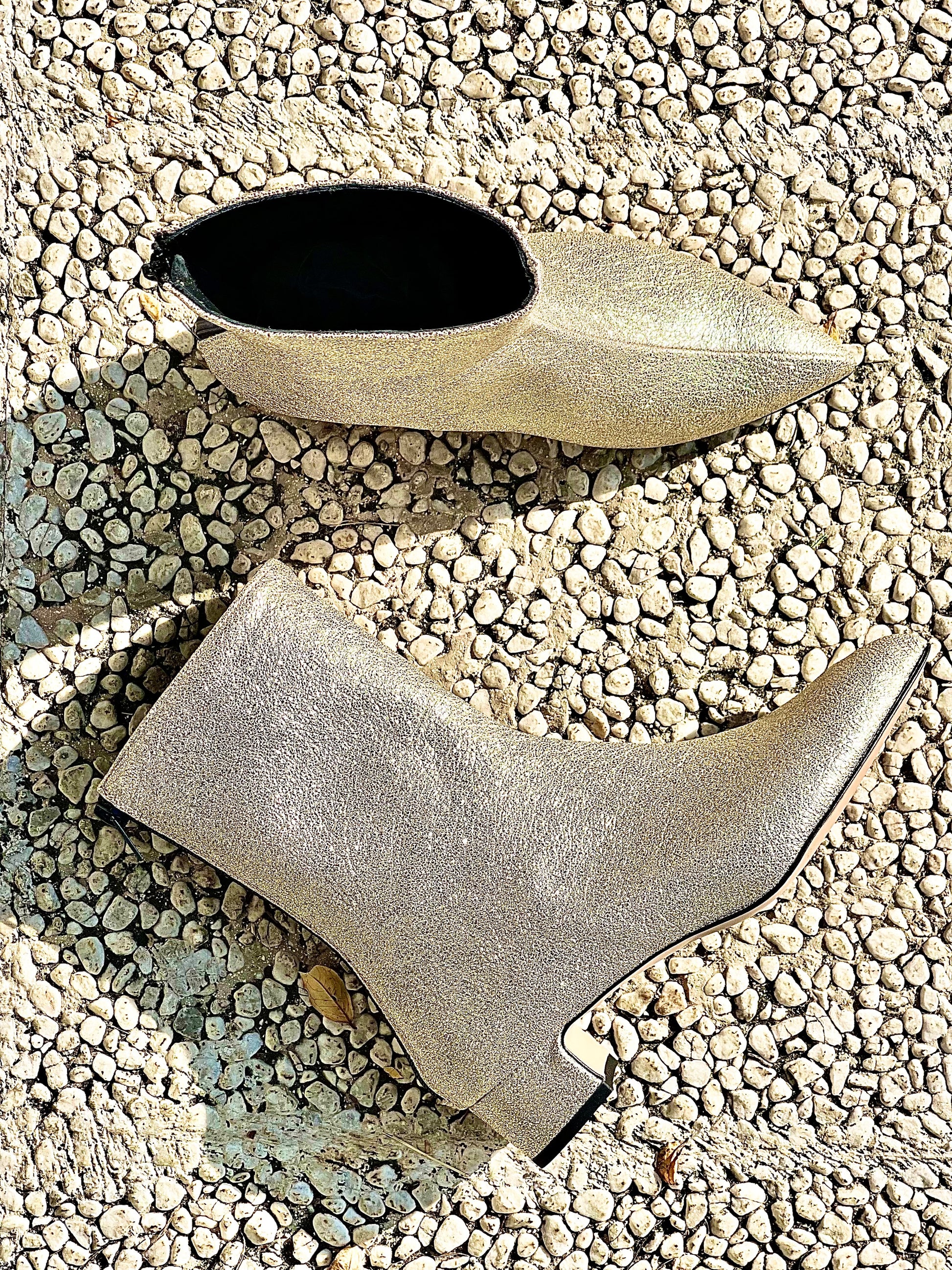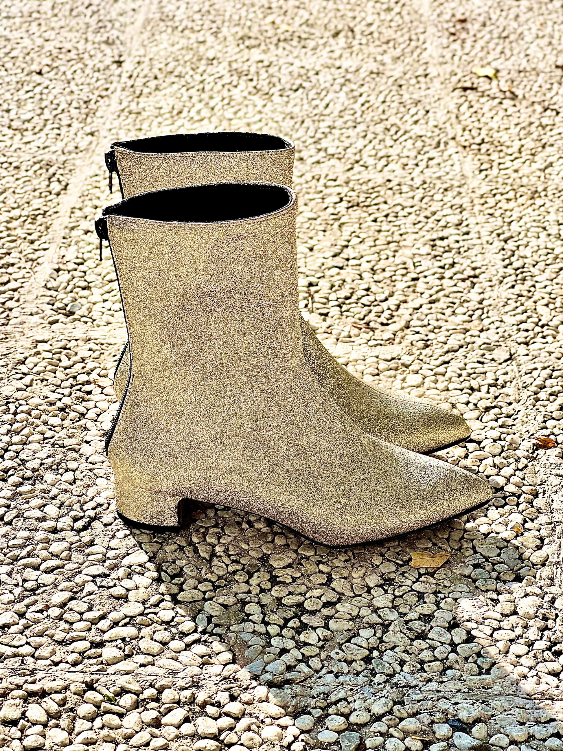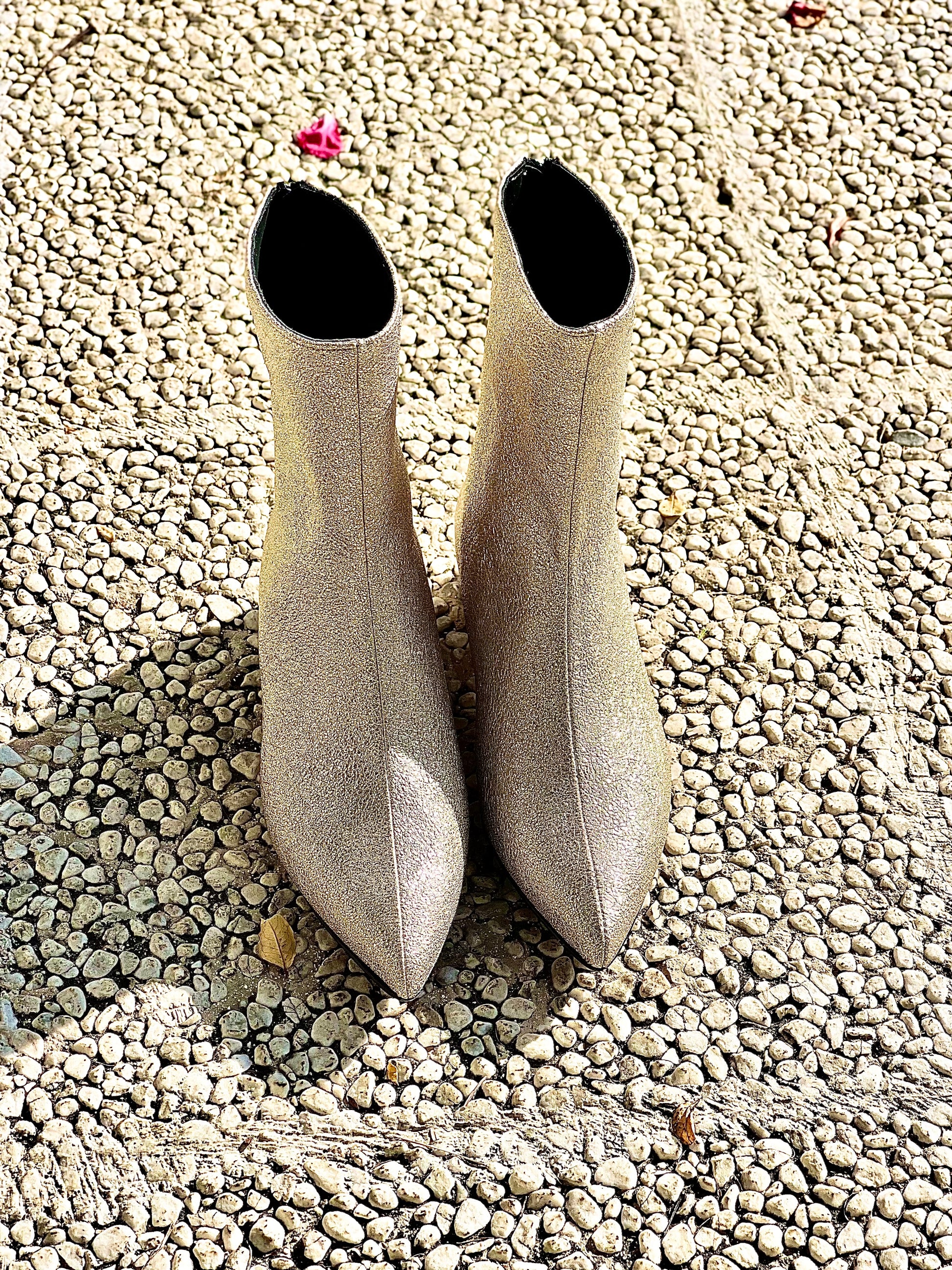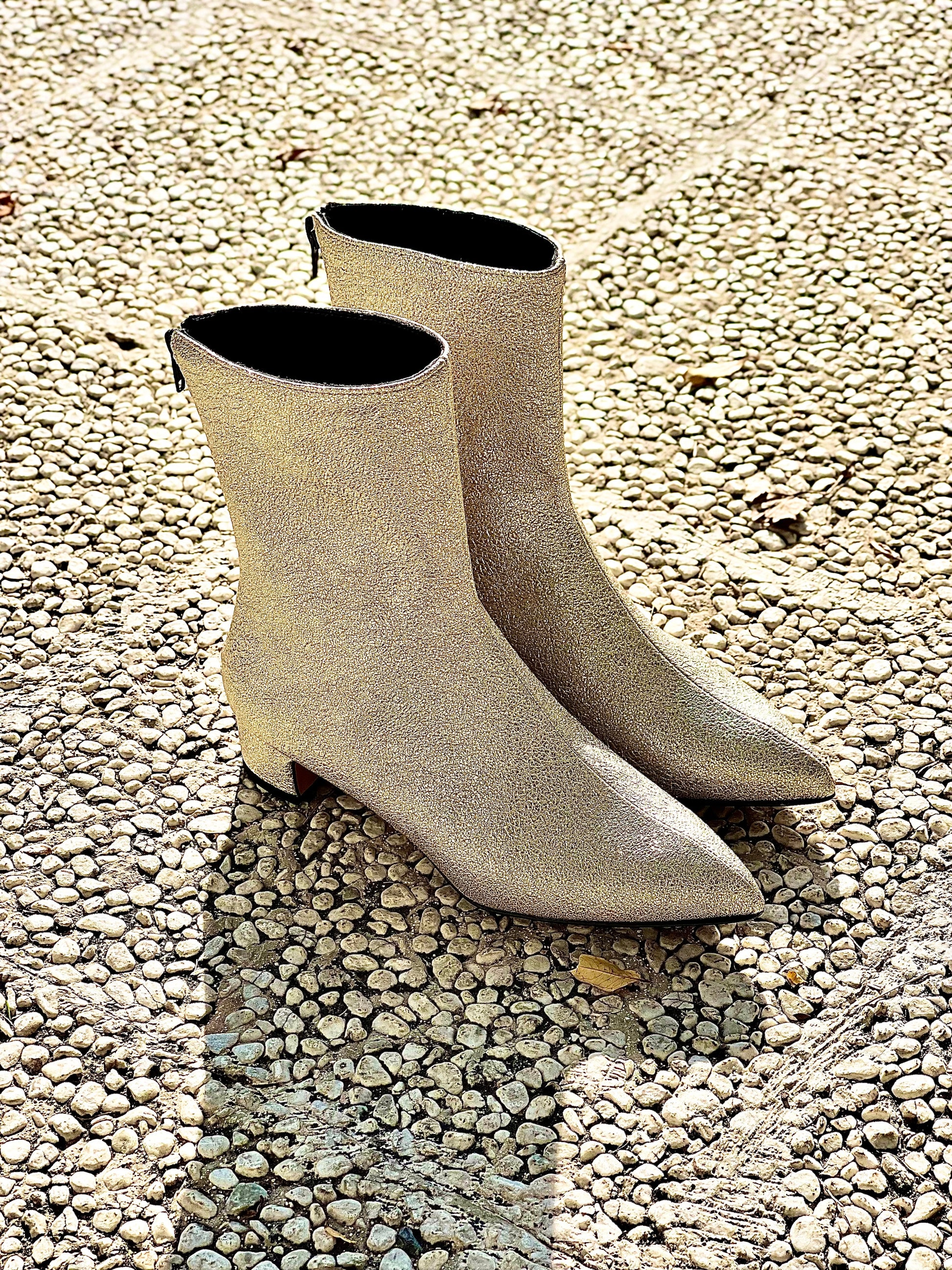 Μποτάκι με μυτερή μύτη από λαμινέ, φαρδύ τακούνι και φερμουάρ στο πίσω μέρος.