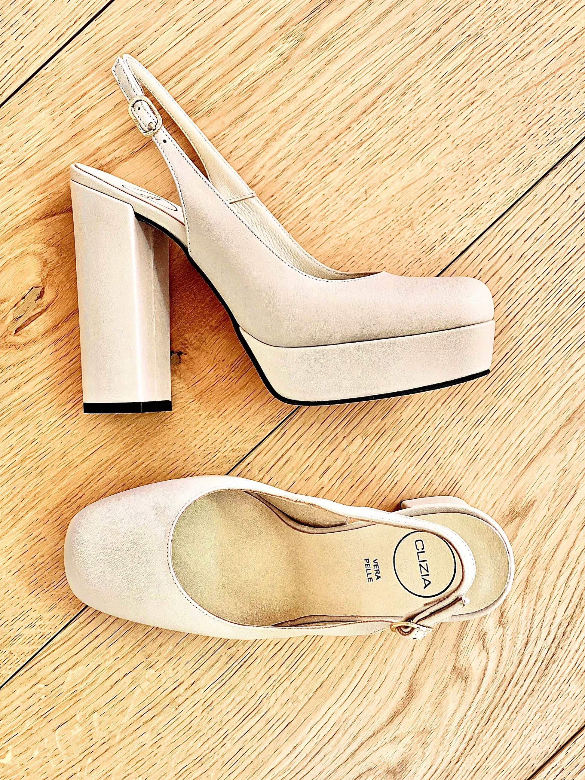 Δερμάτινα γόβα με ημικυκλική μύτη, πλατφόρμα και ψηλό φαρδύ τακούνι.