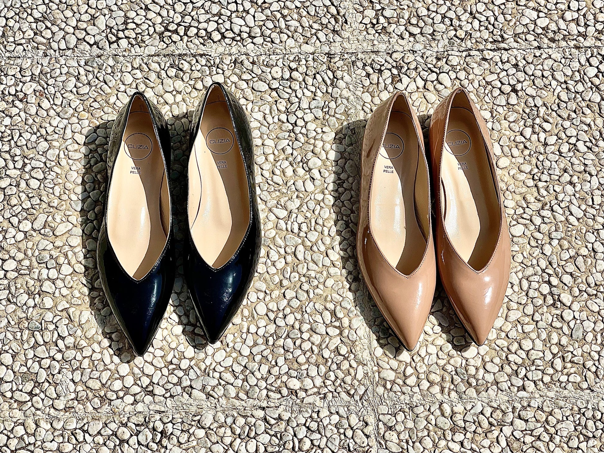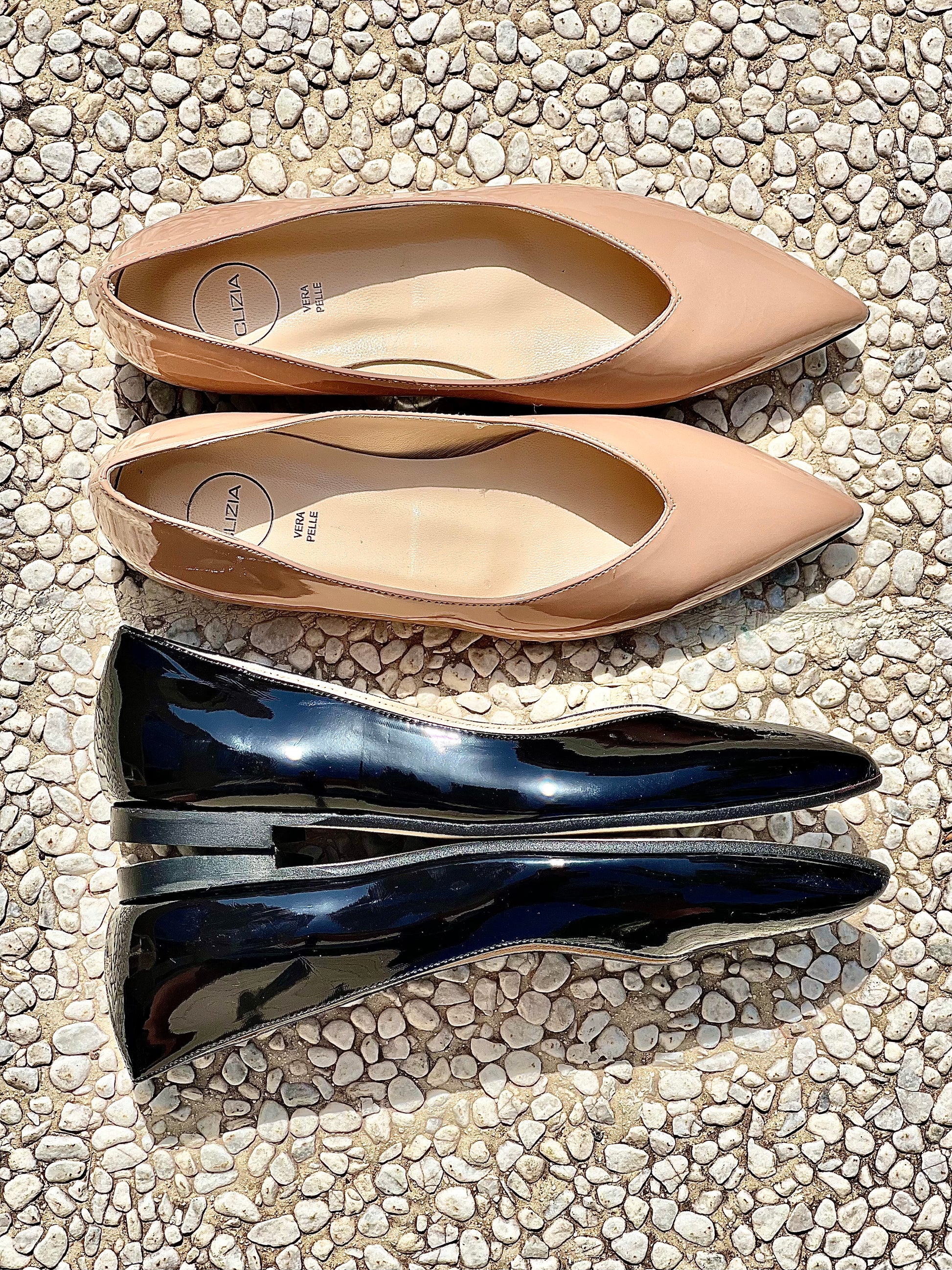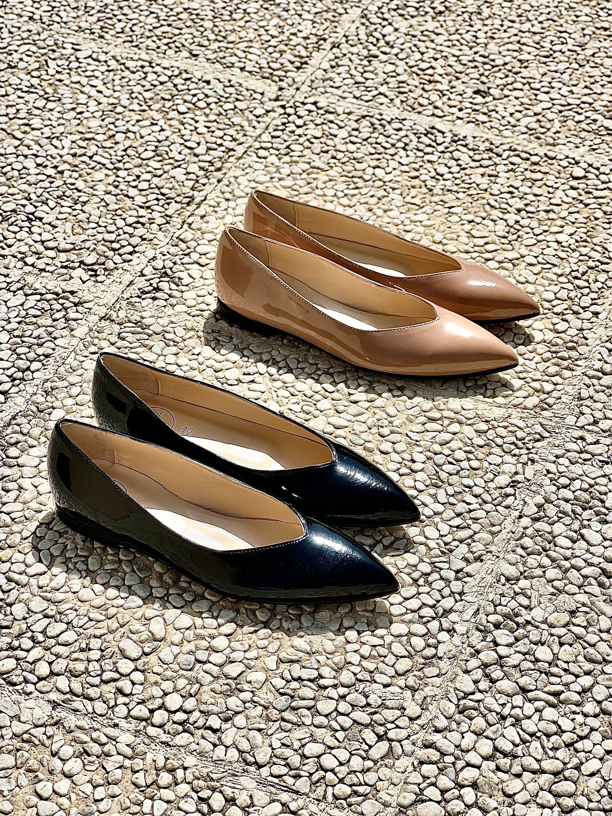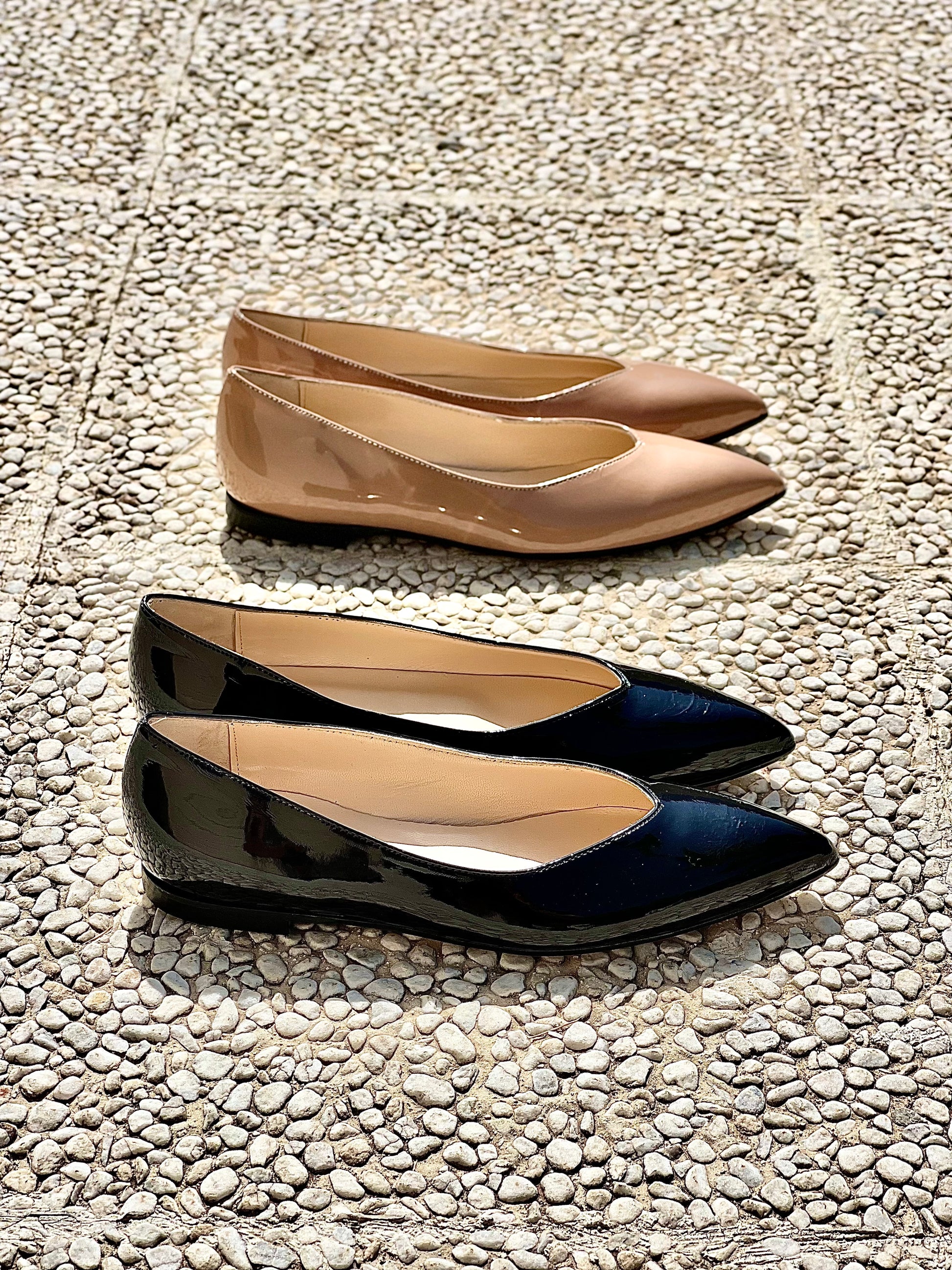 Μπαλαρίνες με V λαιμόκοψη από βερνίκι, τακούνι 1 cm.