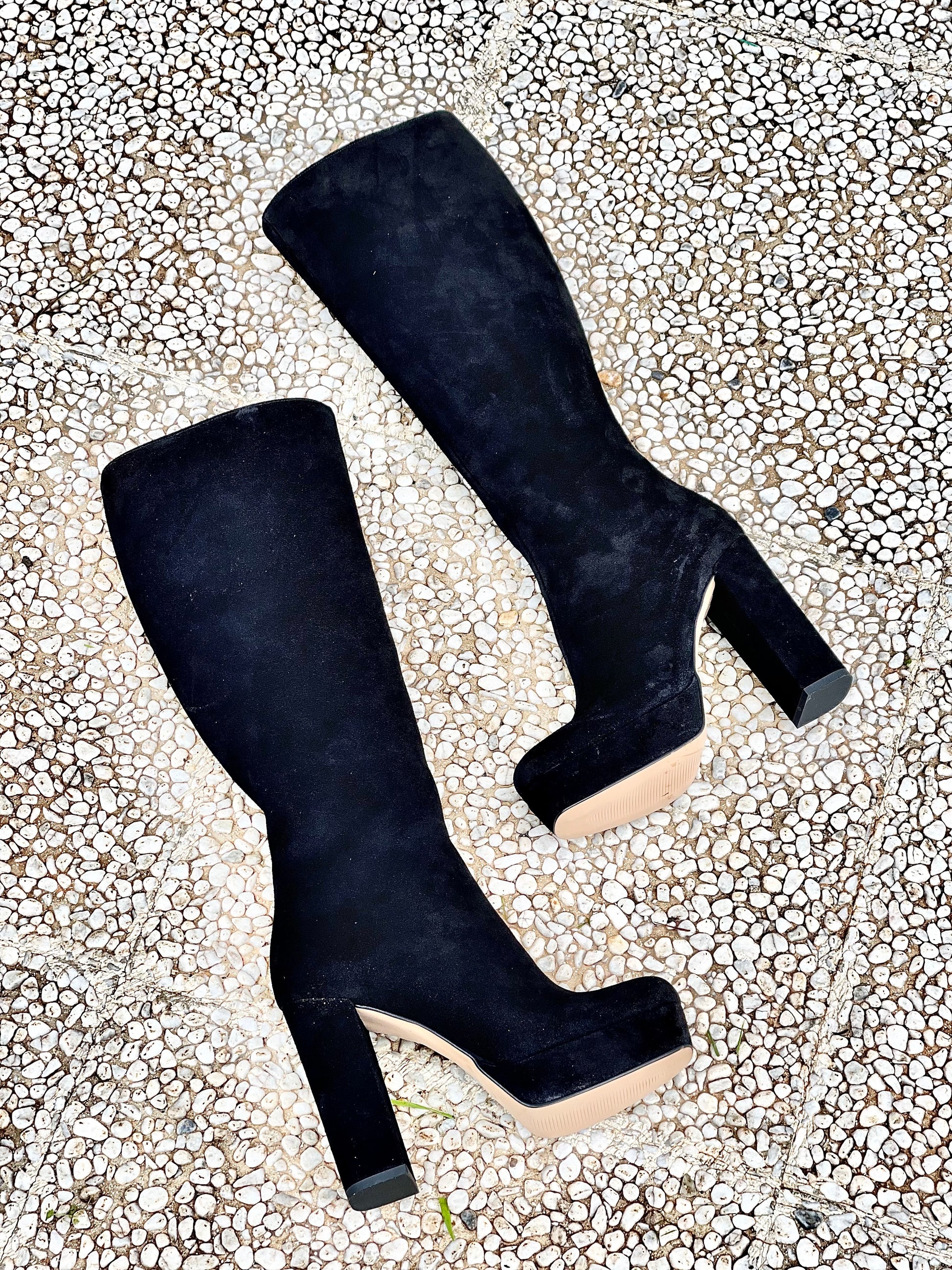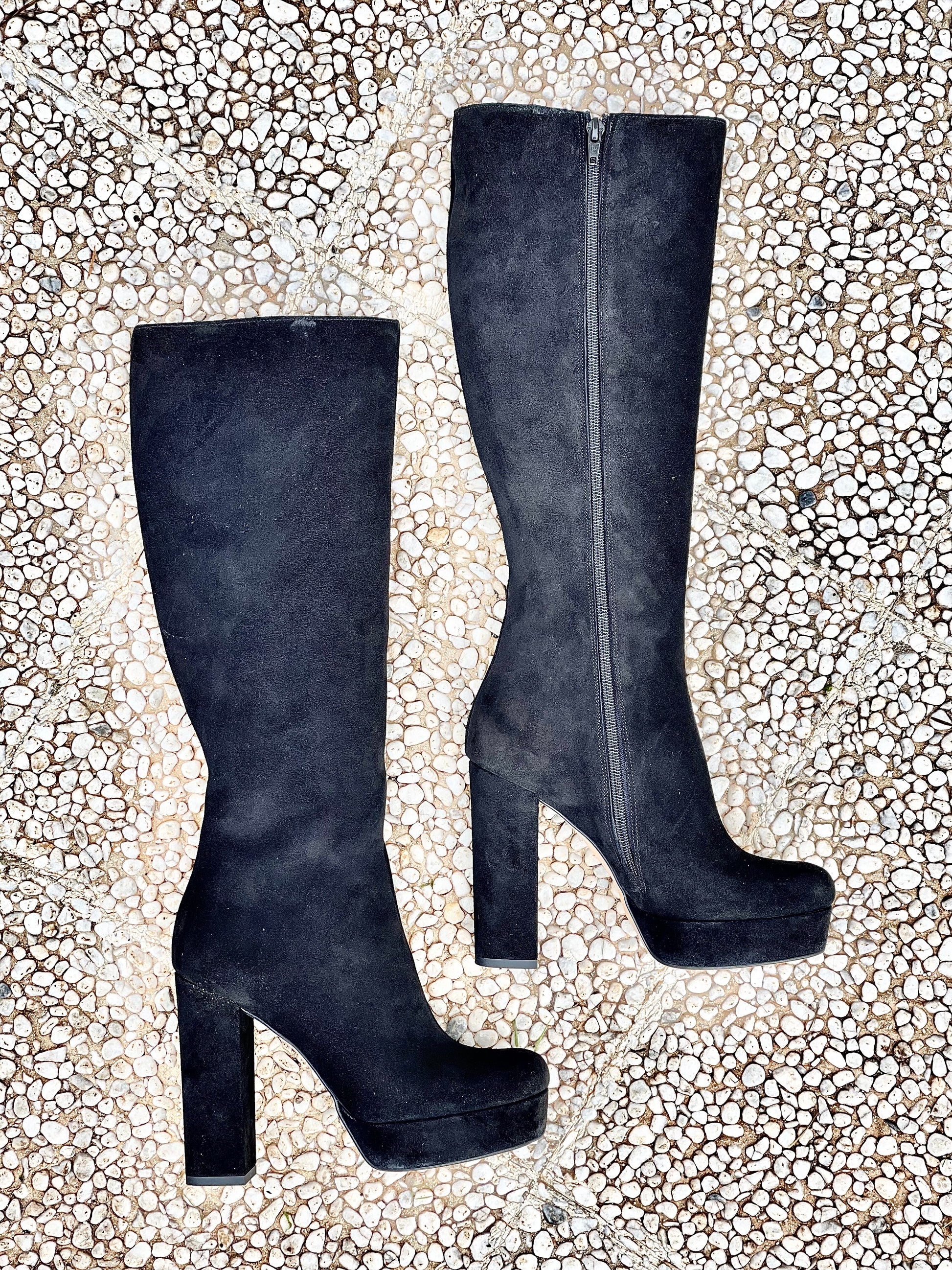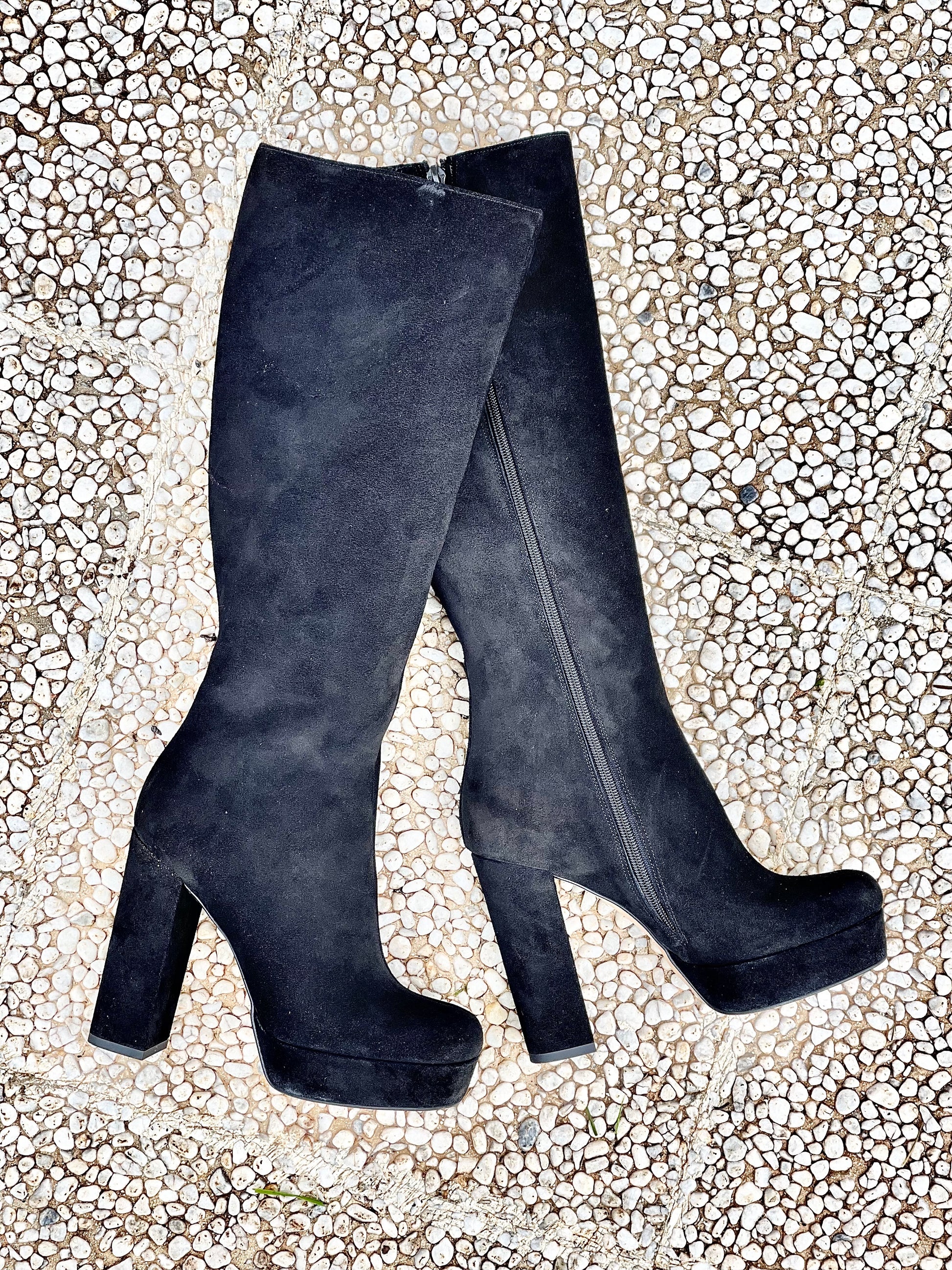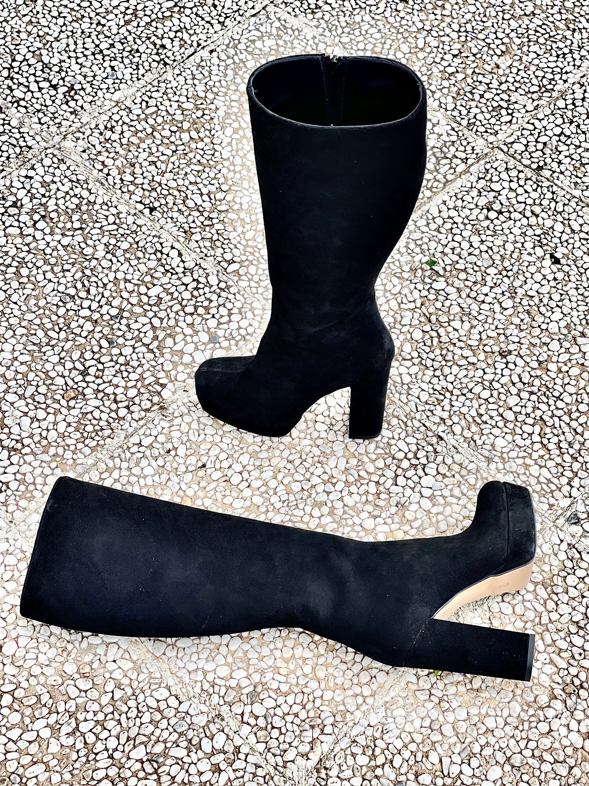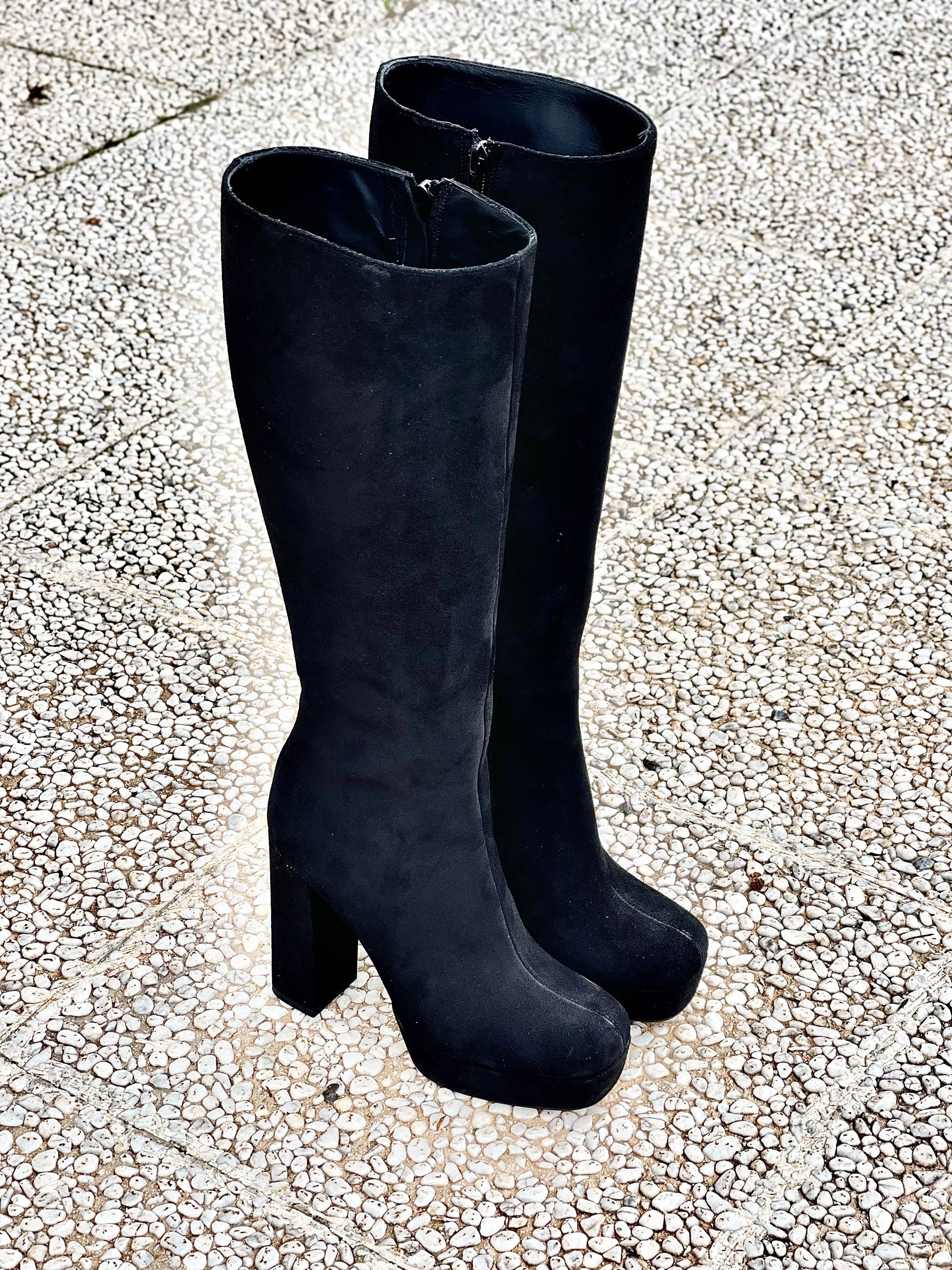 Μπότες με ημικυκλική μύτη από σουέτ, τακούνι 12 cm και πλατφόρμα 3 cm.