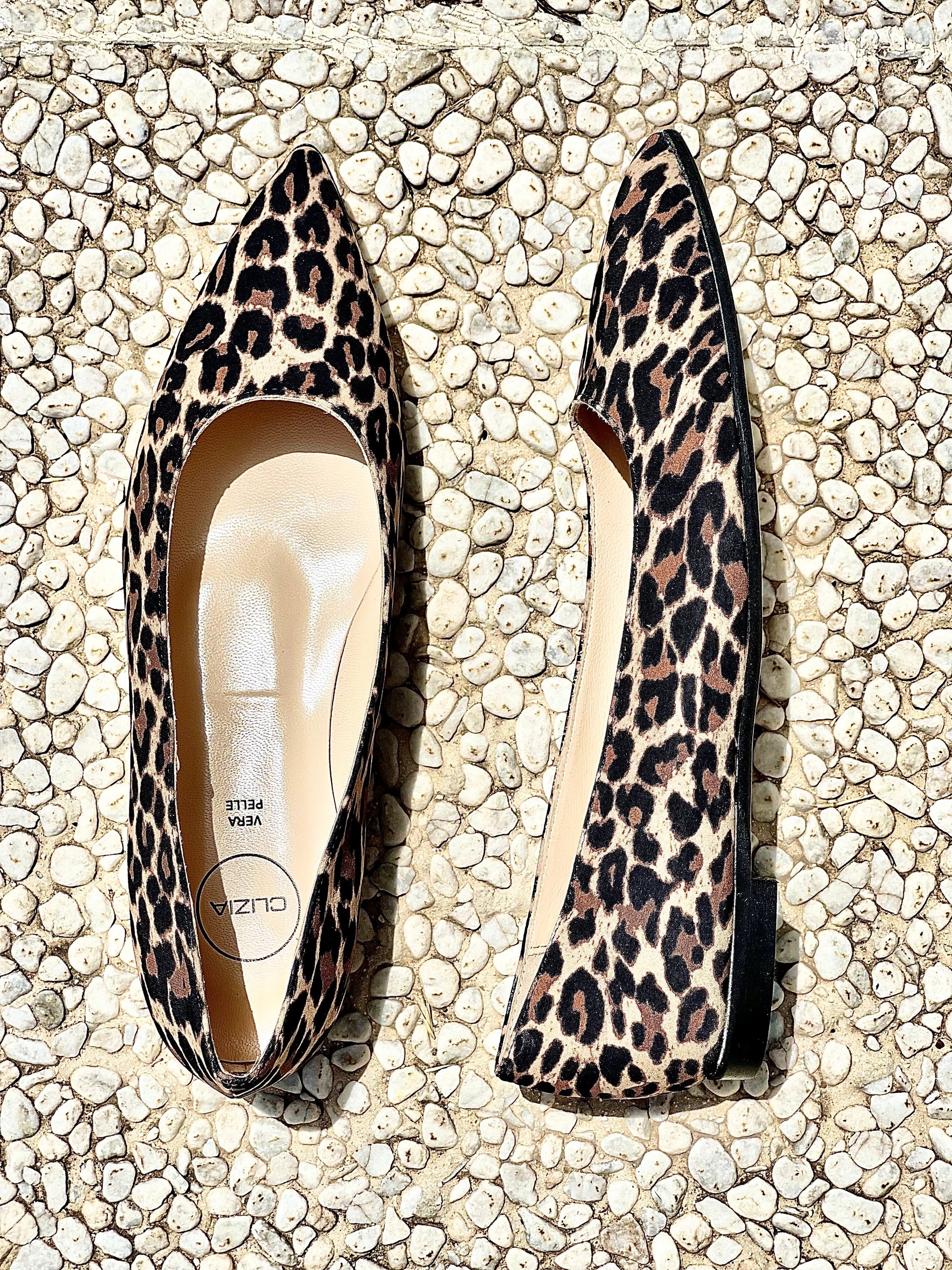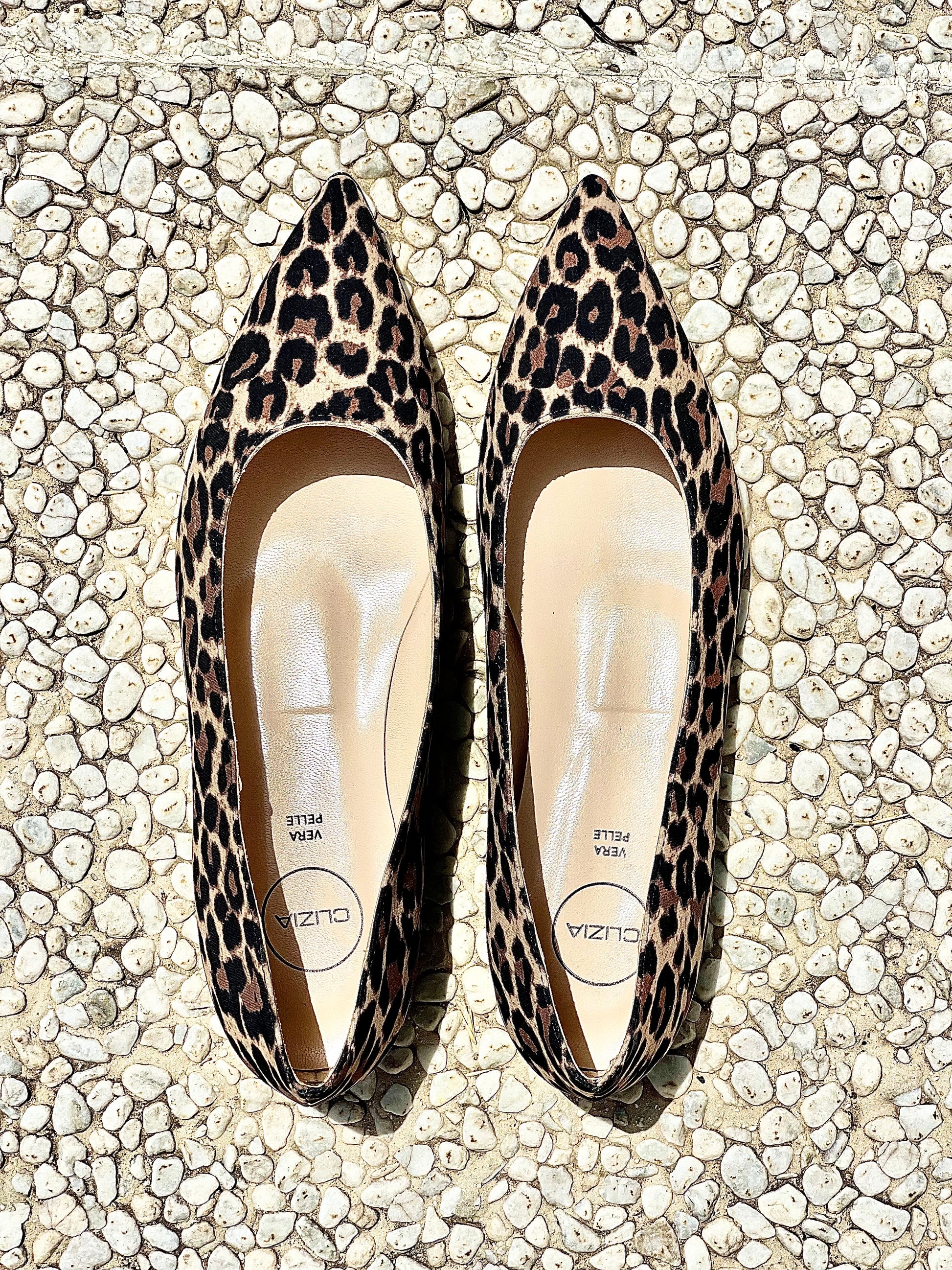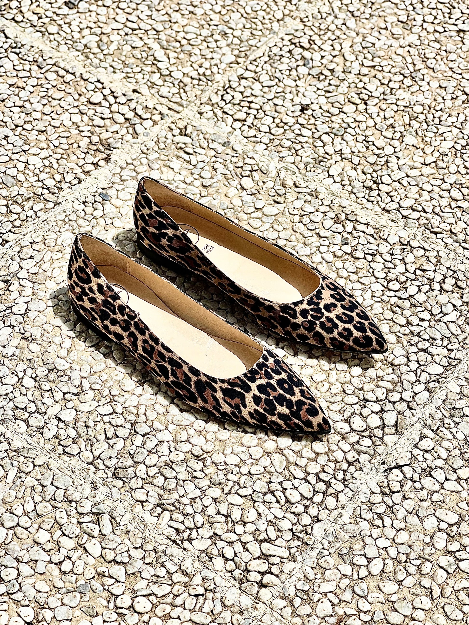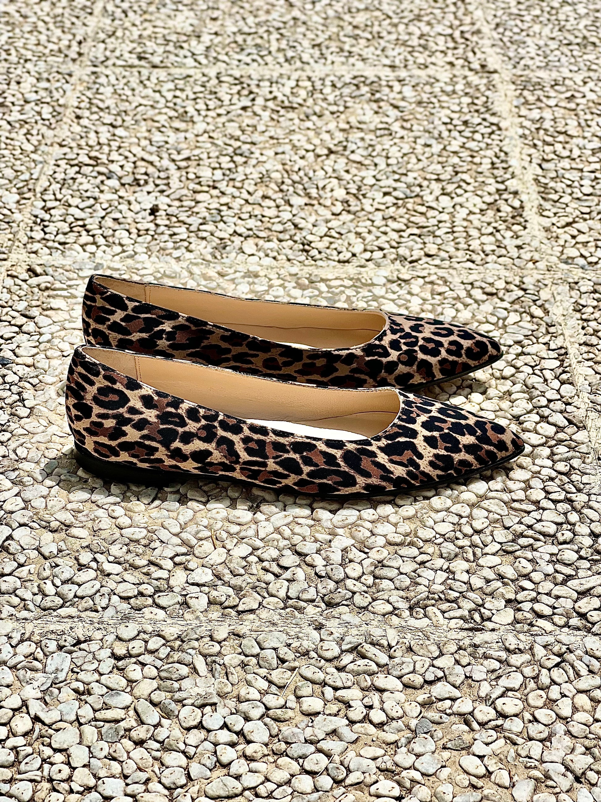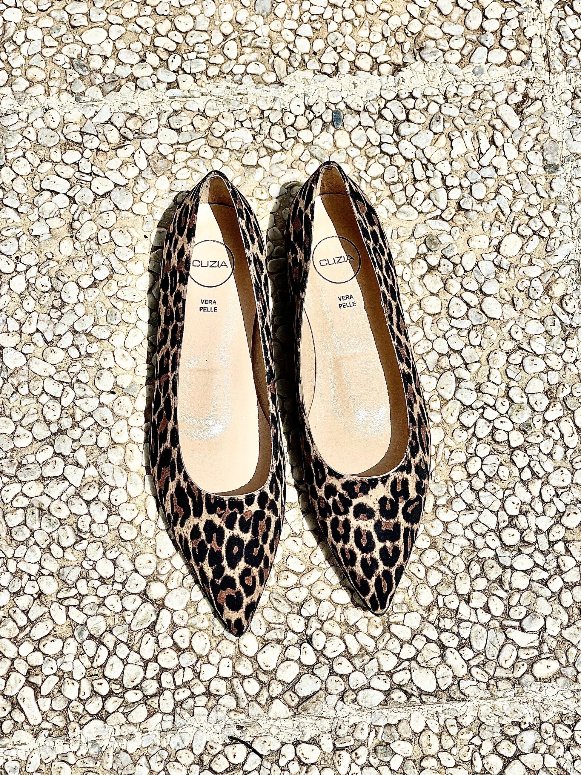 Μπαλαρίνες με λεπτή μύτη από ύφασμα με λεοπάρ μοτίβο και τακούνι 1 cm.