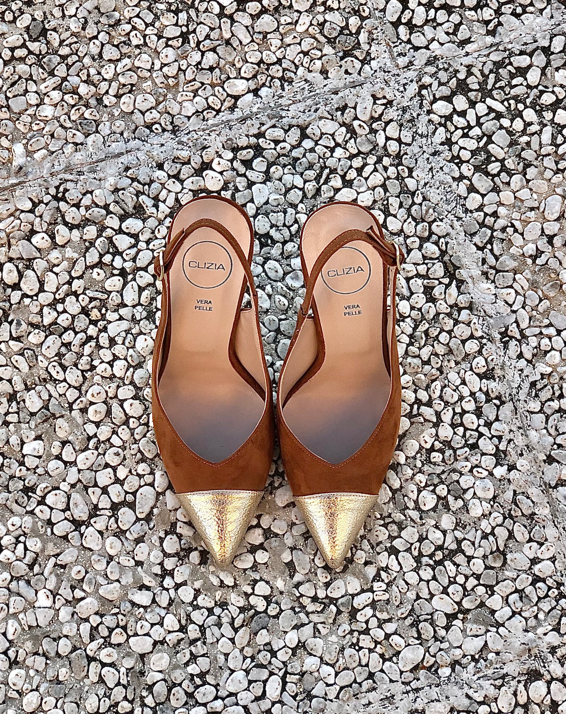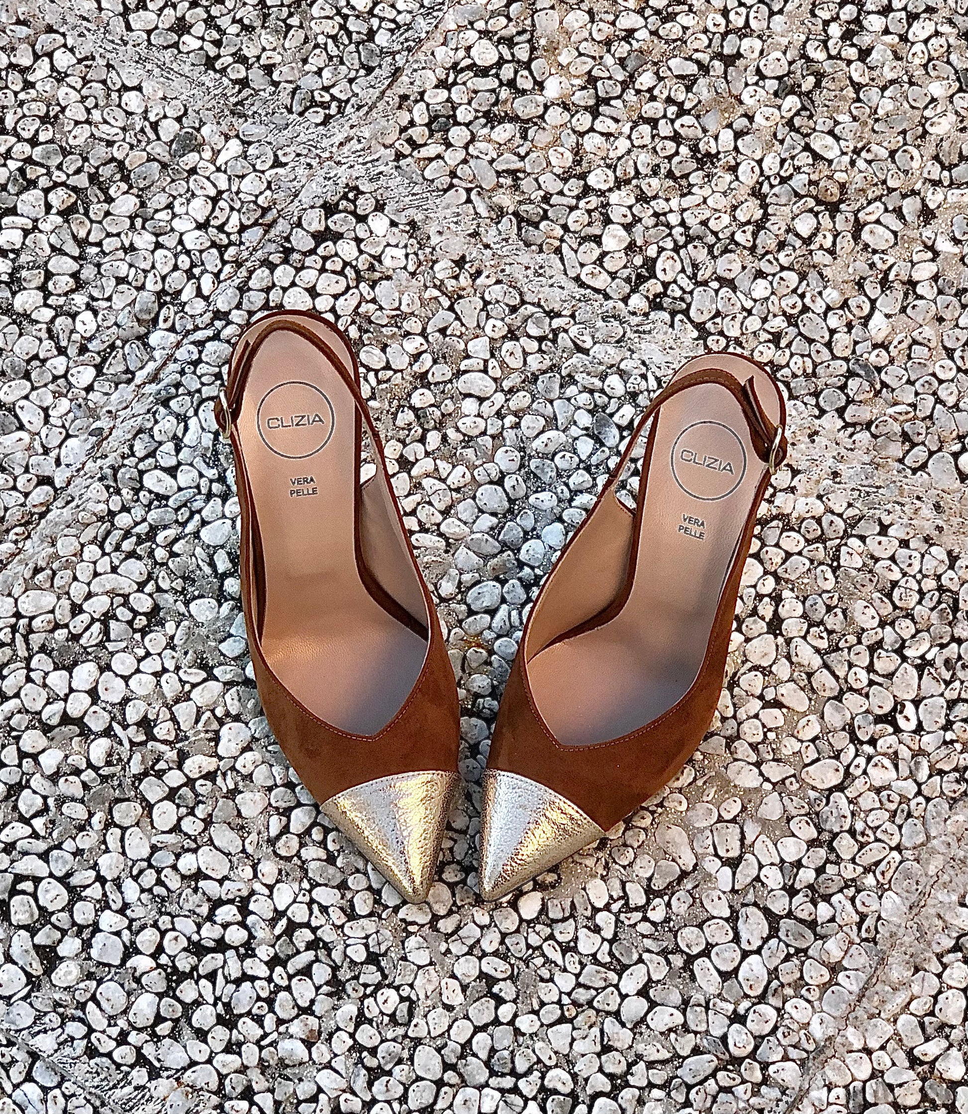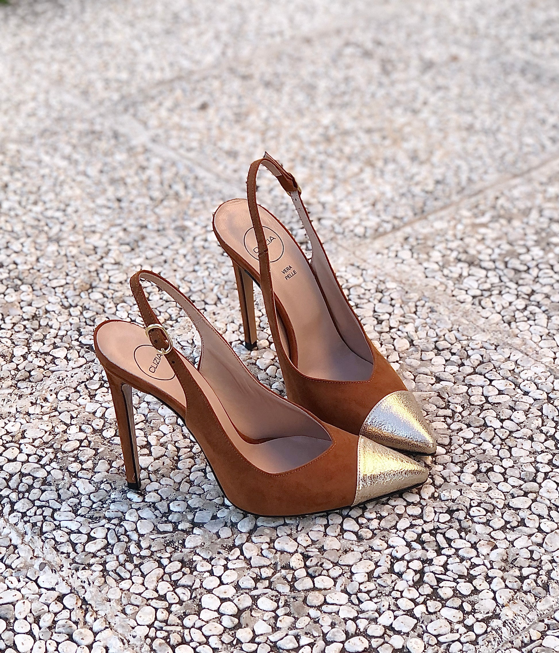 Σλιπ-ον γόβες με ανοιχτή μύτη, V-neck λαιμόκοψη, από σουέτ, με ψηλό τακούνι.