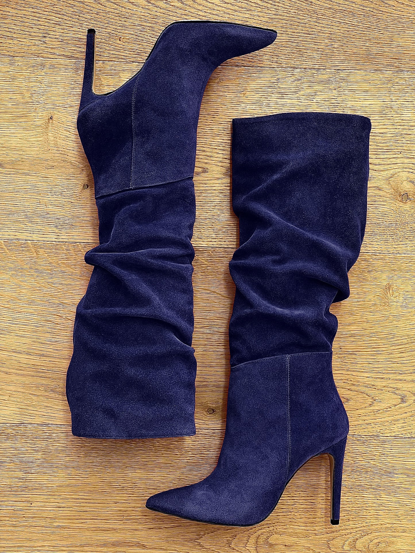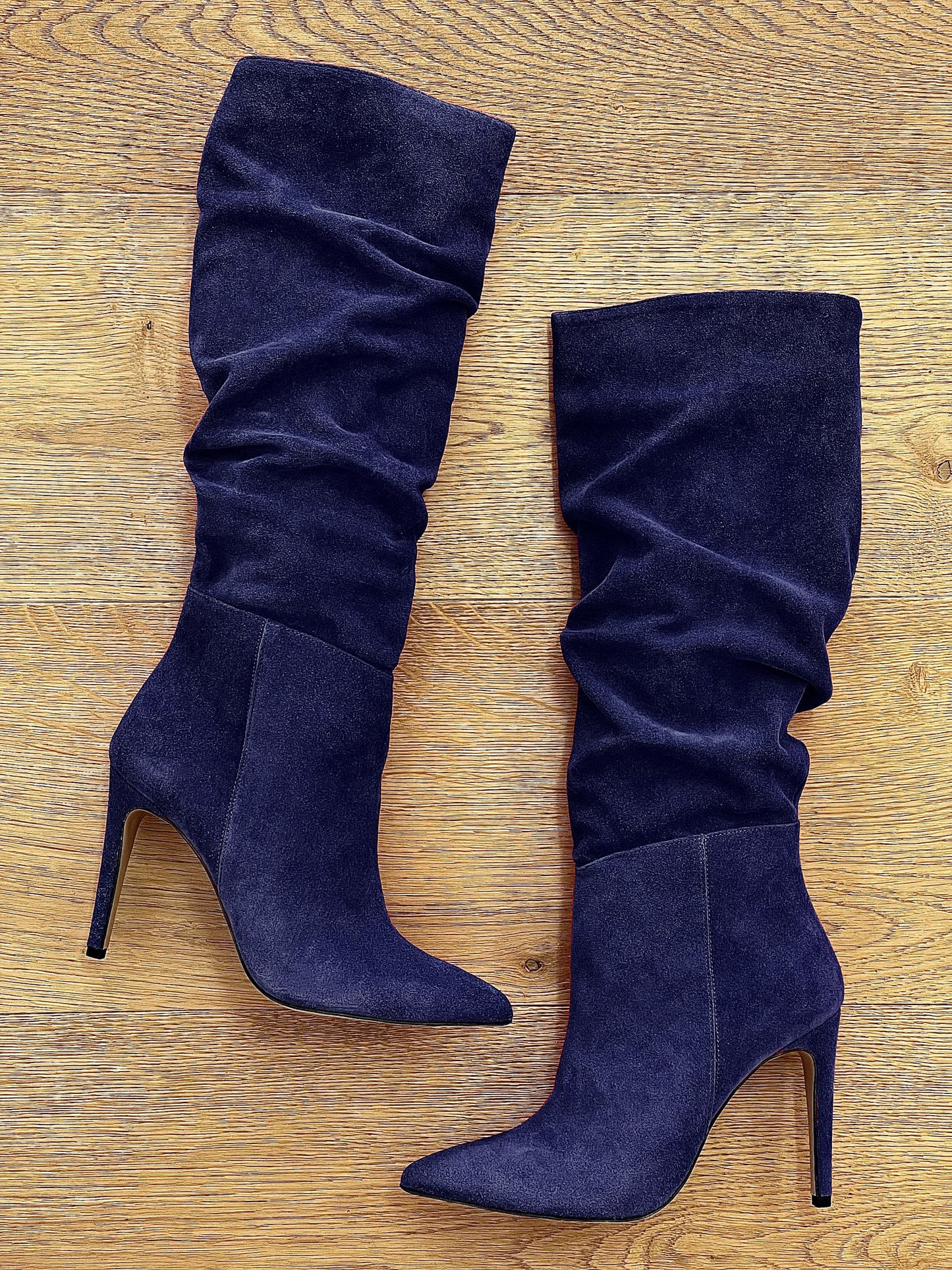 High sagging tubular suede high heel boots.