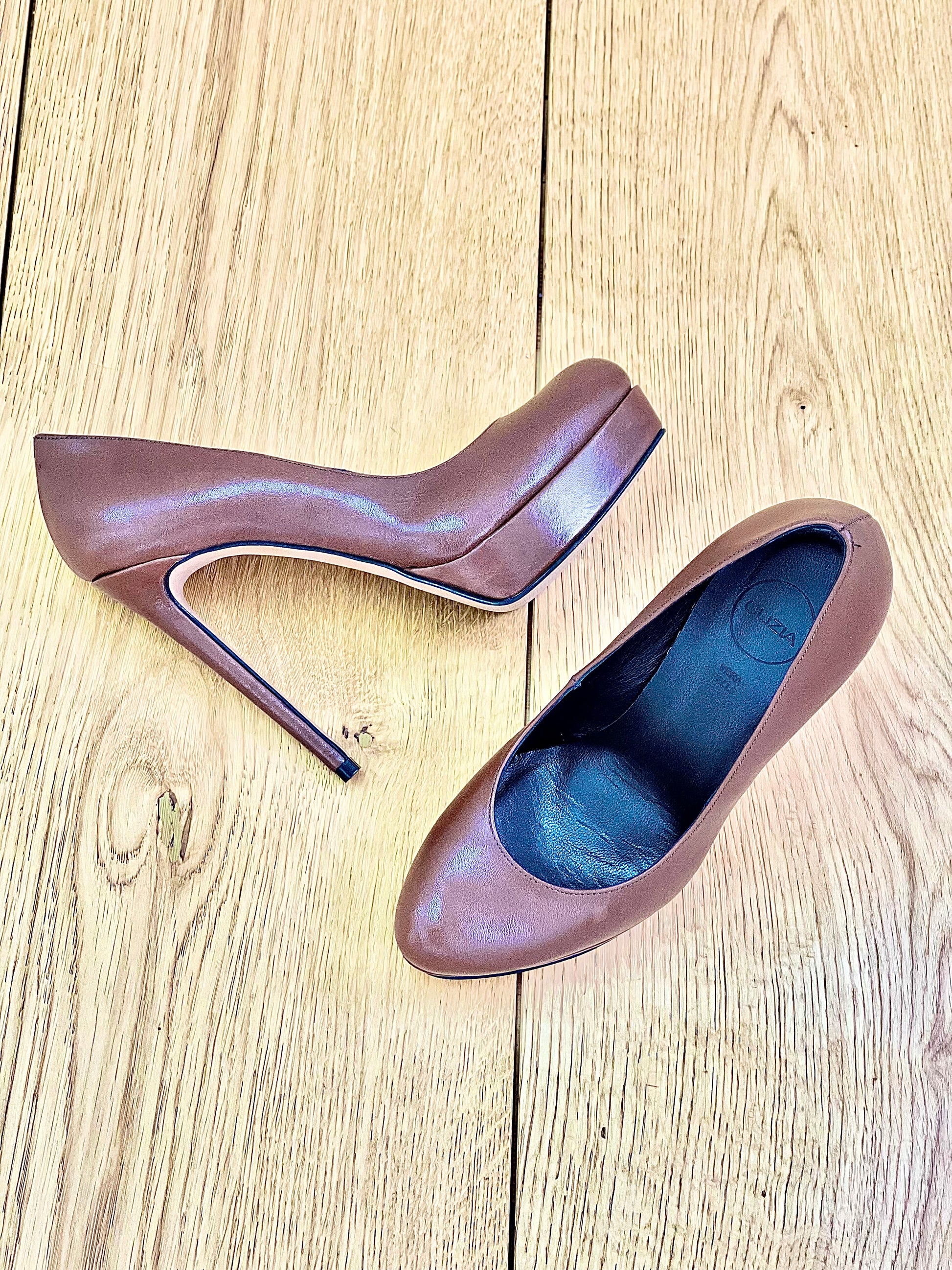 Round toe leather pump with 12cm heel and 2cm platform.