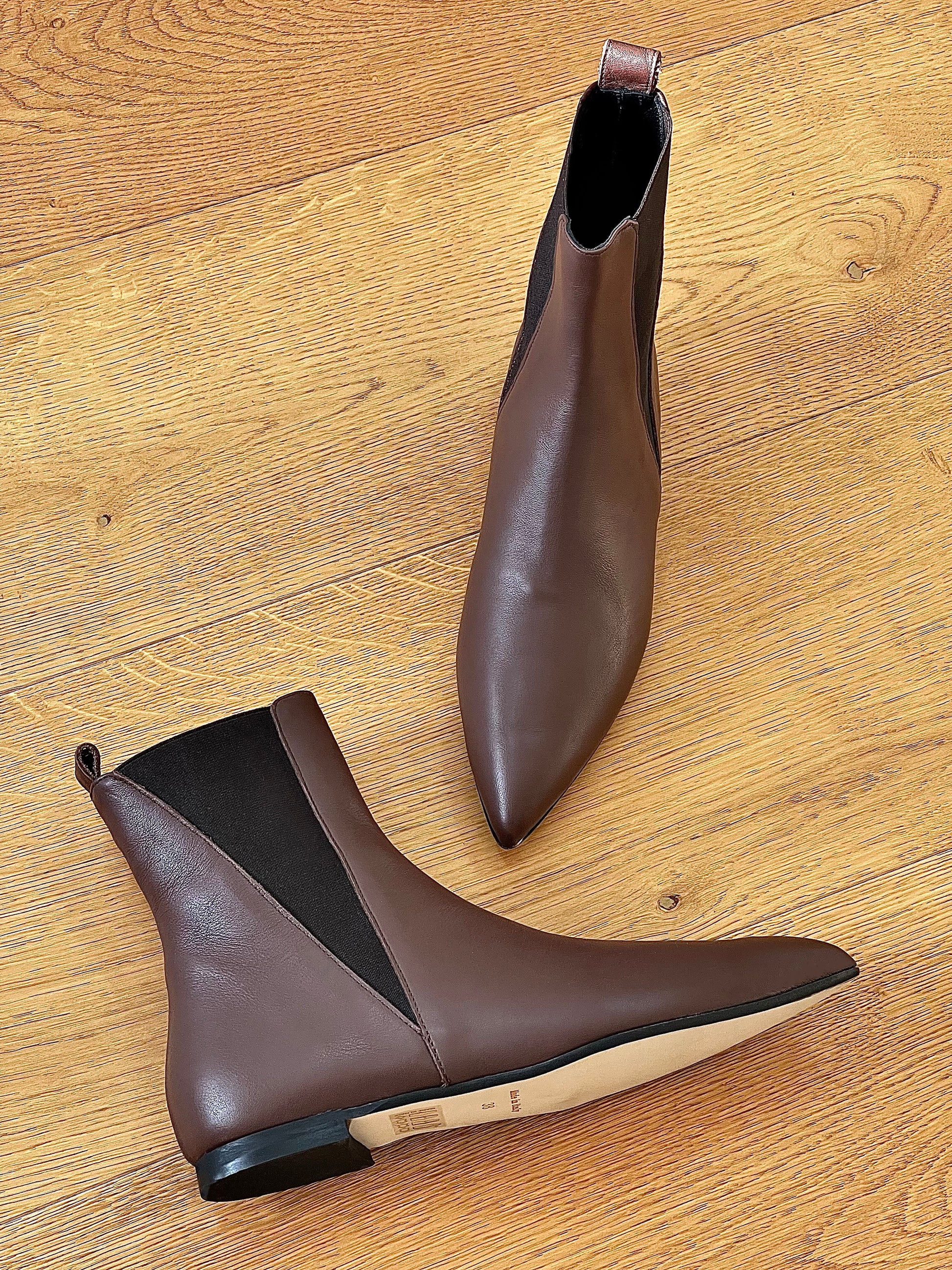 Botte chelsea pointue en cuir avec un talon de 1 cm.
