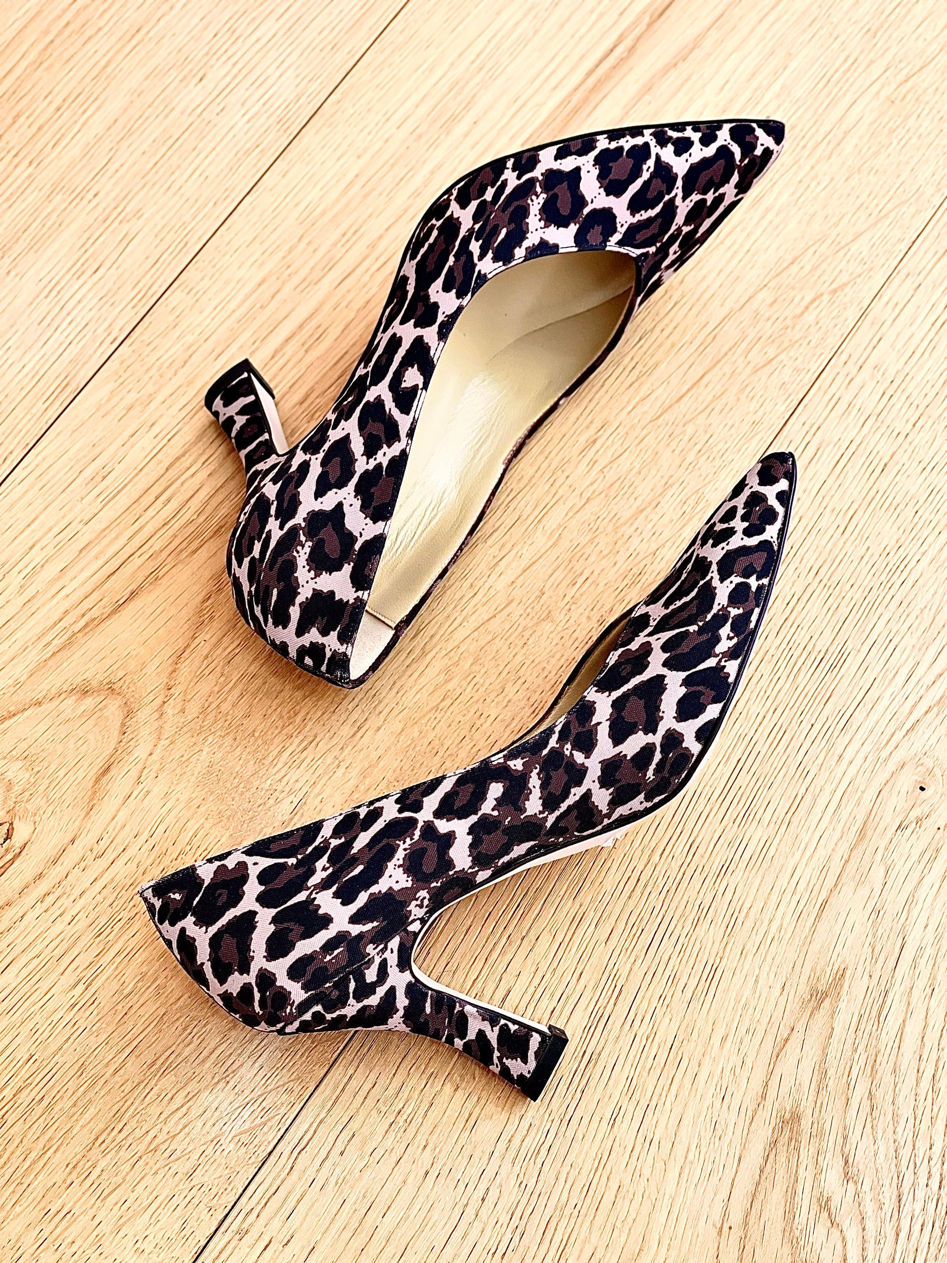 Escarpin à bout pointu avec col en V animal et talon bobine de 8 cm.