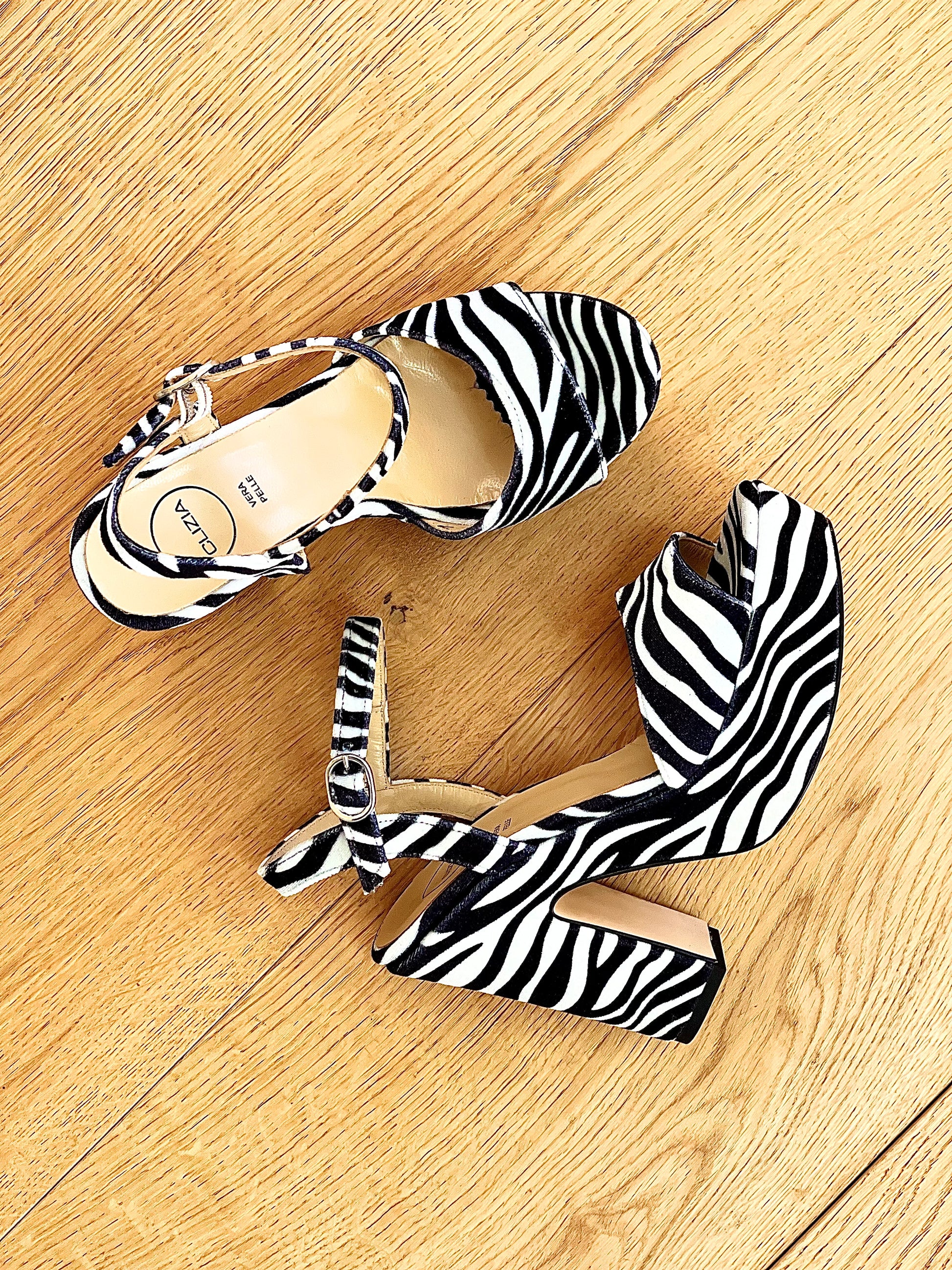 Sandales à talons hauts avec bande et bride en velours imprimé animal.