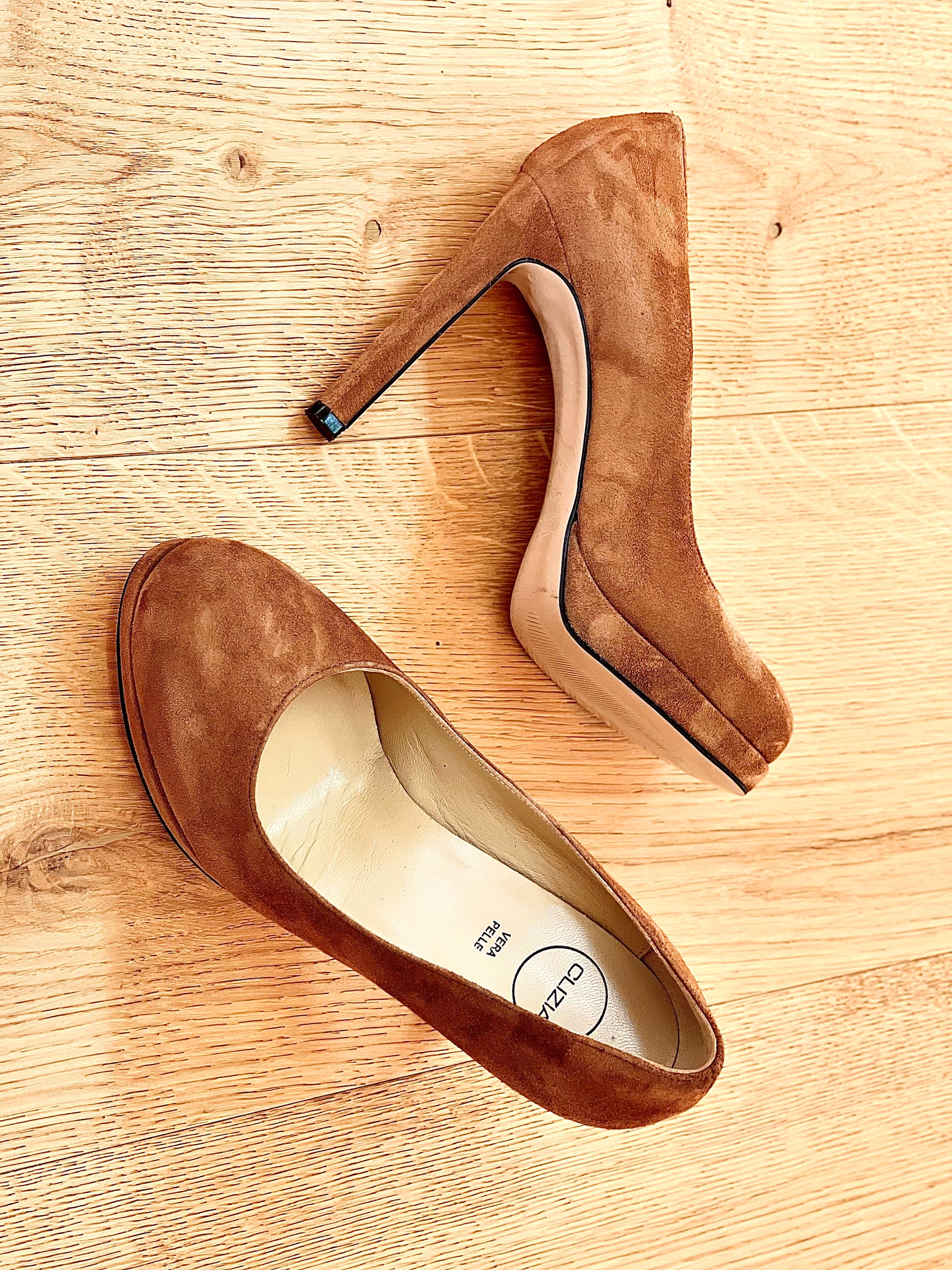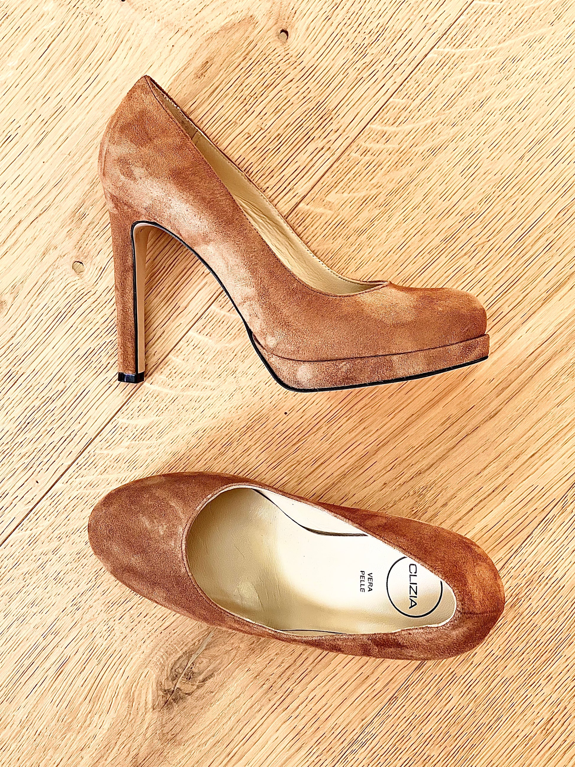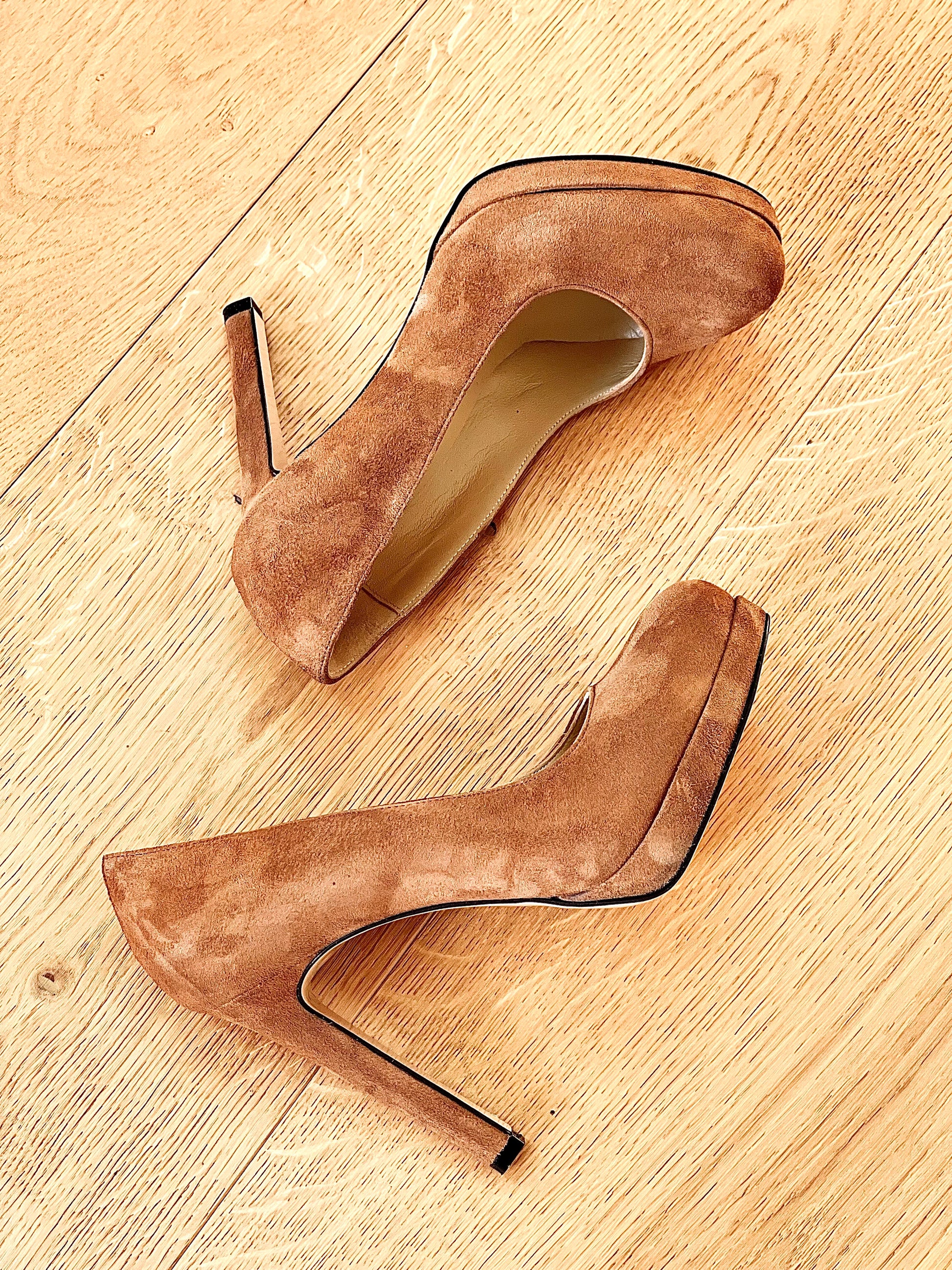 Escarpins en daim à bout arrondi, avec un talon de 10 cm et une plateforme de 1 cm.