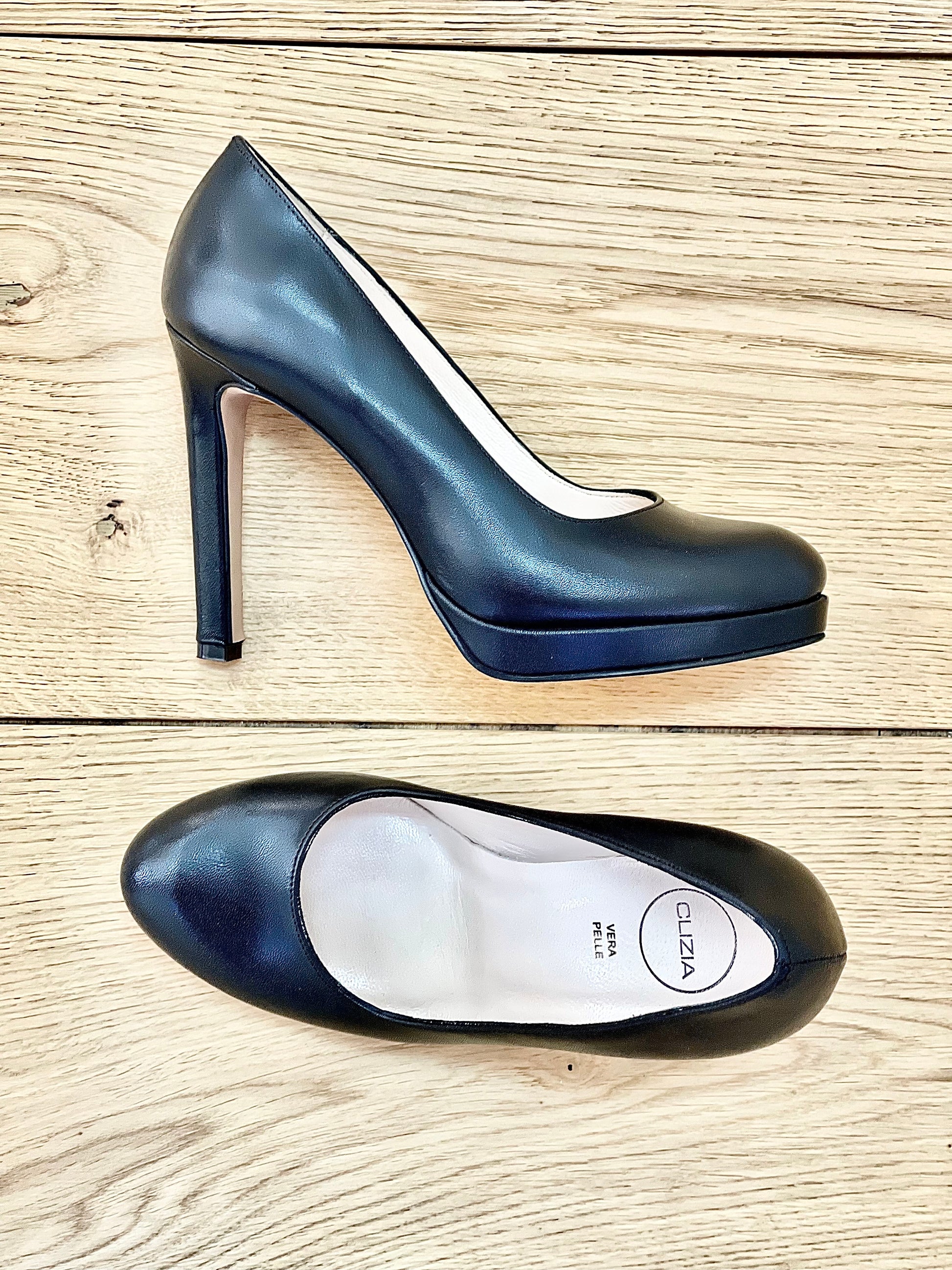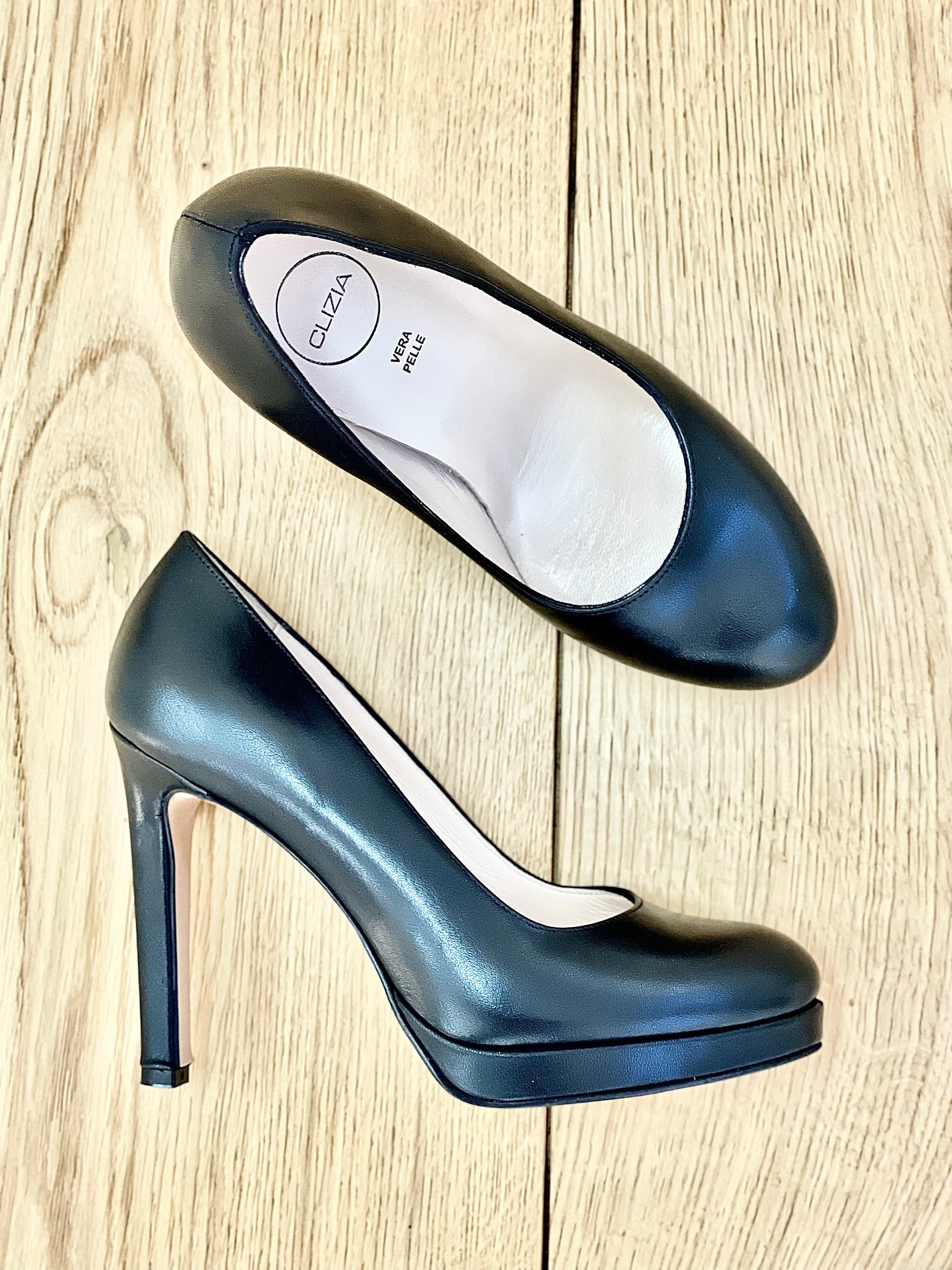 Escarpin à bout arrondi en cuir, talon haut de 10 cm et plateforme de 1 cm.