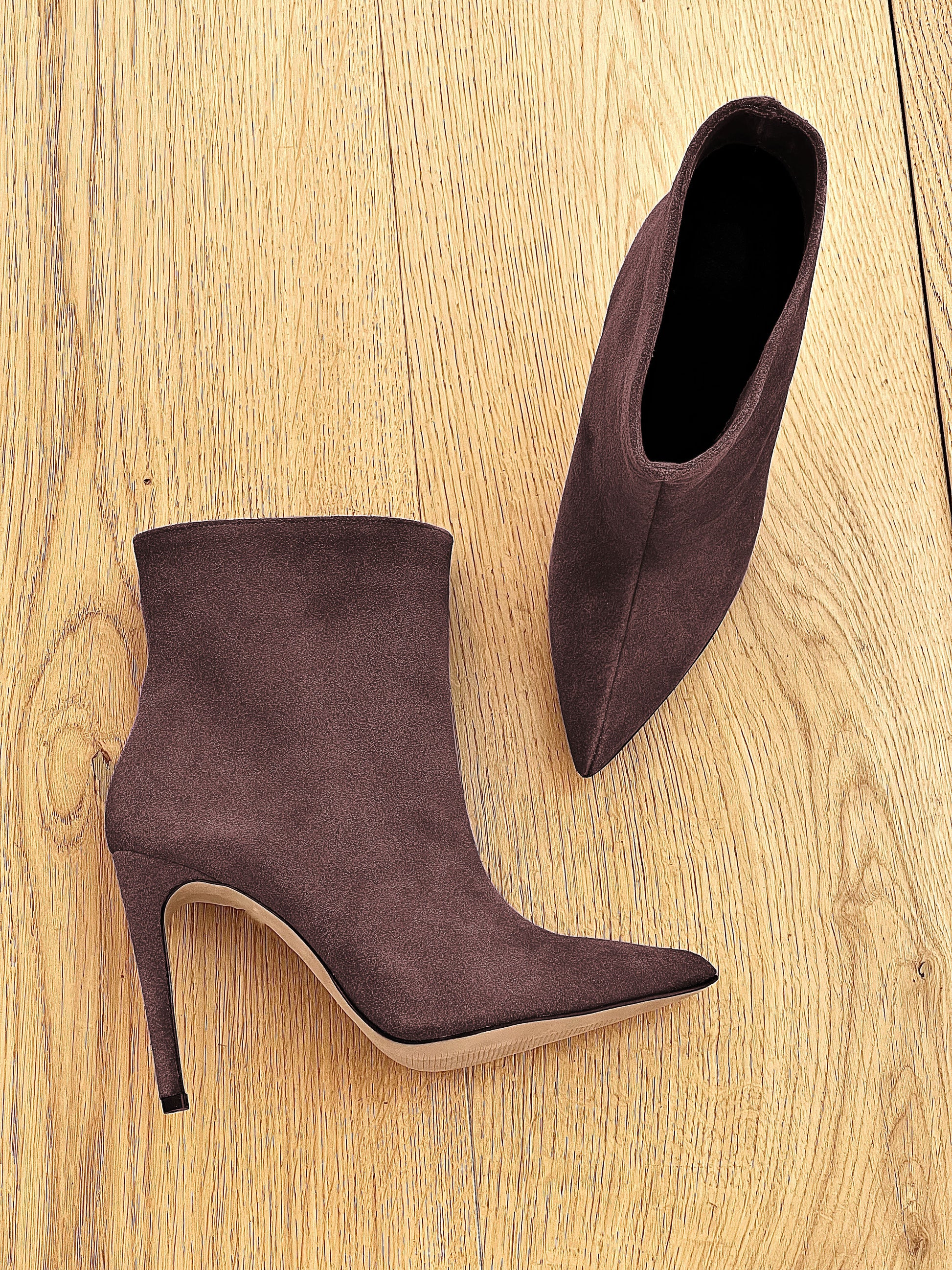 Bottines en daim à bout pointu et à talon aiguille.