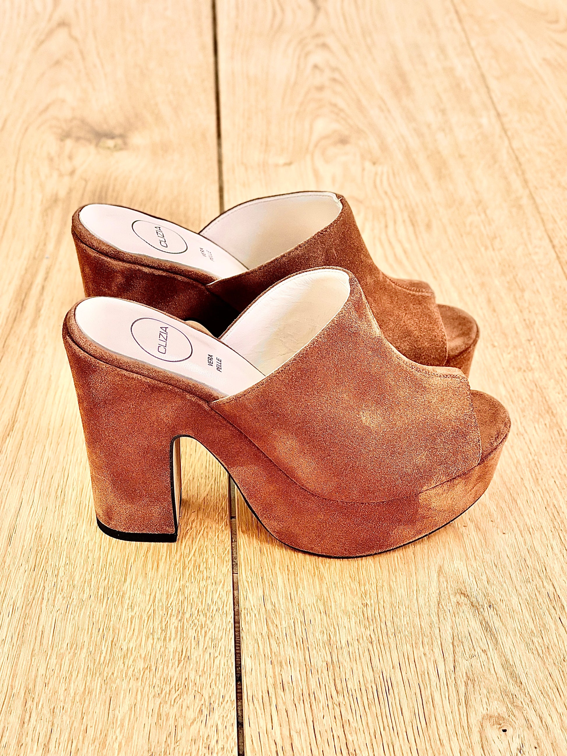 Sandales sabots en daim sur talon compensé de 11,5 cm et plateforme de 4 cm.