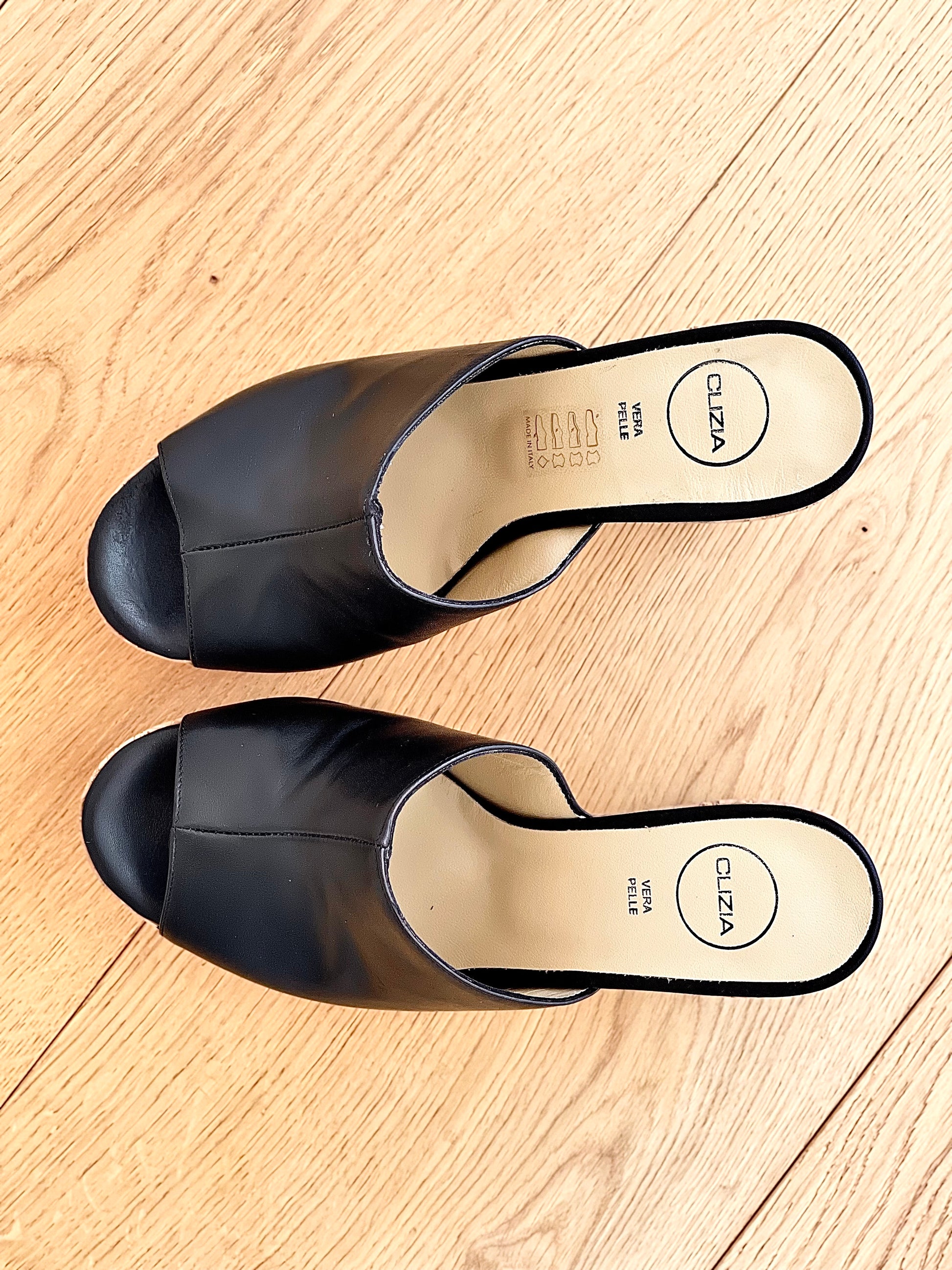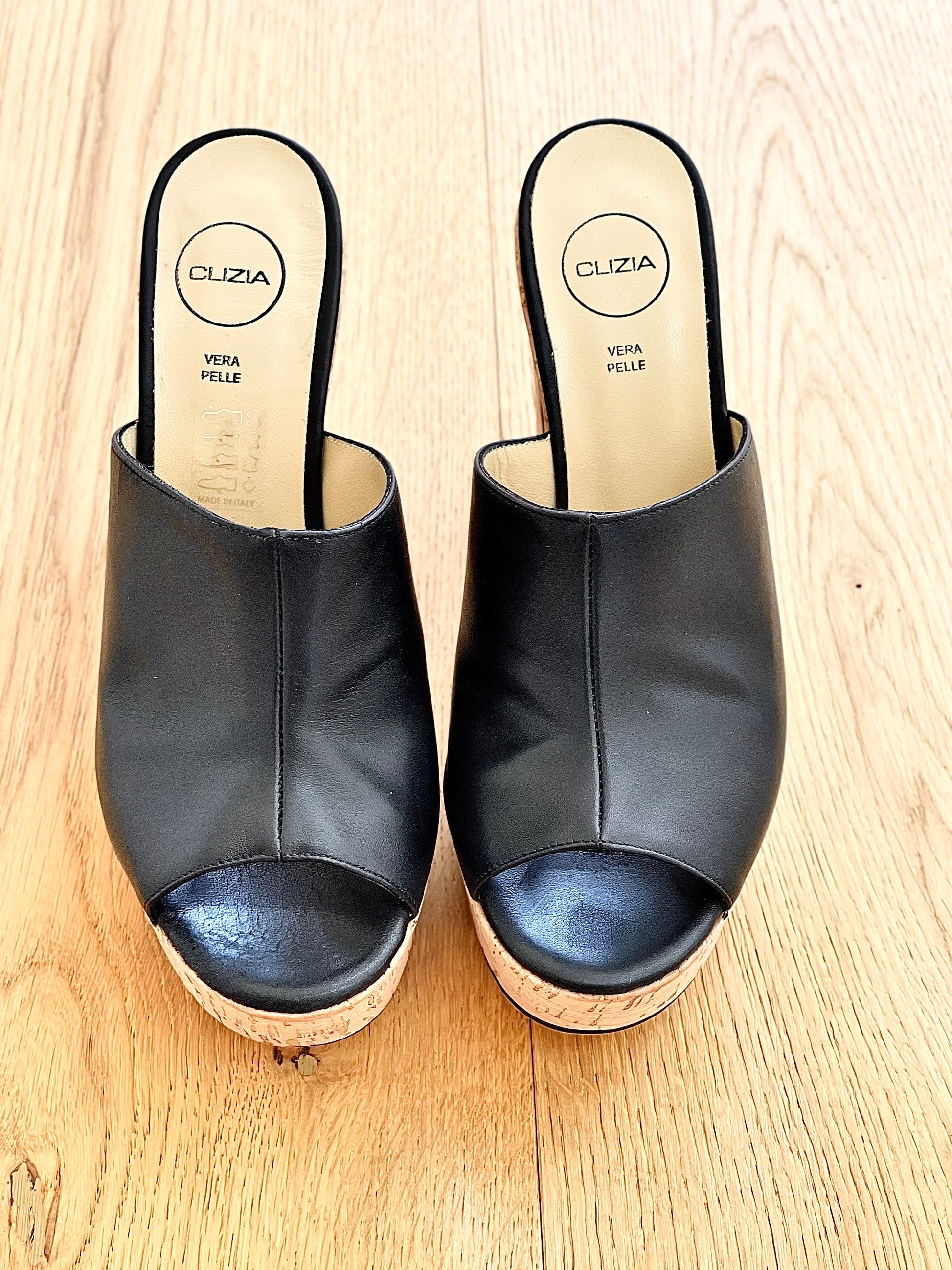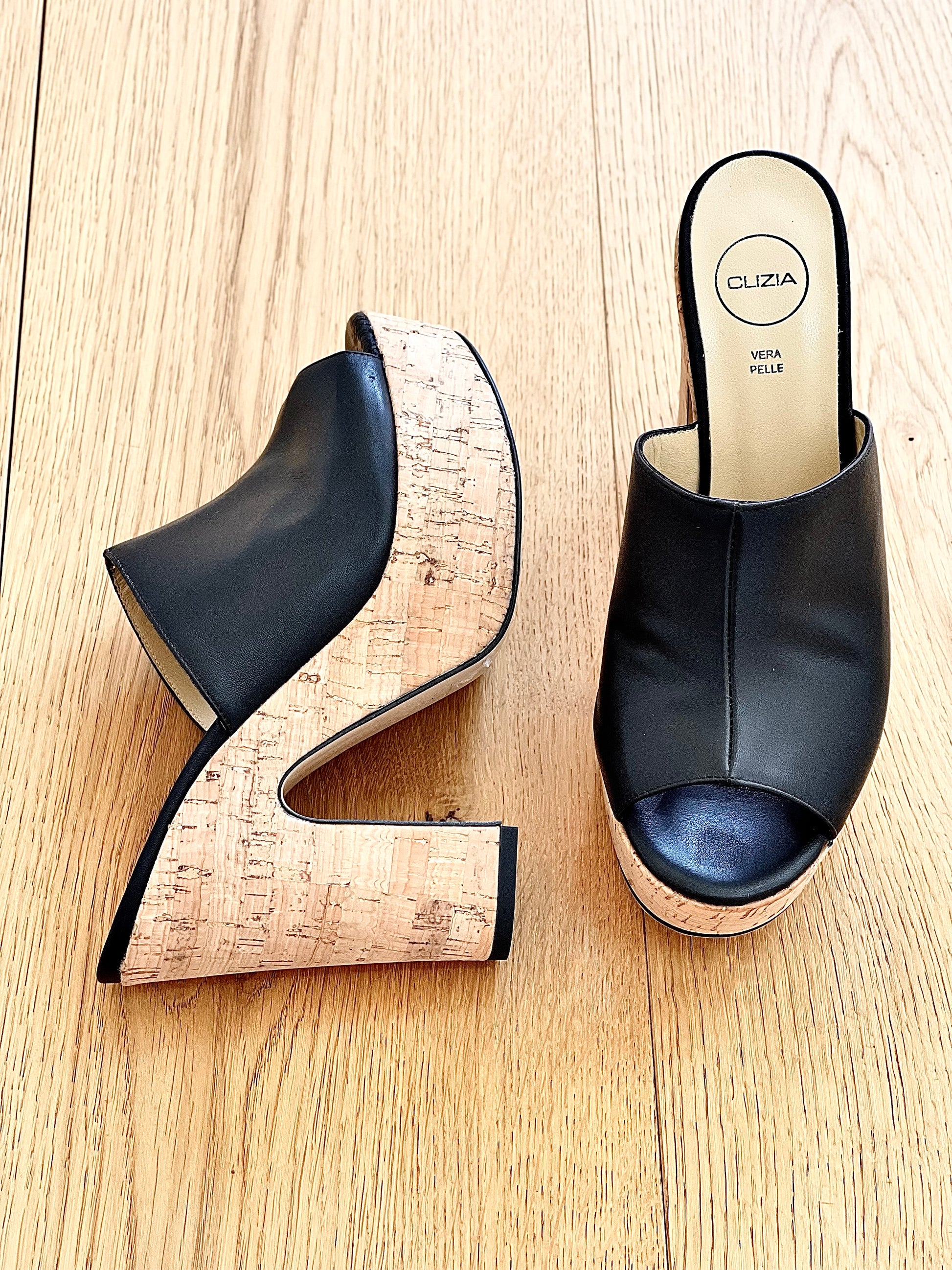 Sandales sabots en cuir sur talon haut compensé de 11,5 cm et plateforme de 4 cm.