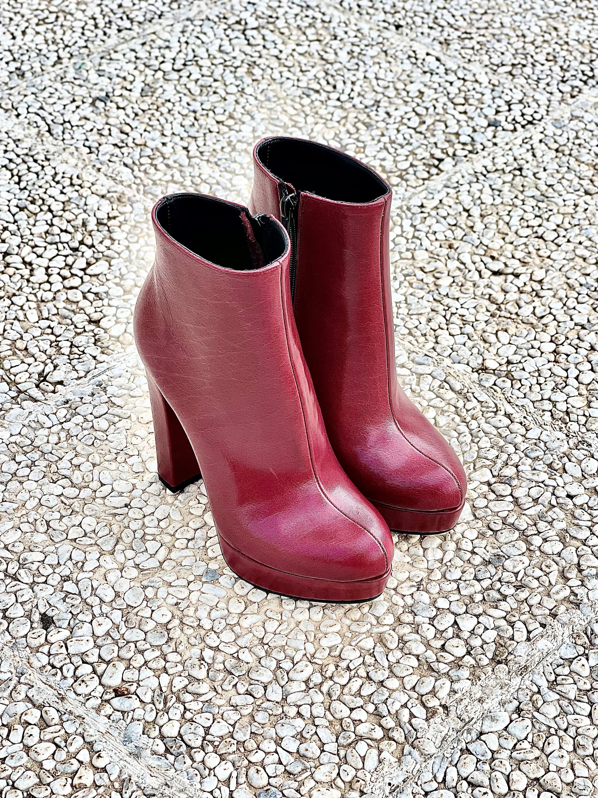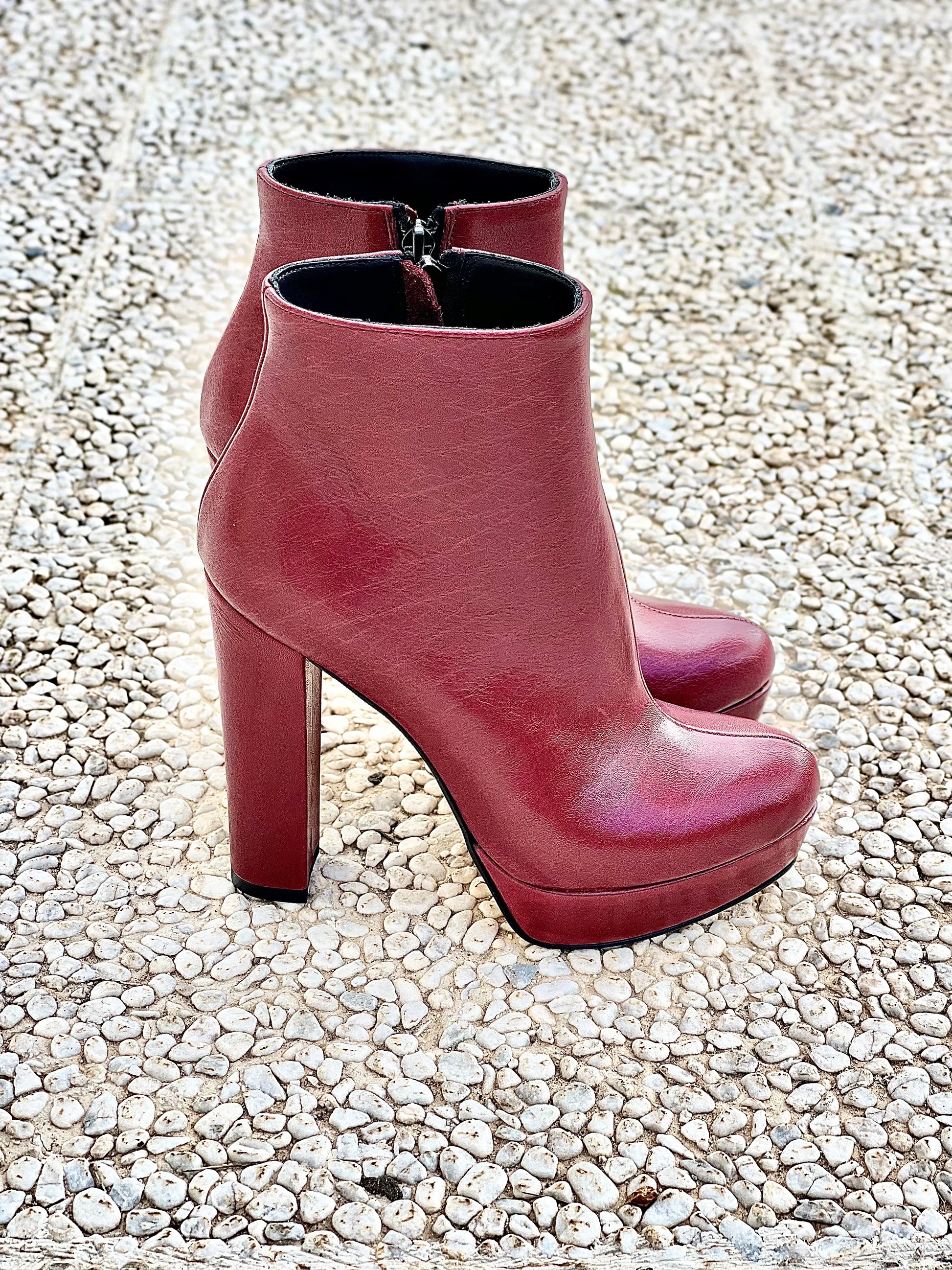 Bottine en cuir, talon de 12 cm et plateforme de 2 cm avec fermeture éclair intérieure.