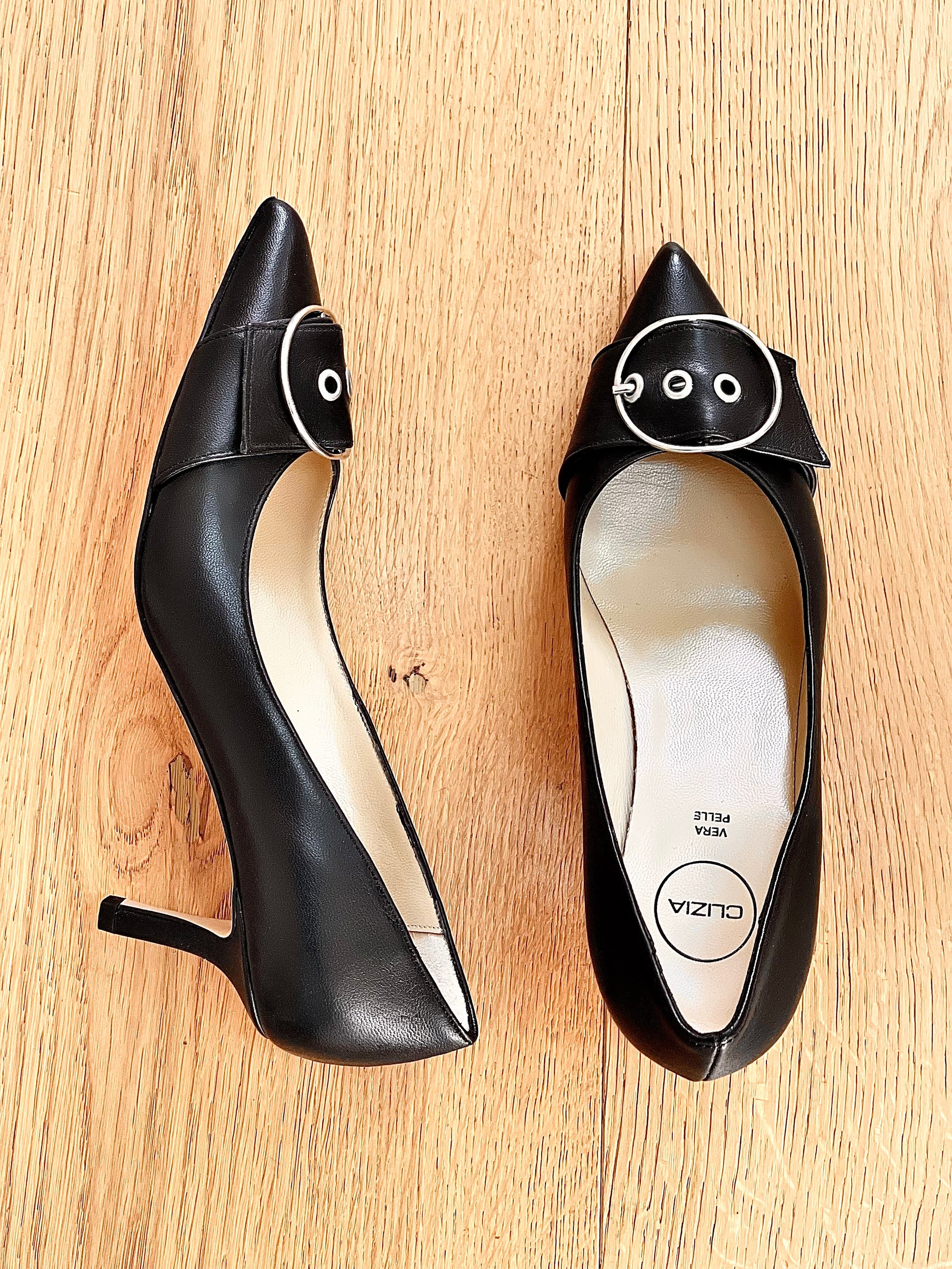 Escarpin à bout plat avec grande boucle ovale sur l'encolure.